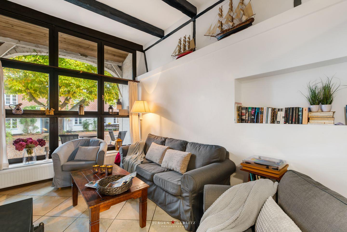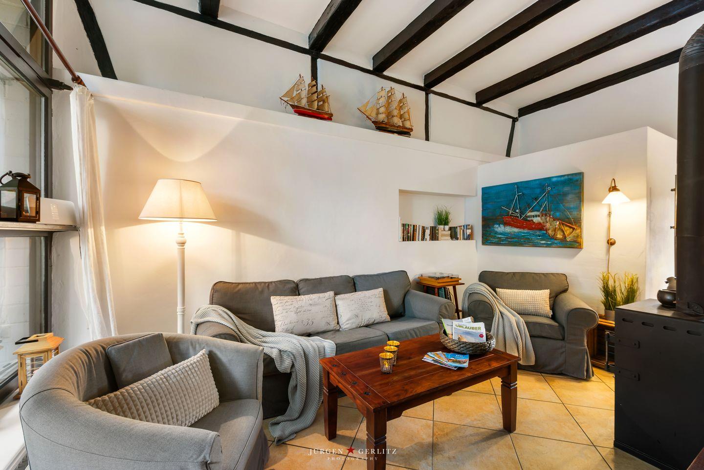 Im gemütlichen Wohnzimmer mit dänischem Kaminofen, Kuschelsofa, Sesseln und Büchern kannst Du mit Deinen Liebsten ausspannen.