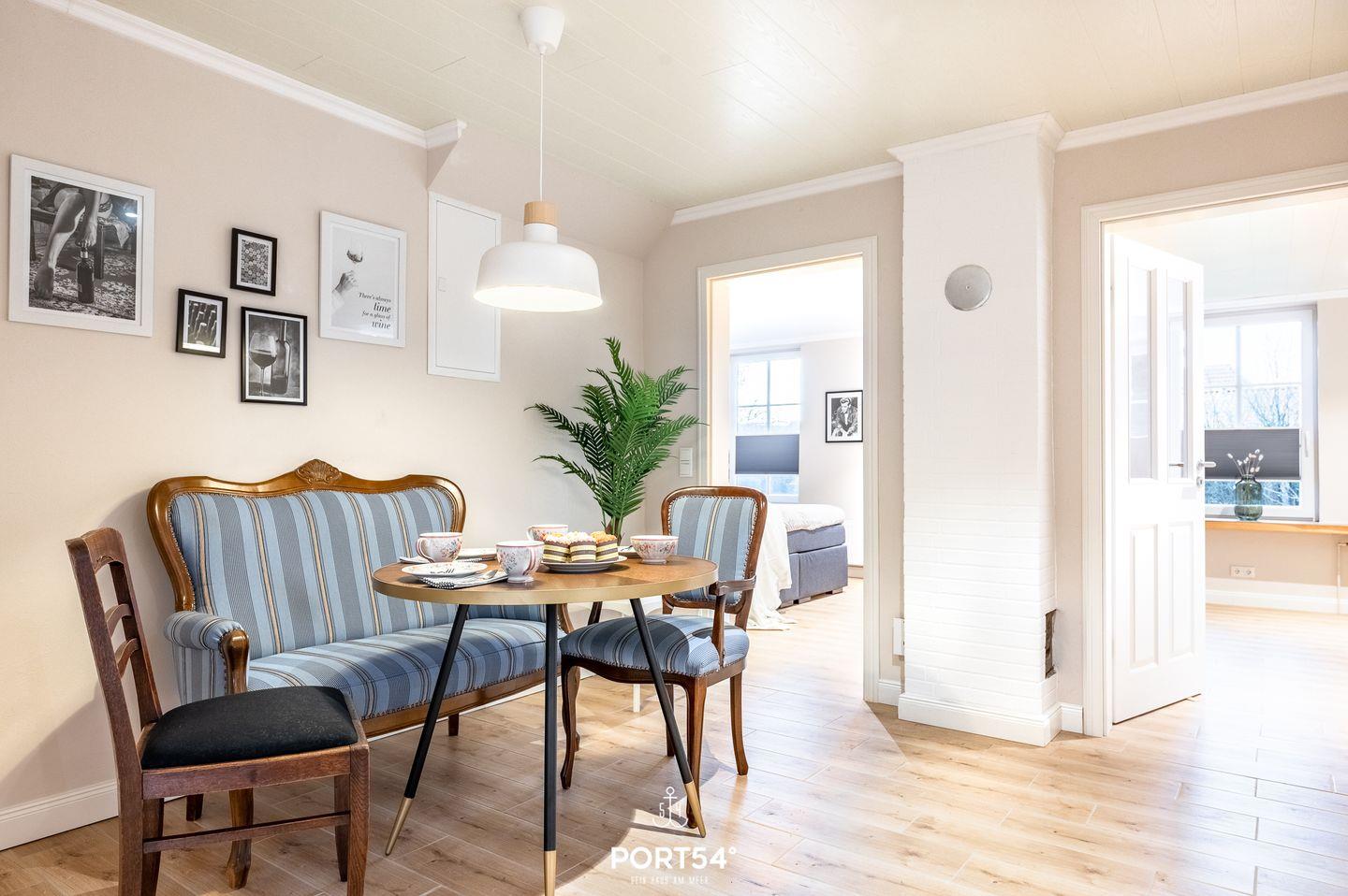 Auf 80 m² bietet Dir die hell eingerichtete Ferienwohnung zwei gemütliche Schlafzimmer, ein Badezimmer, einen offenen Wohn- und Essbereich sowie eine Sonnenterrasse.