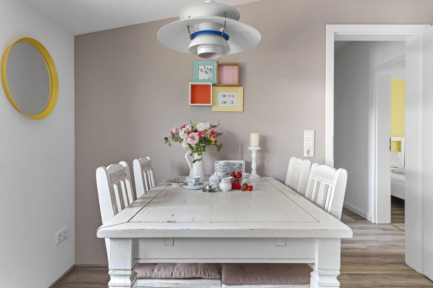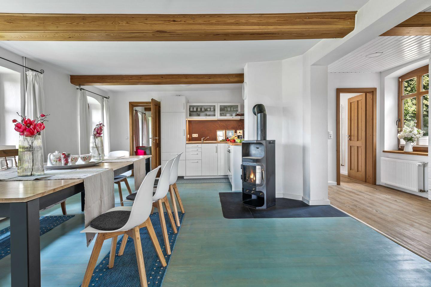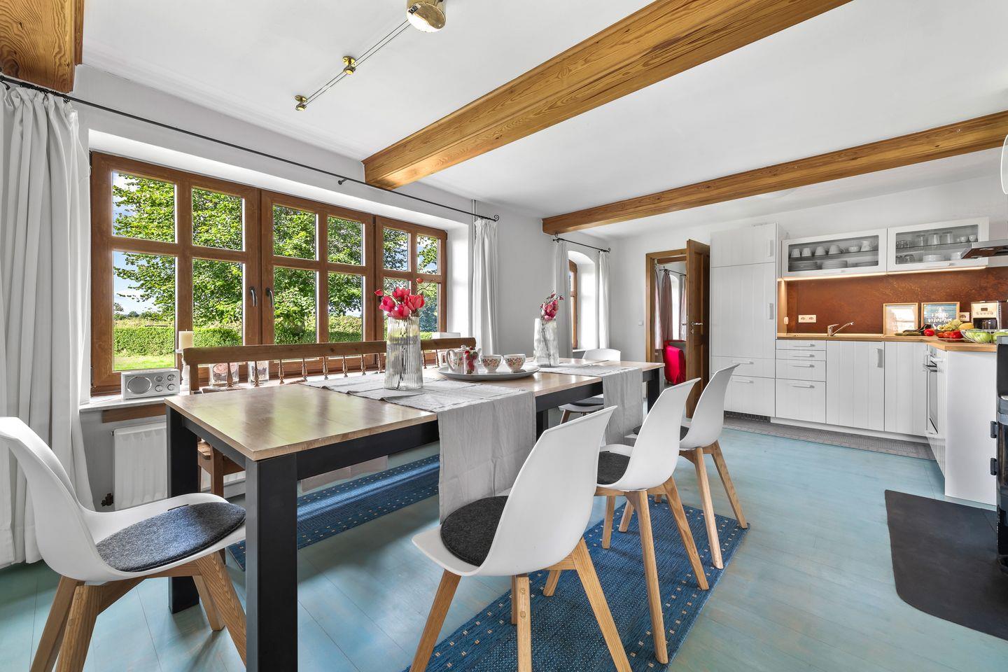 Im kombinierten Küchen- und Essbereich im Erdgeschoss können Sie mit 8 Personen am Esstisch das leckere Essen und die gemeinsame Zeit genießen. Aus dem Wohnzimmer gelangt man direkt auf die Terrasse. Im Obergeschoß gibt es noch eine weitere voll ausgestattete Küche mit Essbereich. Hier finden 4 Personen Platz.
