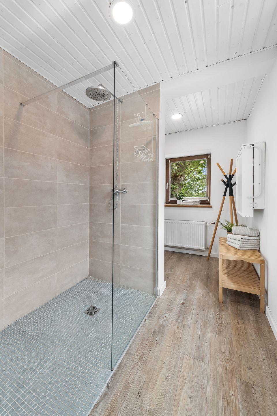 Das Badezimmer im Obergeschoss ist mit einer Dusche, einem Waschbecken, einem Spiegel und einem WC ausgestattet.