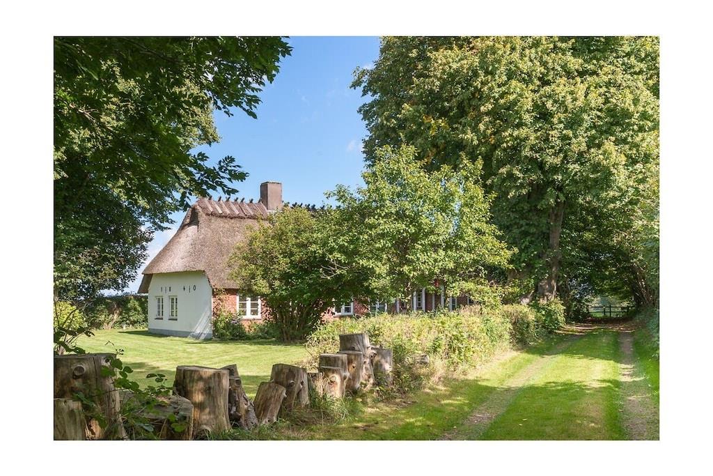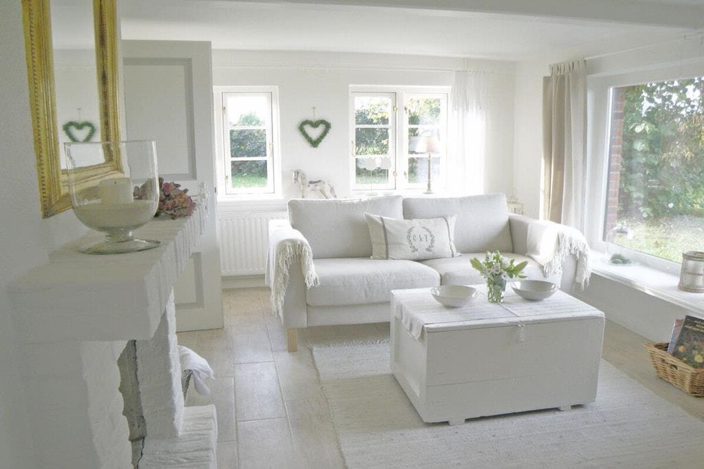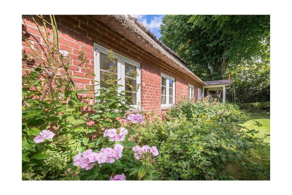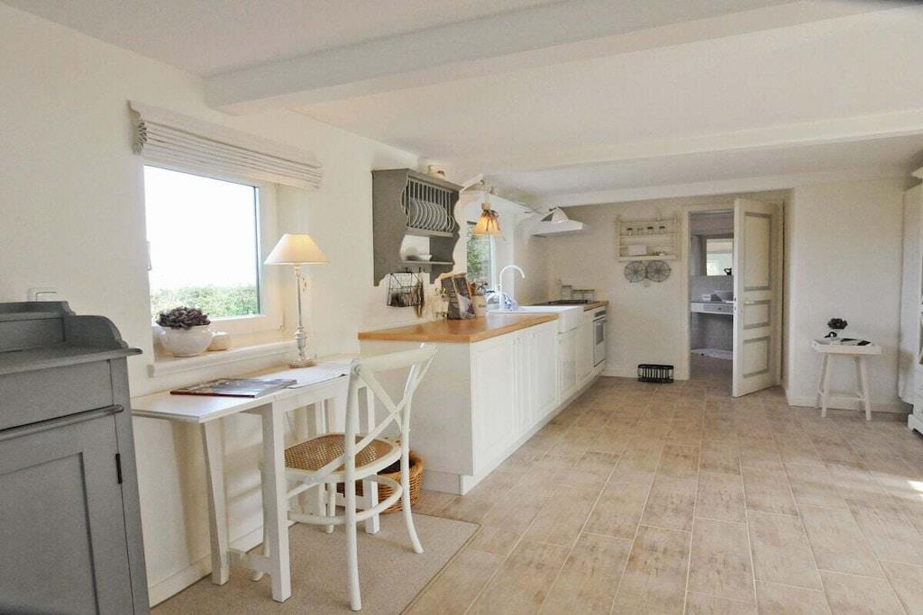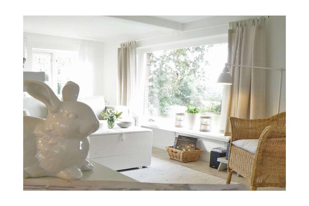 Das Hasenhaus bietet auf 75qm Platz für zu bis 4 Personen. Die individuelle Einrichtung mit vielen liebenswerten Accessoires kombiniert alte, restaurierte Möbel mit modernen Elementen und schafft dadurch eine kuschelige Wohlfühlatmosphäre. Der Wohn– und Essraum mit Kamin und offener Küche ist in Weiß und hellen Pastellfarben gehalten. Die Deckenhöhe in der alten Kate beträgt unter den Balken z.T. weniger als 1,90m. Vom Sofa aus geht der Blick auf die blaue Ostsee, nach Anbruch der Dämmerung wendet man sich dem Kaminfeuer zu und lässt, bei einem Glas Wein, die Eindrücke des Tages auf sich wirken. Die wohnliche Einrichtung jedes der beiden kleinen Schlafzimmer - mit Leinenstoffen, Voilegardinen, Patchworkdecken und schönen Details - ist farblich aufeinander abgestimmt und garantiert erholsamen Schlaf.