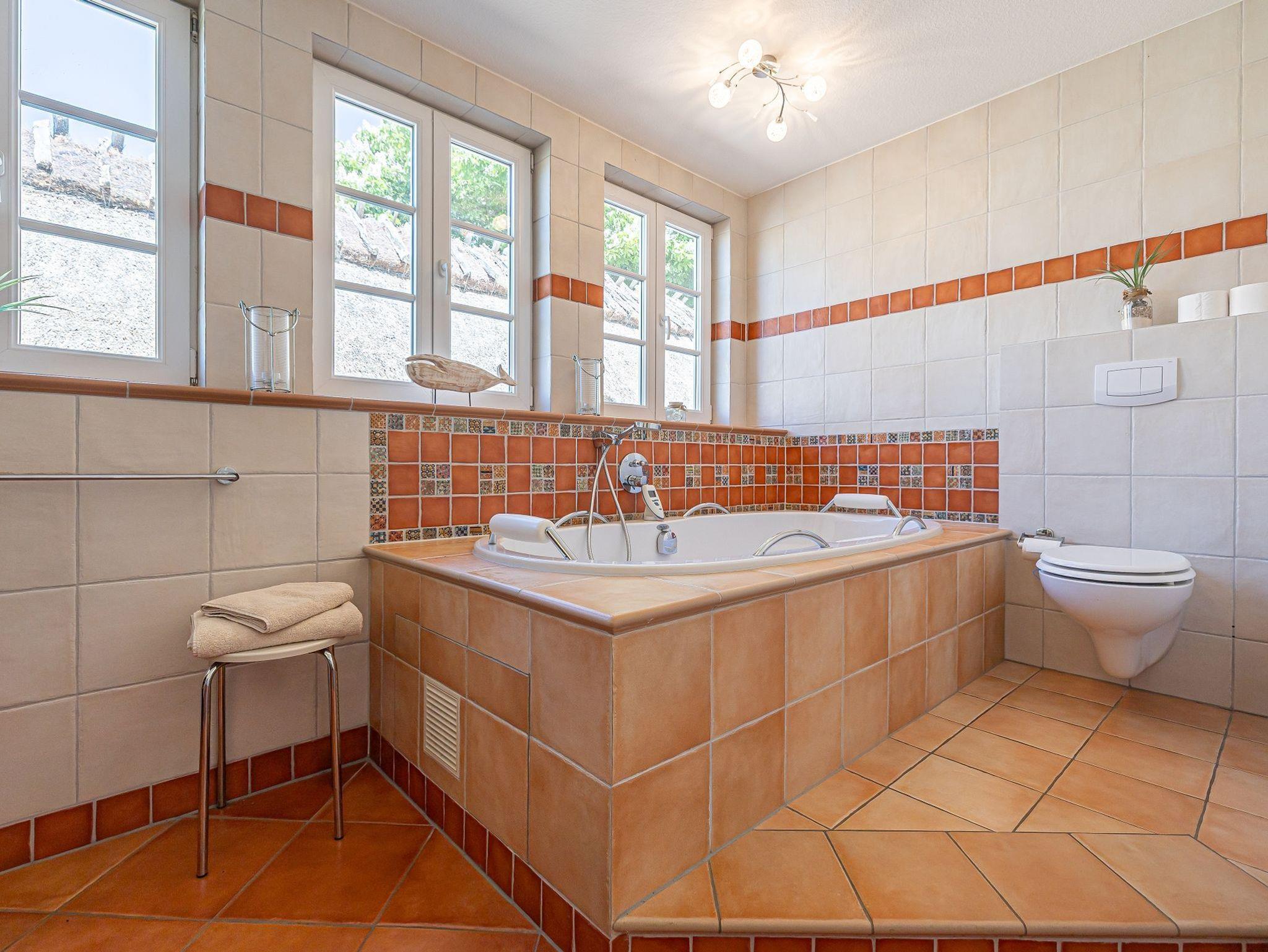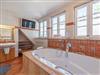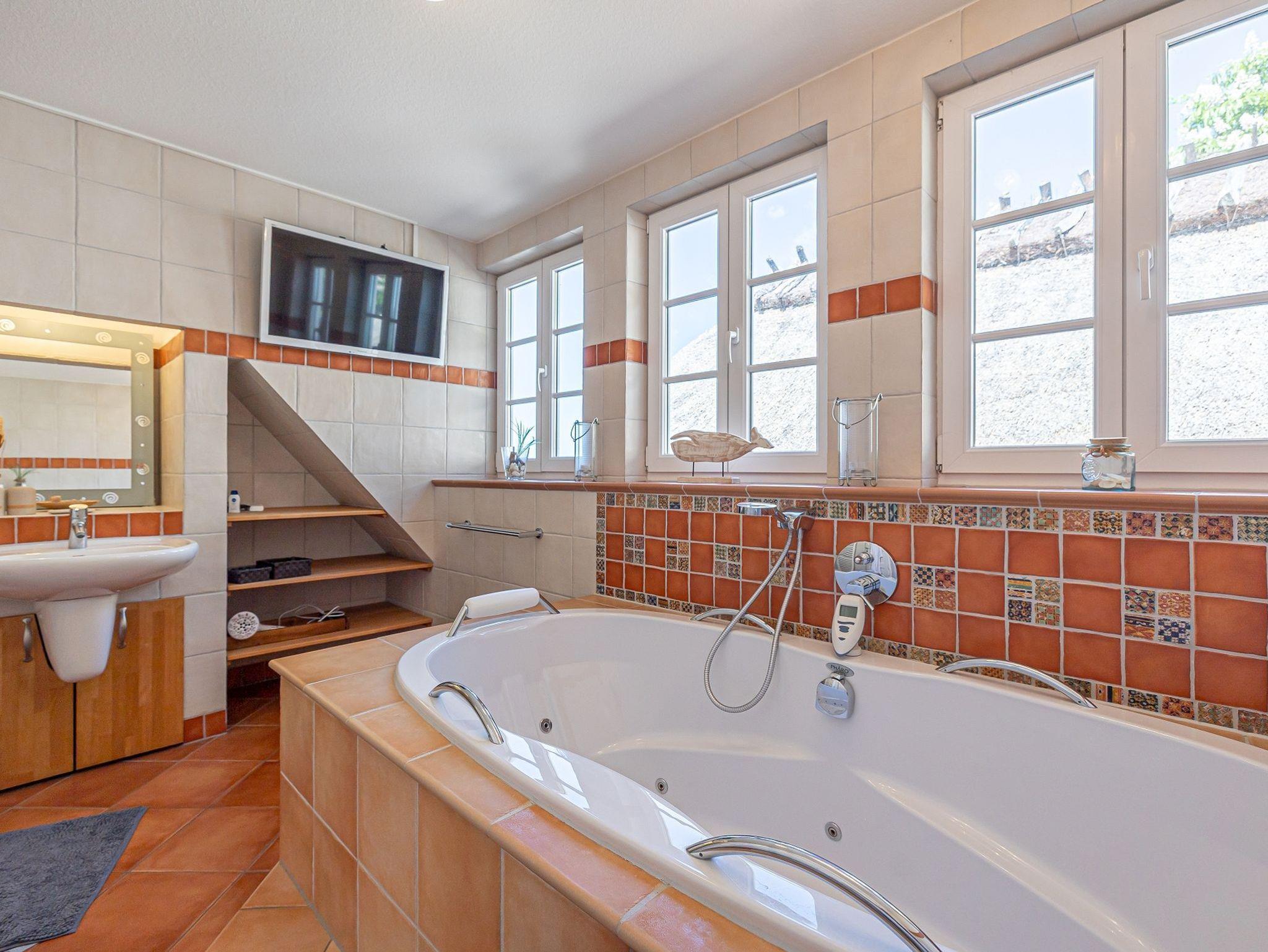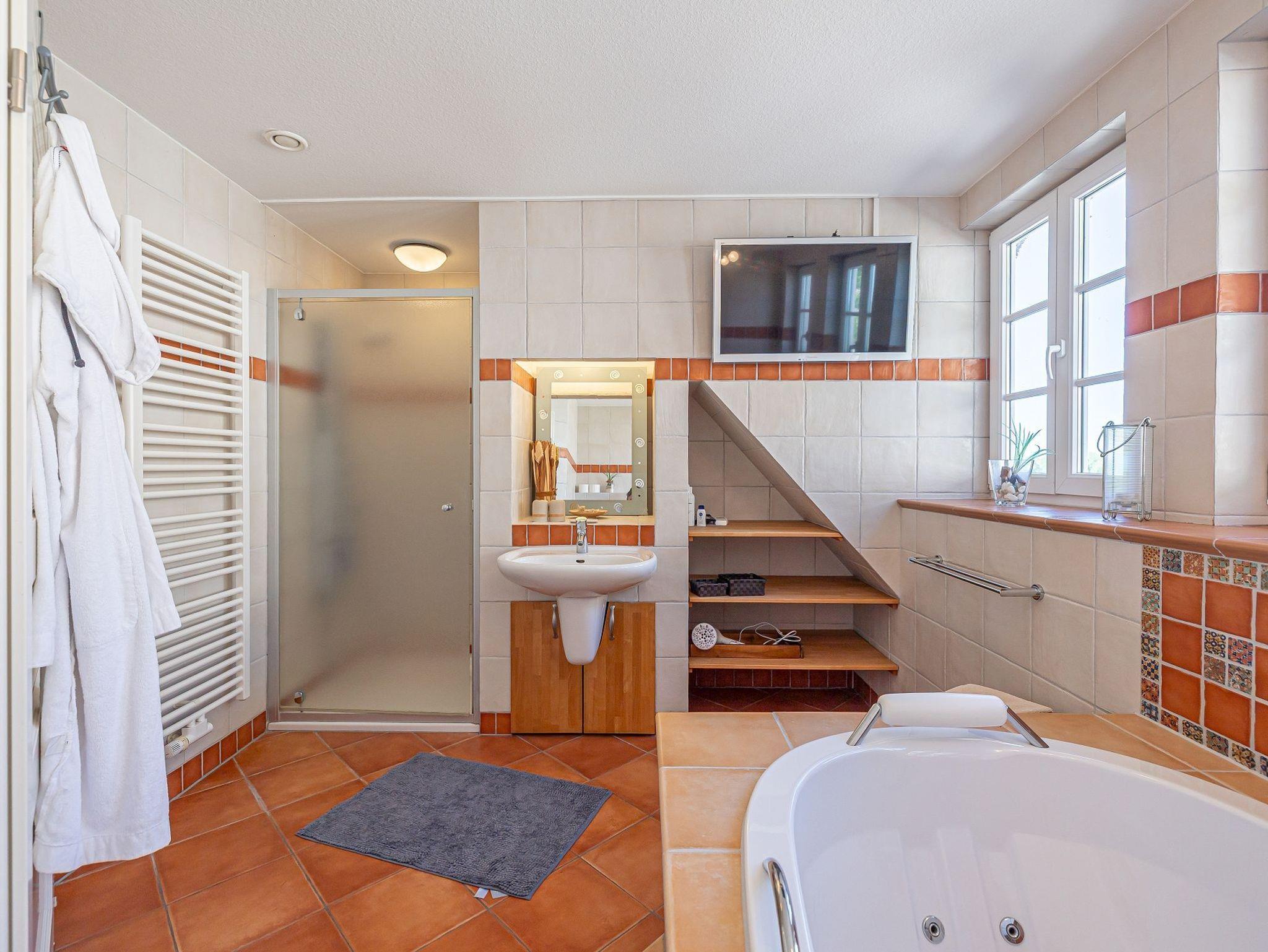 • Großes Badezimmer mit Whirlwanne, Wand-TV und extra großer Erlebnisdusche; Handtücher, Bademäntel inklusive