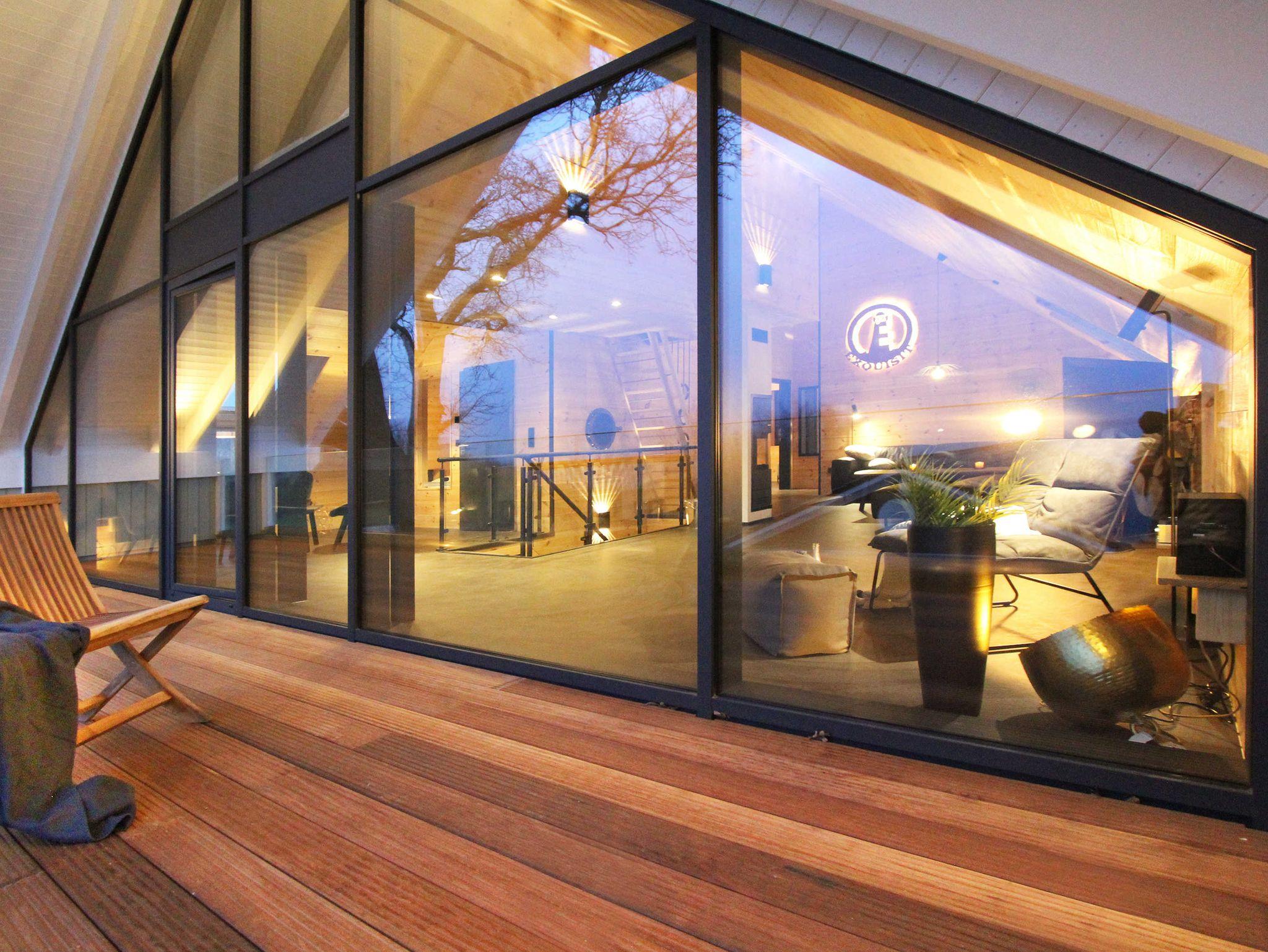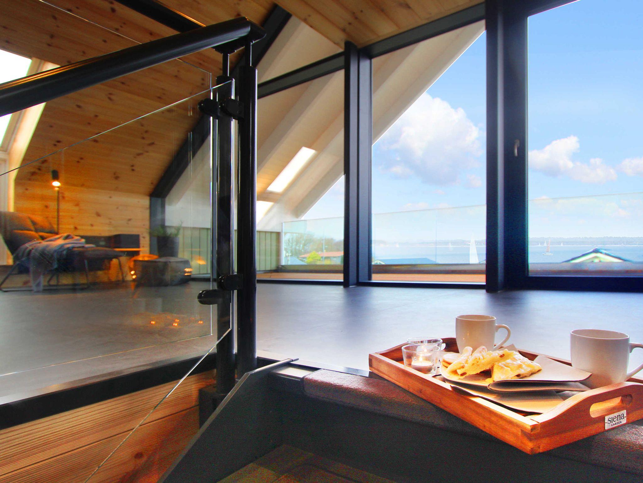 In der unteren Etage ist ein großer Essbereich inkl. großer Südterrasse und in der oberen Etage ein großer Wohnbereich mit großem Balkon nach Dänemark.