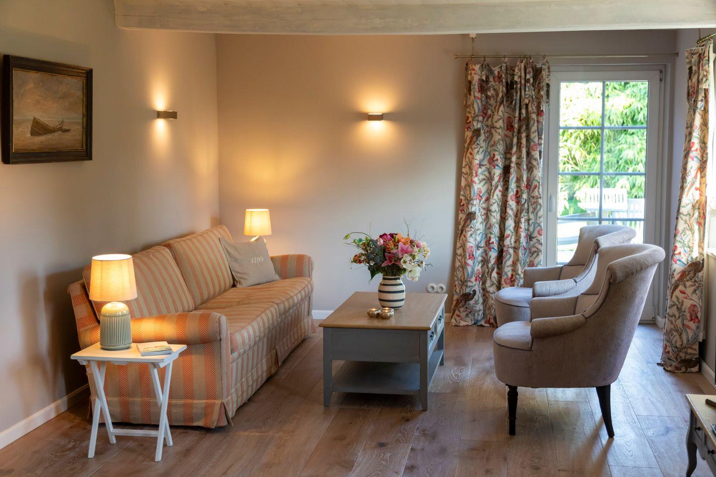 Eine der Haushälften verfügt über ca. 124 m² Wohnfläche. Das gemütlich eingerichtete Wohn- und Esszimmer bietet direkten Zugang zur Südterrasse, von der aus sich ein wunderbarer Blick über die angrenzenden Felder eröffnet. Der großzügige Südgarten steht exklusiv zur Verfügung und lädt mit Grill und Sitzmöglichkeiten zu entspannten Stunden im Freien ein. An kühleren Tagen sorgt ein dänischer Kamin für eine hyggelige Atmosphäre, während Sie Ihre Lieblingsserien auf dem Flachbildfernseher streamen können.