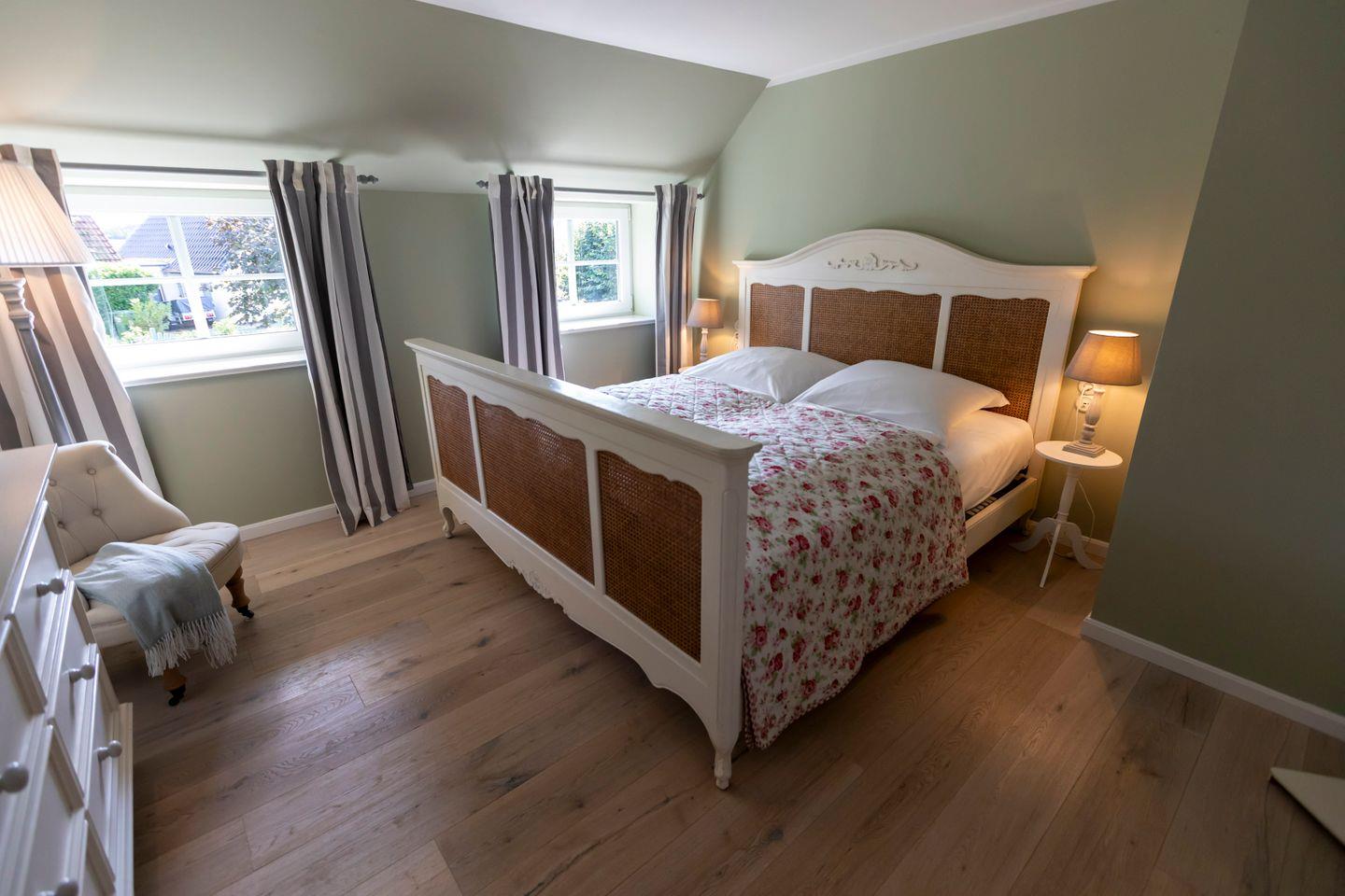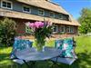 Ein Schlafzimmer ist mit einem Doppelbett (180 × 200 cm) ausgestattet. Das zweite Schlafzimmer verfügt über ein ausziehbares Tagesbett (80 × 200 cm, ausgezogen 160 × 200 cm) sowie über eine Hochebene mit zwei Bodenmatratzen (70 × 200 cm) – ideal für Kinder. Auch hier sorgen Verdunkelungsmöglichkeiten für erholsame Nächte. Gegenüber der Haustür befindet sich ein eigener, abgegrenzter Garten mit windgeschützter Süd-West-Terrasse, von der aus Sie den Blick über die umliegende Landschaft schweifen lassen können. Ein Grill steht ebenfalls zur Verfügung. In dieser Haushälfte sind auch vierbeinige Familienmitglieder herzlich willkommen.