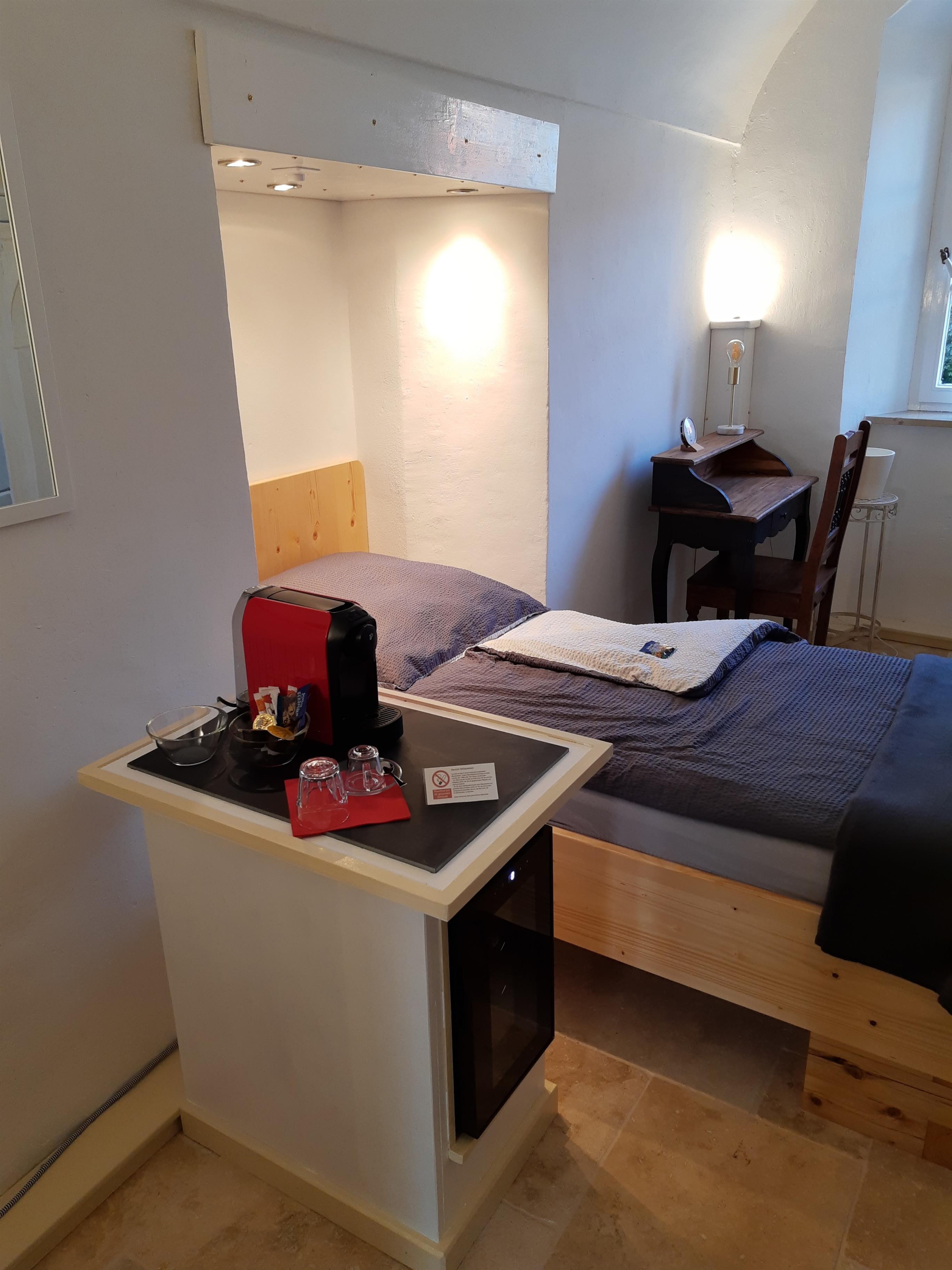 Das Zimmer verfügt über eine Minibar mit Erfrischungsgetränken und einer Espressomaschine. Der Konsum hier ist kostenlos / inklusive, soweit alkoholfrei. Die Minibar wird täglich vom Zimmerservice gefüllt.