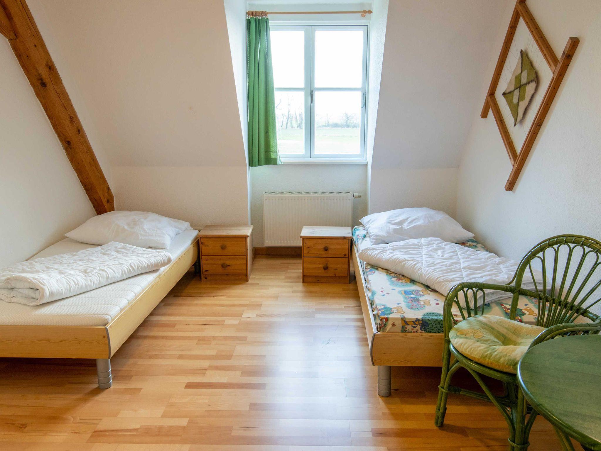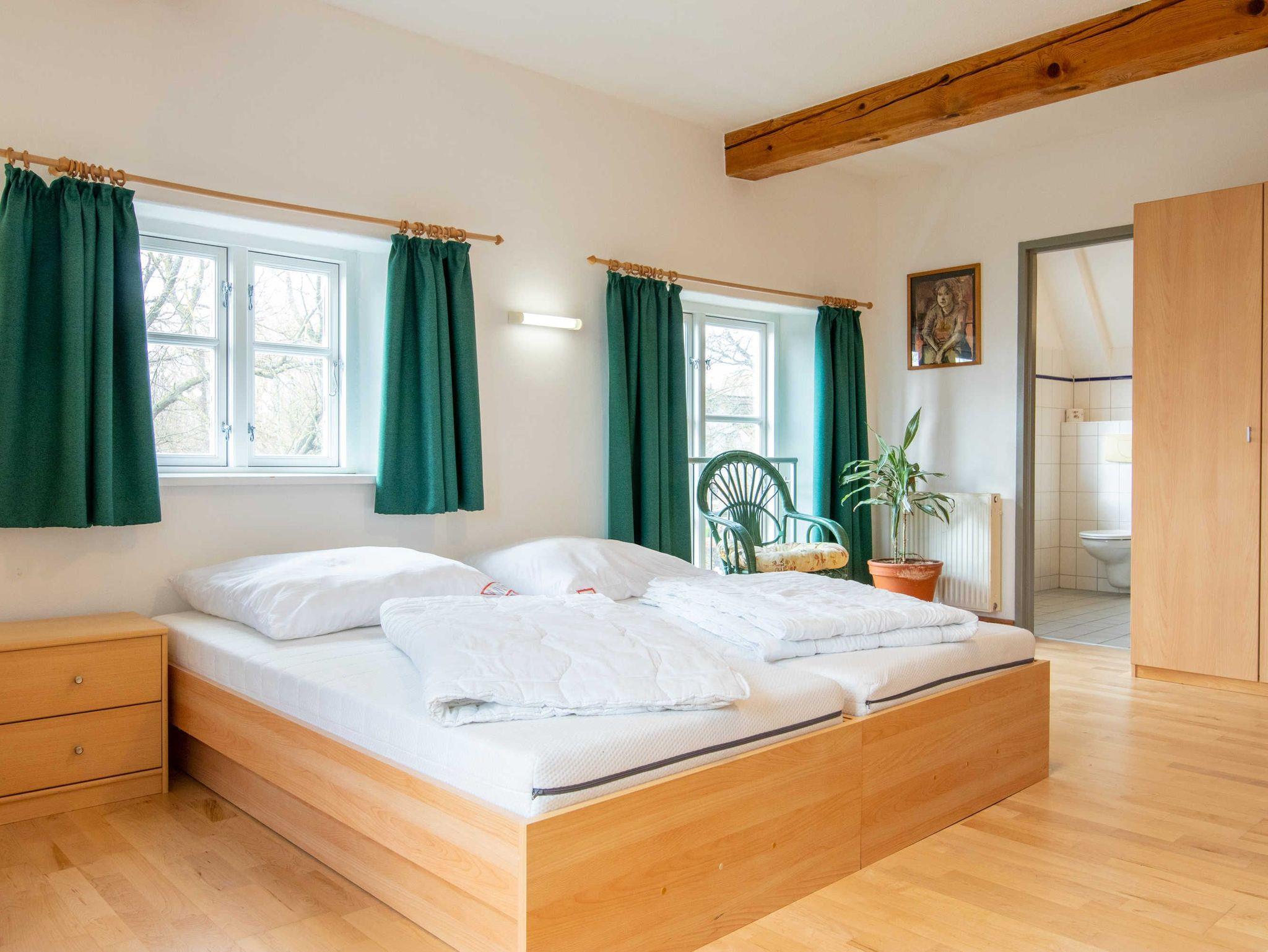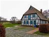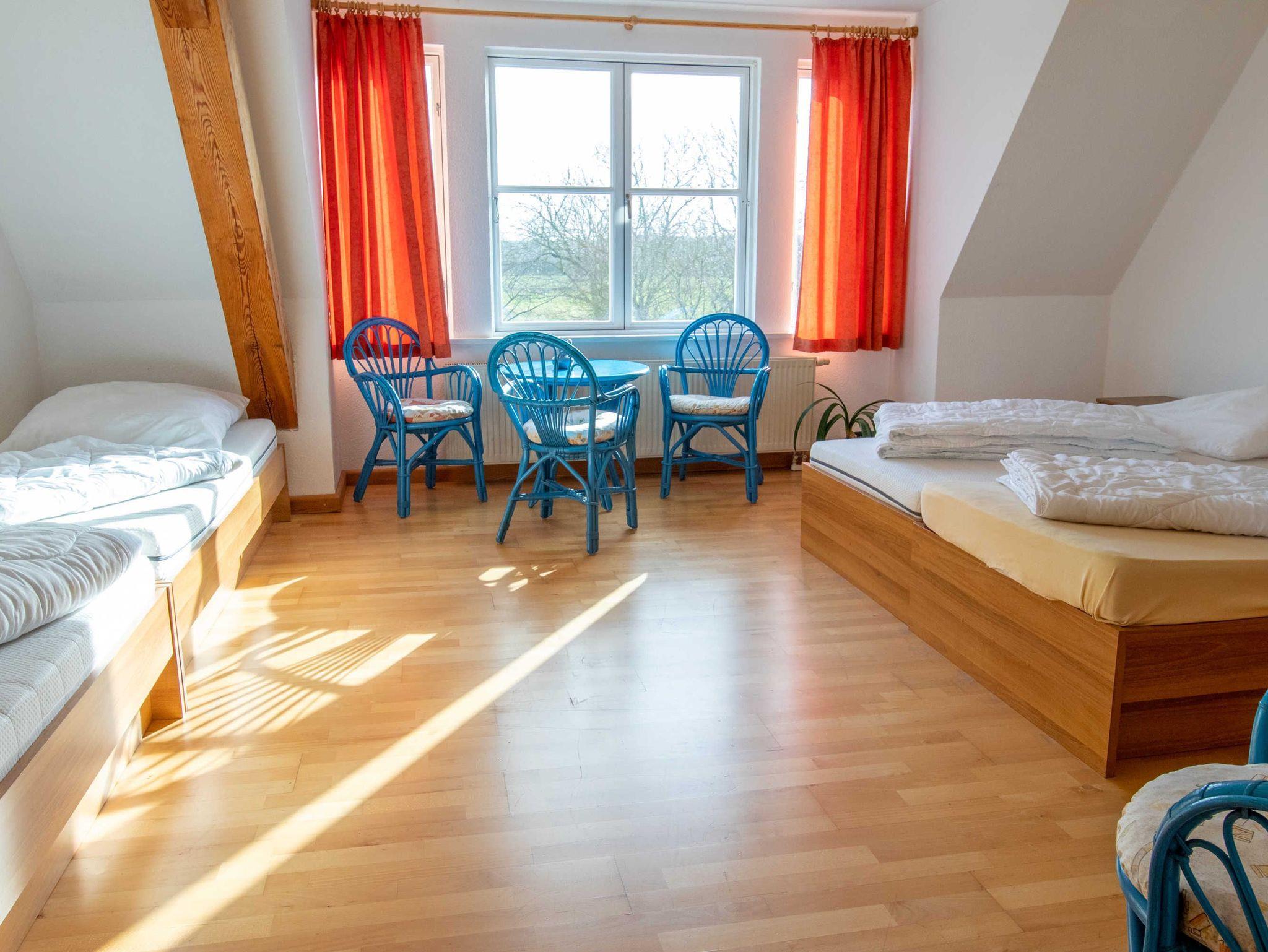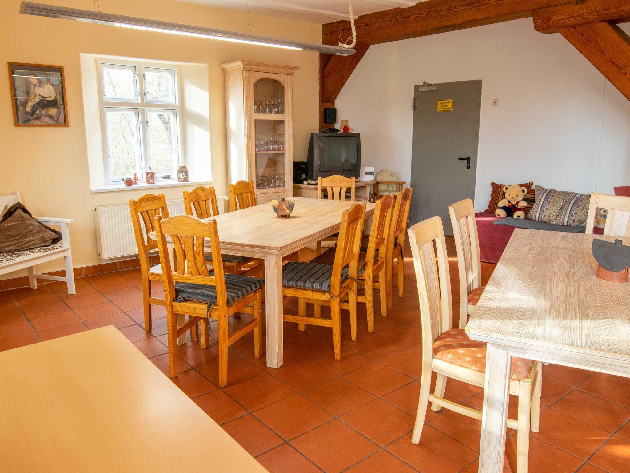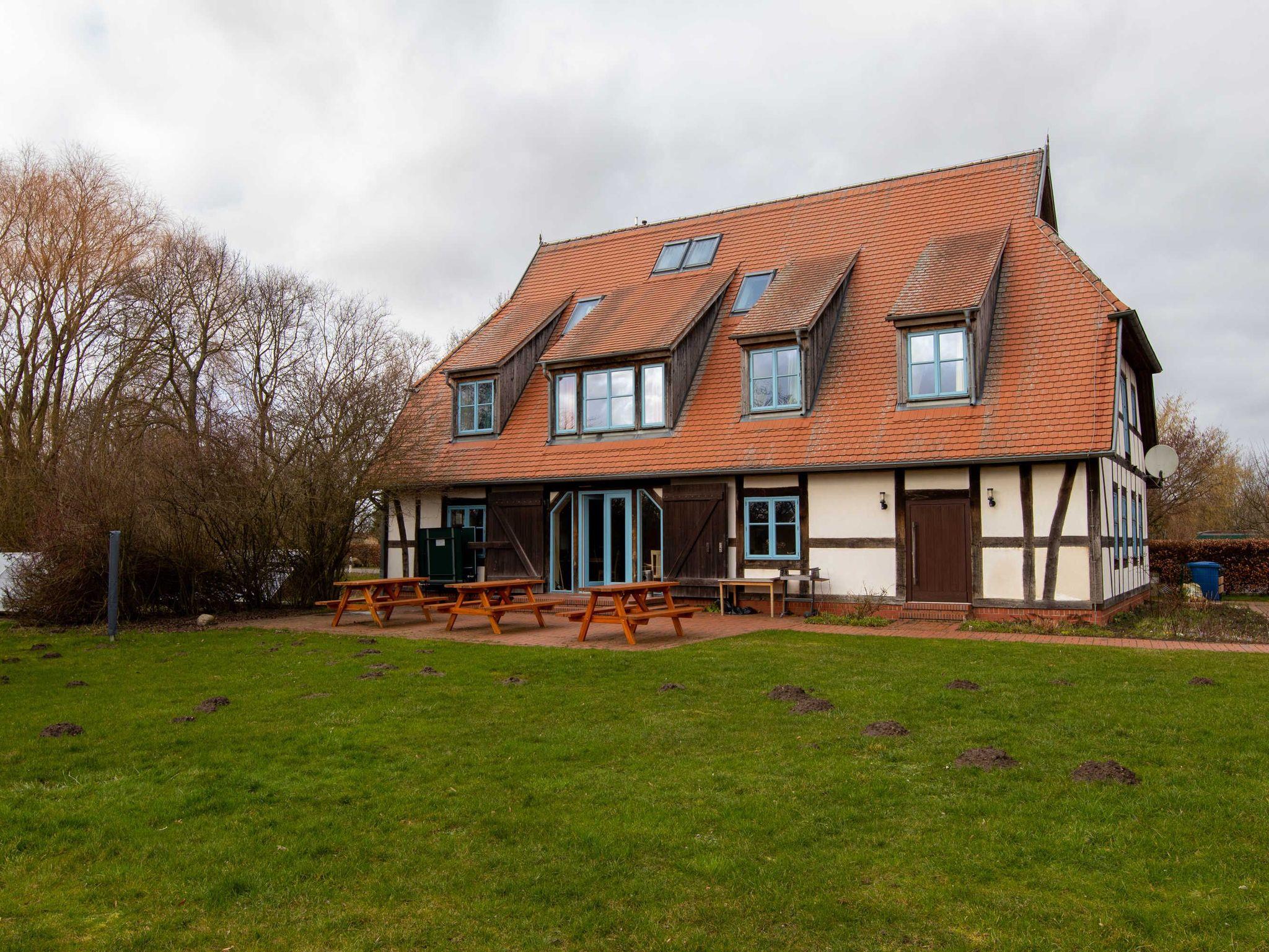 Im 3-stöckigen 170 m² großen mit Lehm ausgefachteten Fachwerkhaus ist Platz für bis zu 14 Personen. Die vordere Eingangstür ist über eine Rampe erreichbar. Im Erdgeschoss des Ferienhauses befindet sich der große Aufenthaltsraum mit vielen Sitzmöglichkeiten und einem TV. Die offene Küche ist mit einem Herd, Backofen, Kühlschrank und einer Spülmaschine ausgestattet. Geschirr, Besteck, eine Kaffeemaschine und ein Wasserkocher sind ebenfalls vorhanden. 2 Gäste-WC vervollständigen diesen Bereich. Außerdem befindet sich im Erdgeschoss ein behindertengerechtes Schlafzimmer (zwei getrennte Betten, 90x200cm) mit rollstuhlgerechtem Badezimmer, welches mit einer befahrbaren Dusche, Duschsitz, Waschbecken und WC eingerichtet ist. Über eine Treppe erreicht man die erste Etage. Dort befinden sich die vier weiteren Schlafzimmer (1x Zweibettzimmer, 2x Dreibettzimmer, 1x Vierbettzimmer, jeweils 90x200). Alle Schlafzimmer verfügen über einen Kleiderschrank, Tisch und Stühle. Zu jedem Schlafzimmer gehört ein Bad mit Dusche, Waschbecken und WC, zwei davon sind über den Flur erreichbar. Ein Zustellbett steht zusätzlich zur Verfügung. Im Dachgeschoss gibt es einen weiteren Aufenthaltsbereich mit Sitzmöglichkeiten, Büchern und Flachbild-TV. Am hinteren Ausgang schließt sich eine Terrasse mit Holzbänken, Grillmöglichkeit, Feuerstelle und eine große Wiese an.