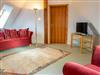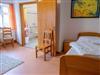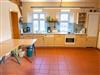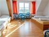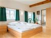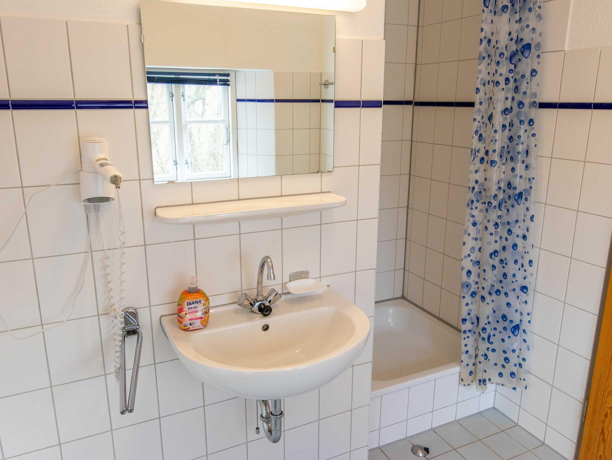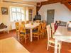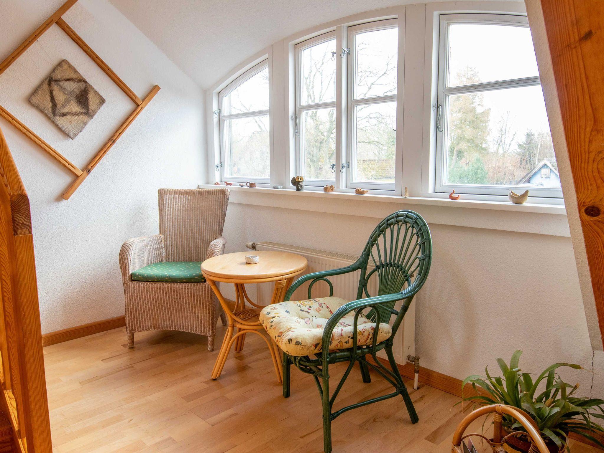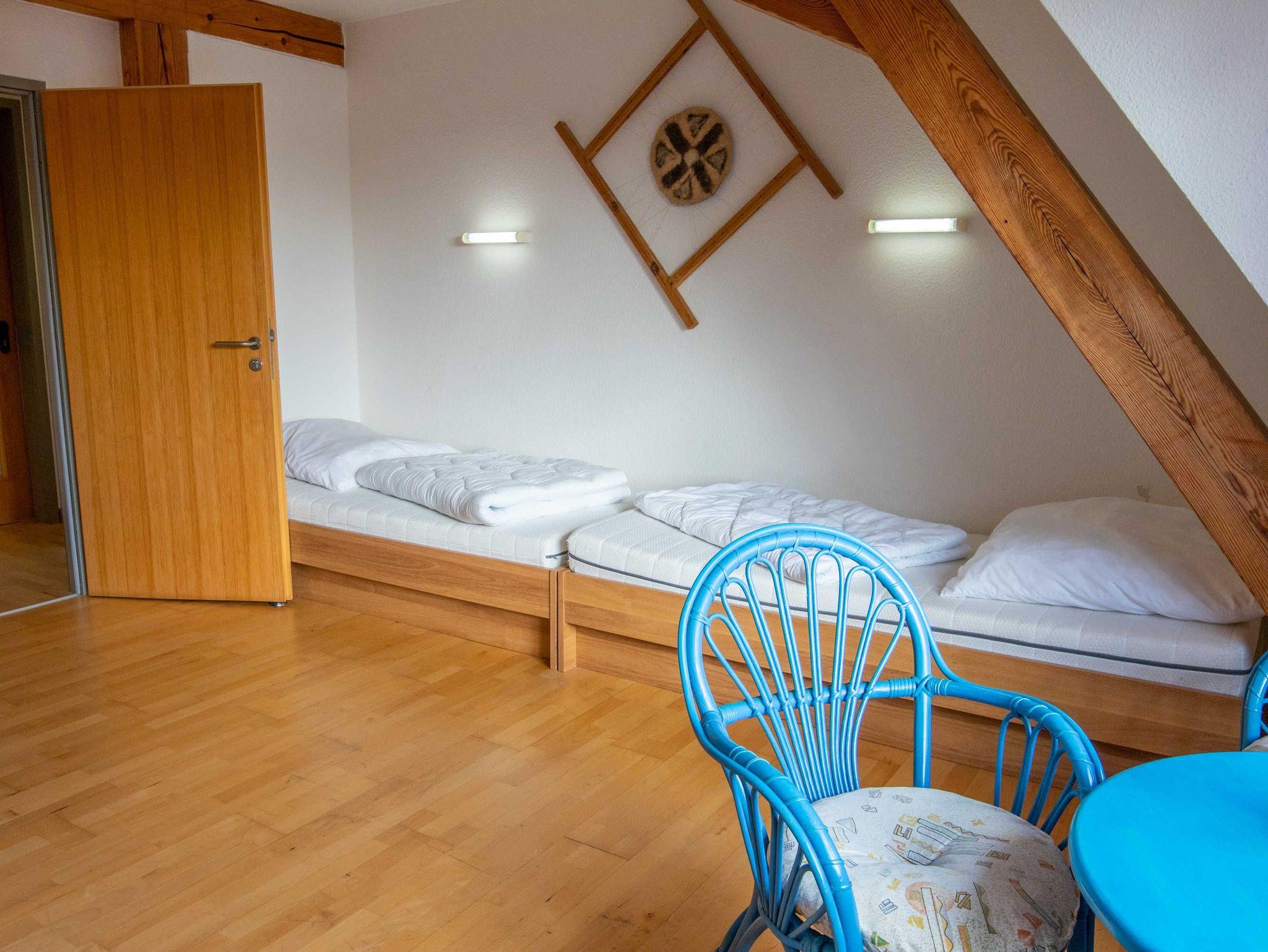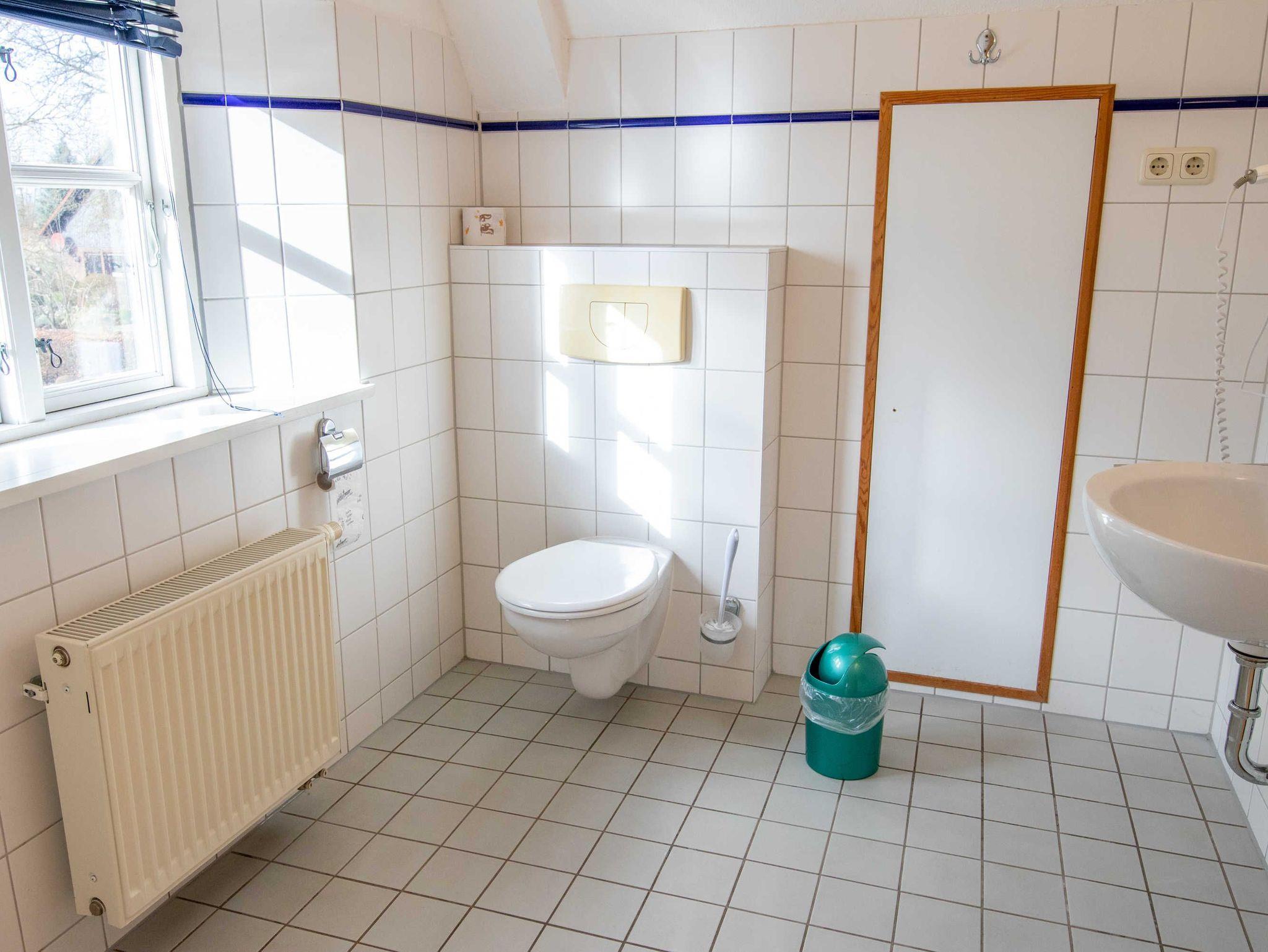 Im 3-stöckigen 170 m² großen mit Lehm ausgefachteten Fachwerkhaus ist Platz für bis zu 14 Personen. Die vordere Eingangstür ist über eine Rampe erreichbar. Im Erdgeschoss des Ferienhauses befindet sich der große Aufenthaltsraum mit vielen Sitzmöglichkeiten und einem TV. Die offene Küche ist mit einem Herd, Backofen, Kühlschrank und einer Spülmaschine ausgestattet. Geschirr, Besteck, eine Kaffeemaschine und ein Wasserkocher sind ebenfalls vorhanden. 2 Gäste-WC vervollständigen diesen Bereich. Außerdem befindet sich im Erdgeschoss ein behindertengerechtes Schlafzimmer (zwei getrennte Betten, 90x200cm) mit rollstuhlgerechtem Badezimmer, welches mit einer befahrbaren Dusche, Duschsitz, Waschbecken und WC eingerichtet ist. Über eine Treppe erreicht man die erste Etage. Dort befinden sich die vier weiteren Schlafzimmer (1x Zweibettzimmer, 2x Dreibettzimmer, 1x Vierbettzimmer, jeweils 90x200). Alle Schlafzimmer verfügen über einen Kleiderschrank, Tisch und Stühle. Zu jedem Schlafzimmer gehört ein Bad mit Dusche, Waschbecken und WC, zwei davon sind über den Flur erreichbar. Ein Zustellbett steht zusätzlich zur Verfügung. Im Dachgeschoss gibt es einen weiteren Aufenthaltsbereich mit Sitzmöglichkeiten, Büchern und Flachbild-TV. Am hinteren Ausgang schließt sich eine Terrasse mit Holzbänken, Grillmöglichkeit, Feuerstelle und eine große Wiese an.