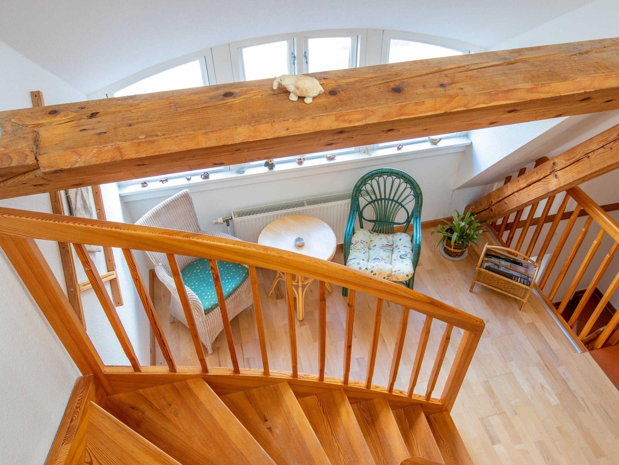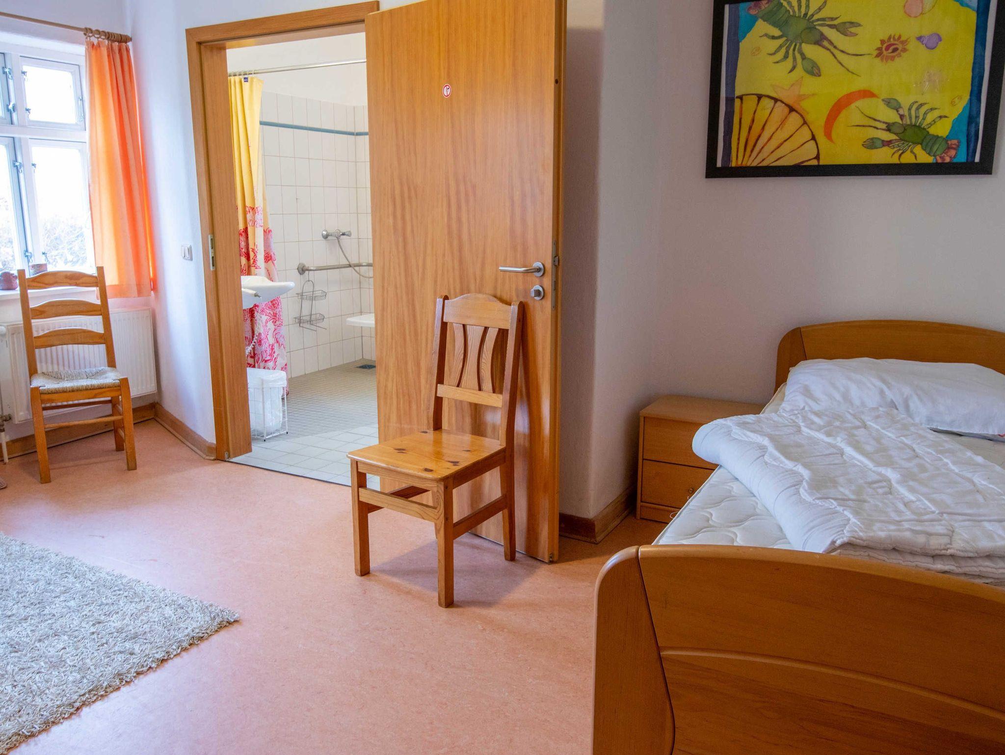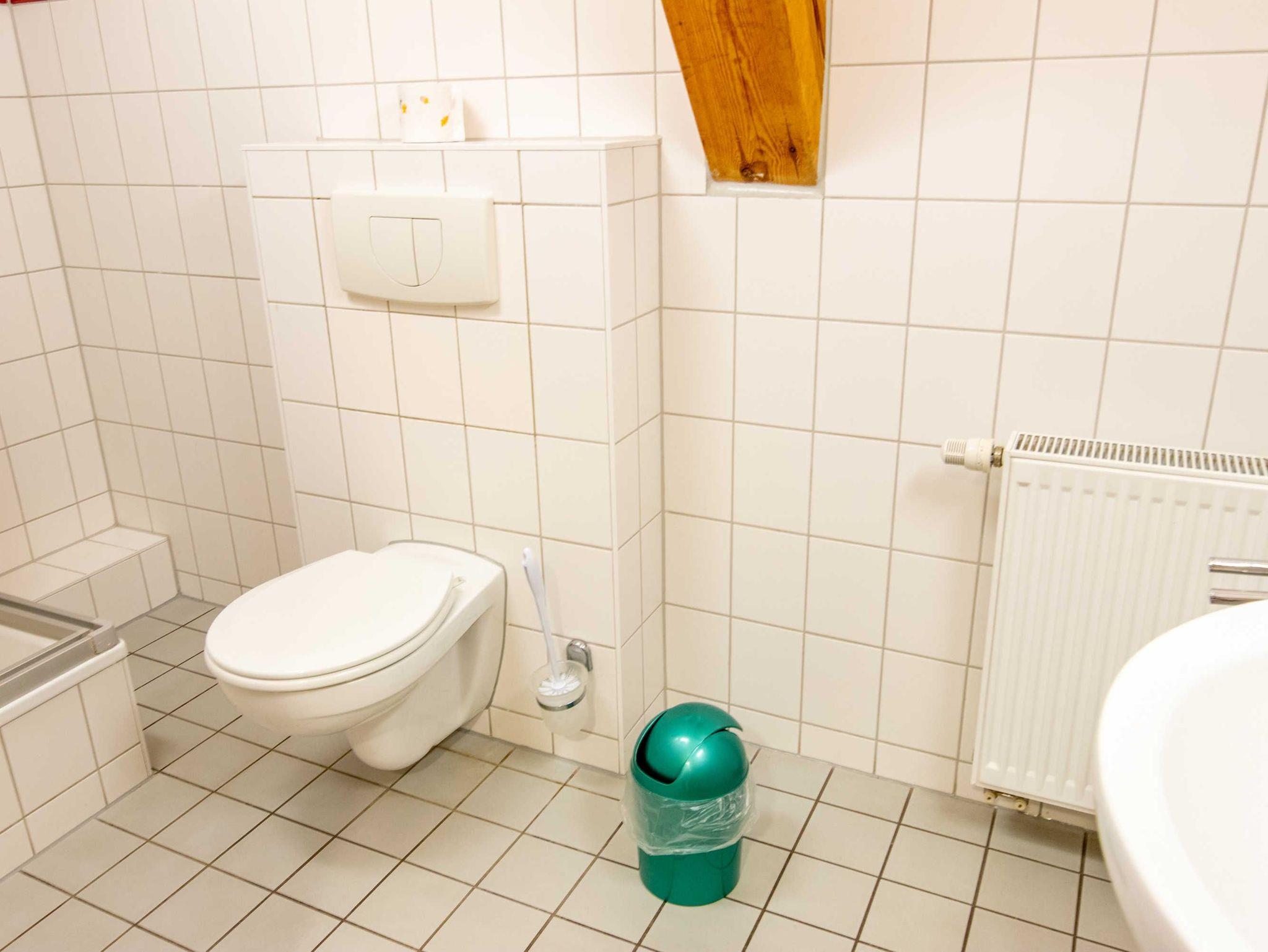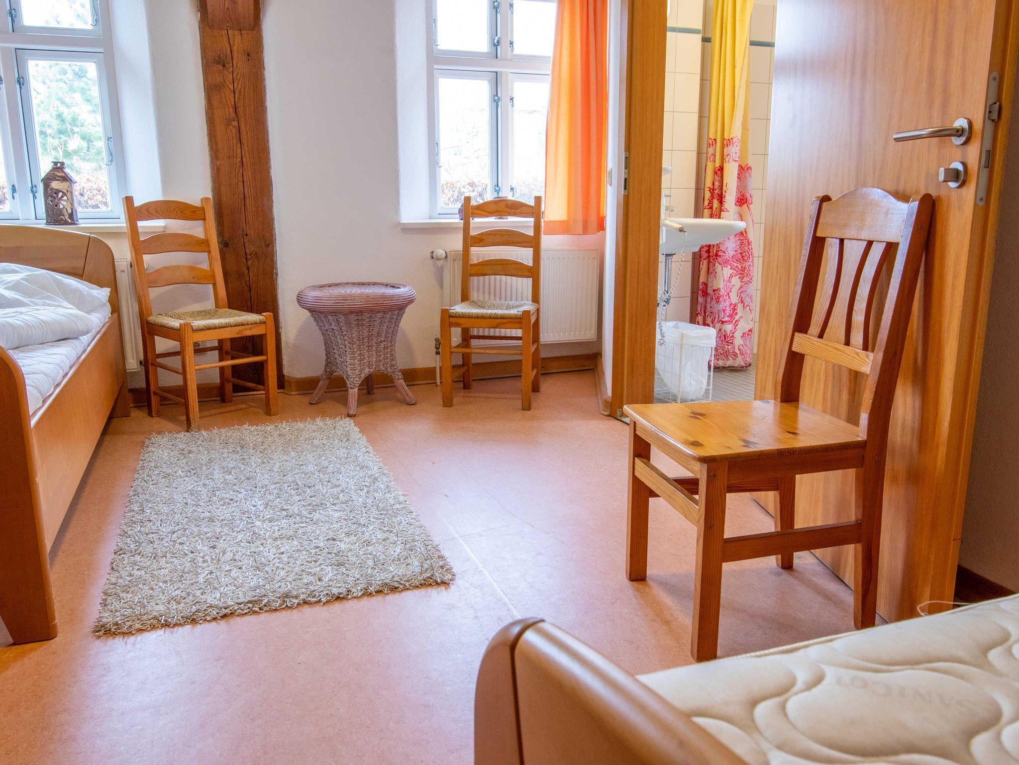 Im 3-stöckigen 170 m² großen mit Lehm ausgefachteten Fachwerkhaus ist Platz für bis zu 14 Personen. Die vordere Eingangstür ist über eine Rampe erreichbar. Im Erdgeschoss des Ferienhauses befindet sich der große Aufenthaltsraum mit vielen Sitzmöglichkeiten und einem TV. Die voll ausgestattete offene Küche mit einem Herd, Backofen, Kühlschrank und einer Spülmaschine. 2 Gäste-WC vervollständigen diesen Bereich. Außerdem befindet sich im Erdgeschoss ein behindertengerechtes Schlafzimmer (zwei getrennte Betten, 90x200cm) mit rollstuhlgerechtem Badezimmer, welches mit einer befahrbaren Dusche, Duschsitz, Waschbecken und WC eingerichtet ist. Über eine Treppe erreicht man die erste Etage. Dort befinden sich die vier weiteren Schlafzimmer (1x Zweibettzimmer, 2x Dreibettzimmer, 1x Vierbettzimmer, jeweils 90x200). Zu jedem Schlafzimmer gehört ein Bad mit Dusche, Waschbecken und WC, zwei davon sind über den Flur erreichbar. Ein Zustellbett steht zusätzlich zur Verfügung. Im Dachgeschoss gibt es einen weiteren Aufenthaltsbereich mit Sitzmöglichkeiten, Büchern und Flachbild-TV. Am hinteren Ausgang schließt sich eine Terrasse mit Holzbänken, Grillmöglichkeit, Feuerstelle und eine große Wiese an.
