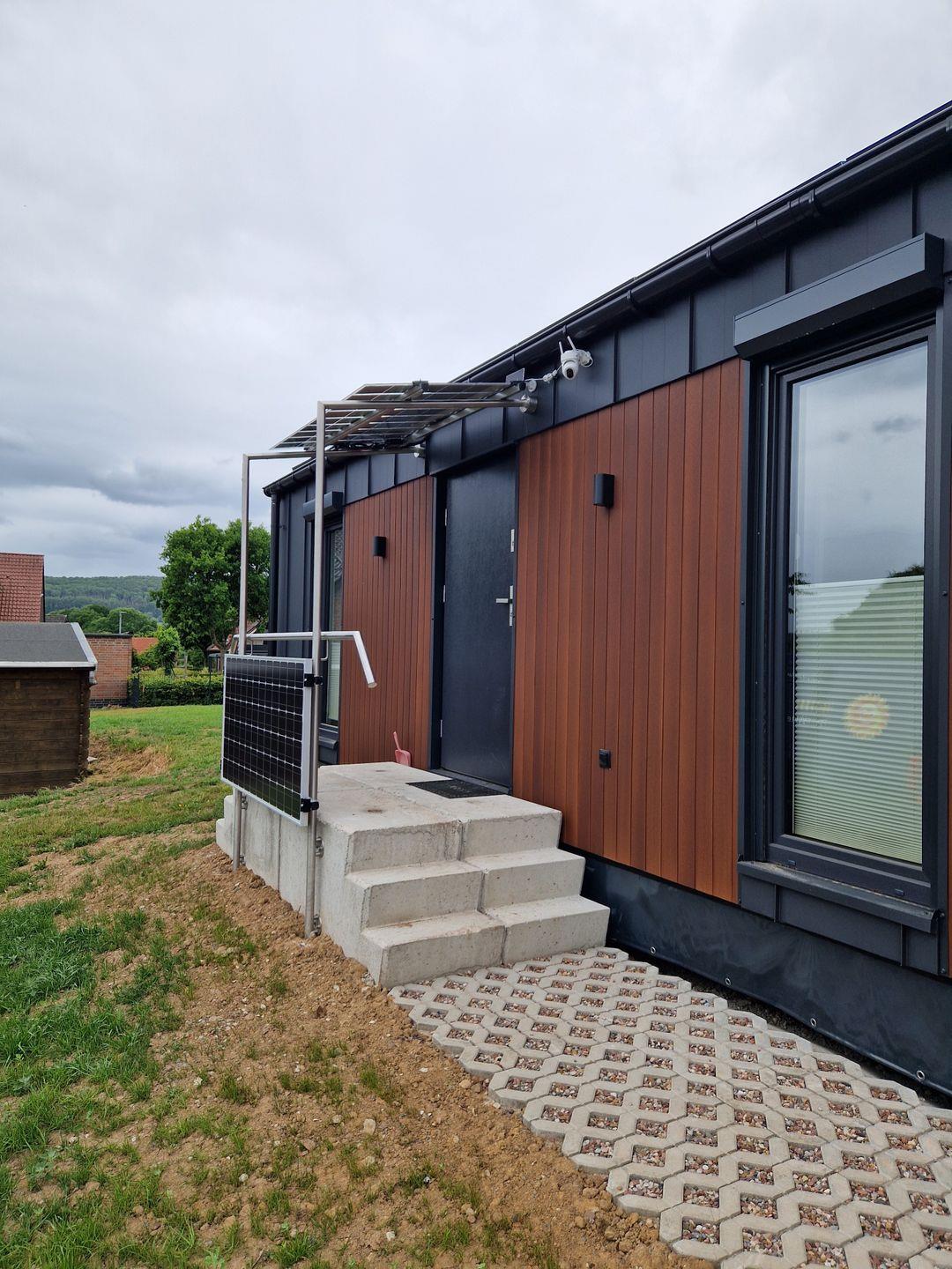 Am Tiny House befinden sich zwei Stellplätze und eine E-Ladesäule, die gerne benutzt