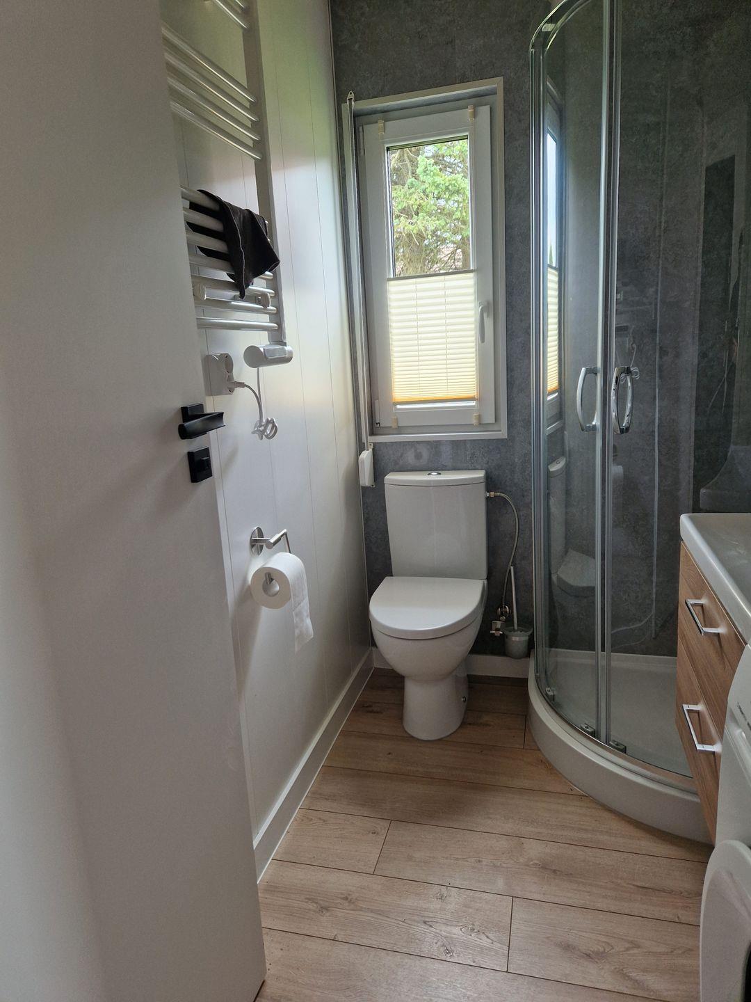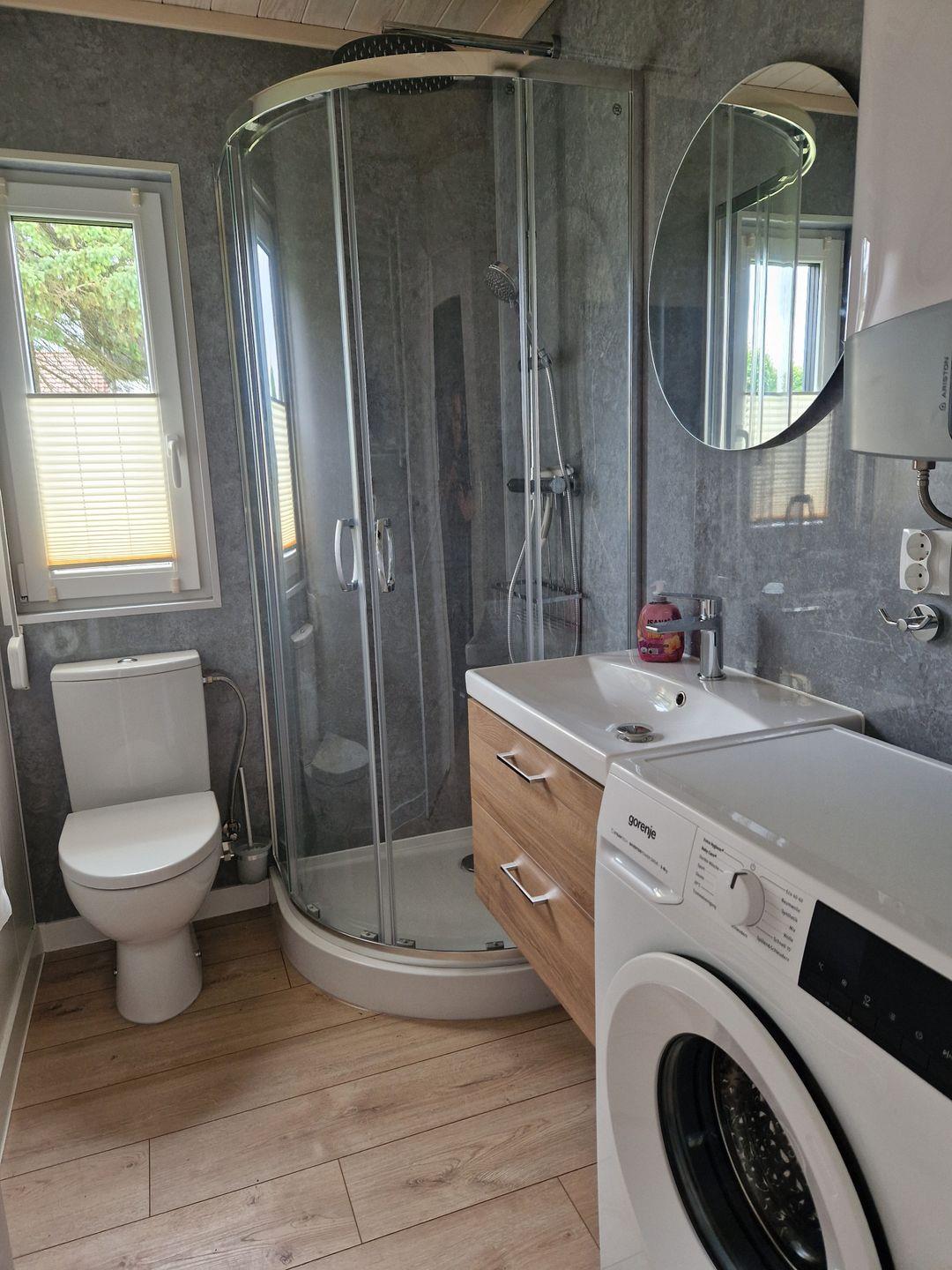 Das kleine Badezimmer ist modern und zweckmäßig mit Dusche und Waschmaschine