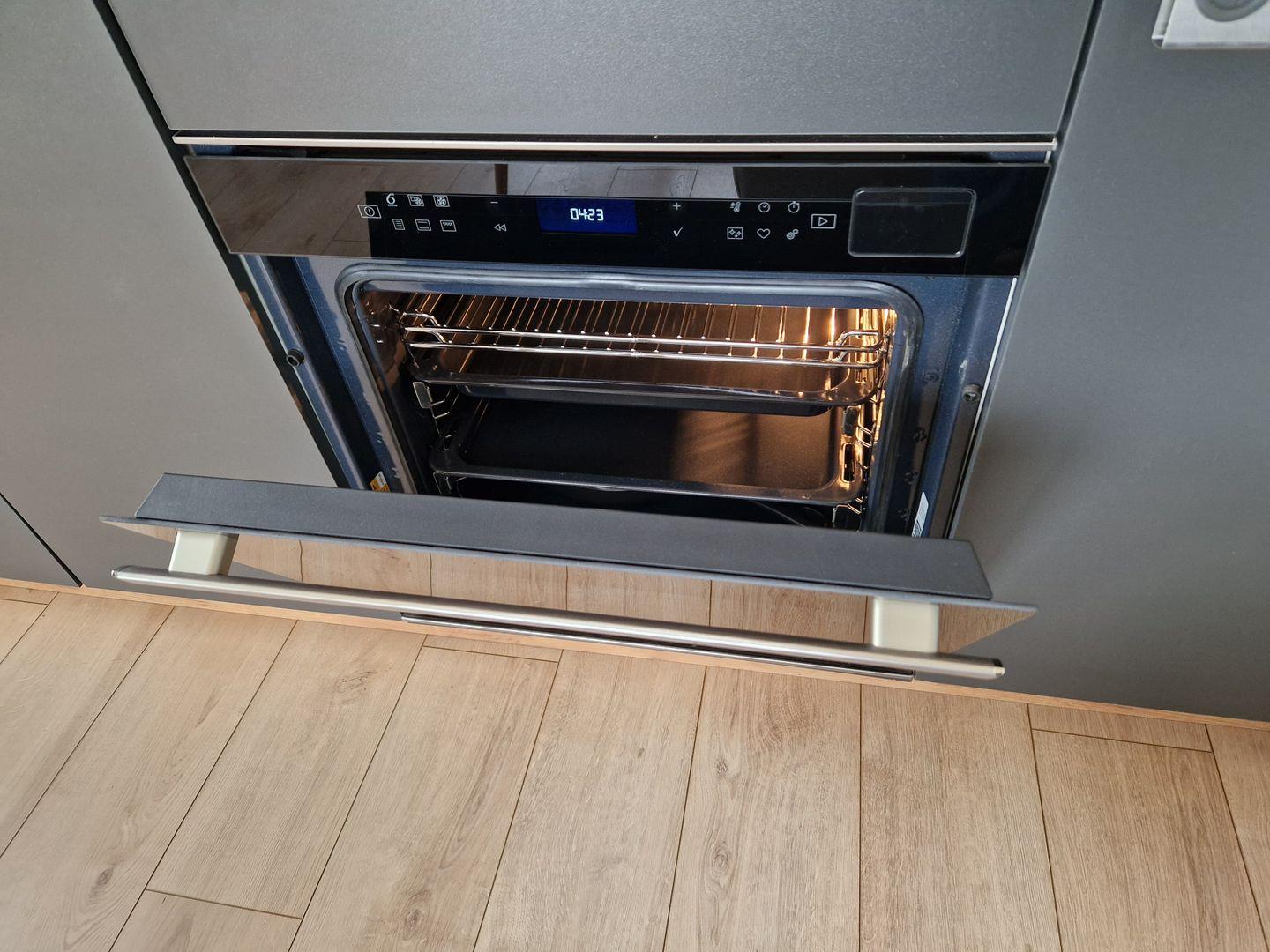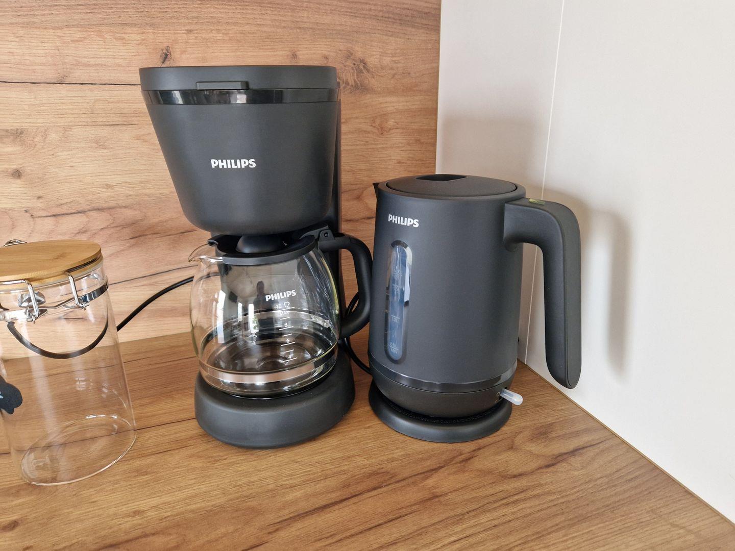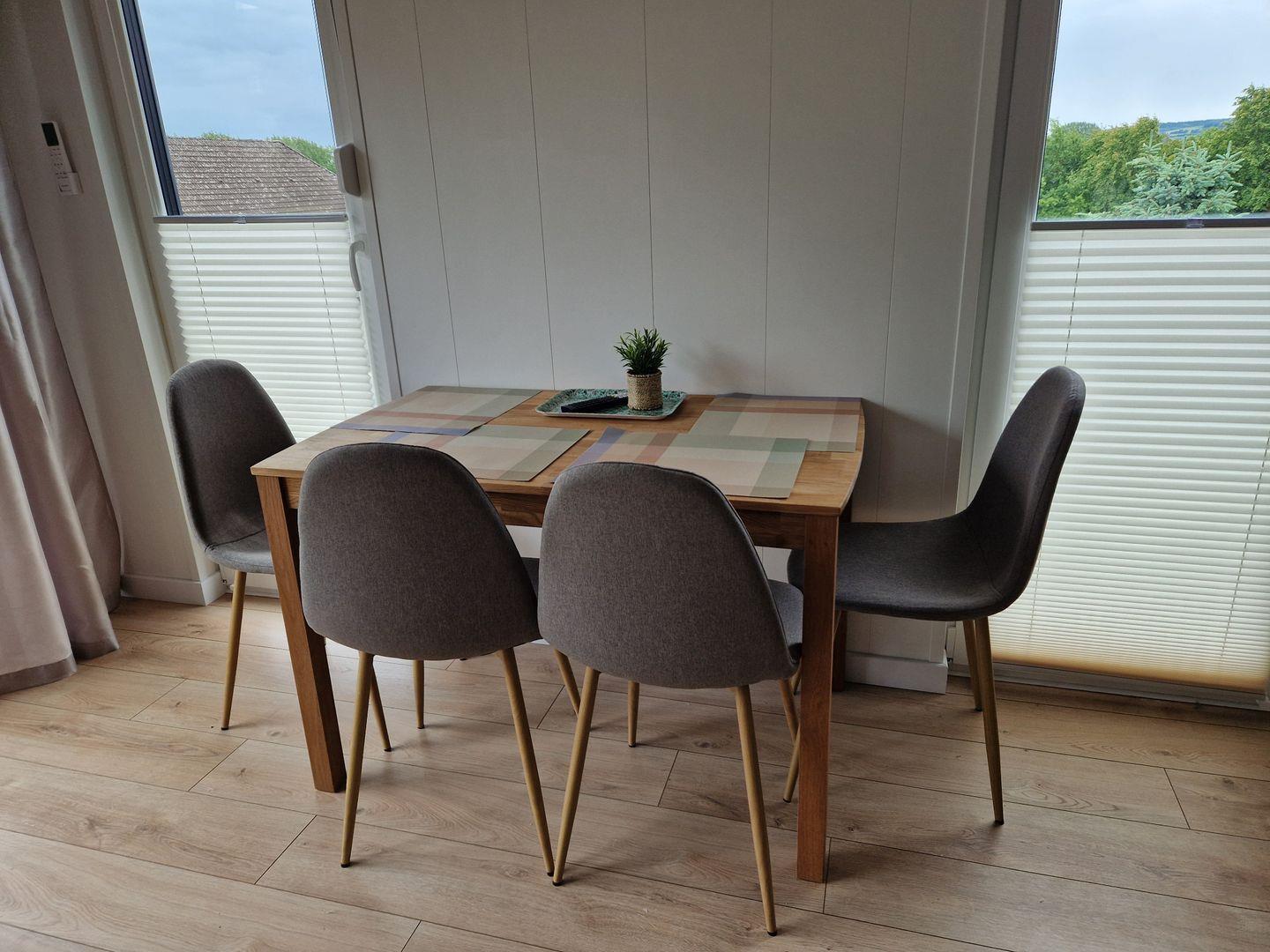 Ceranfeld, Backofen, Kaffeemaschine, Toaster und Wasserkocher). Ein Esstisch mit 4