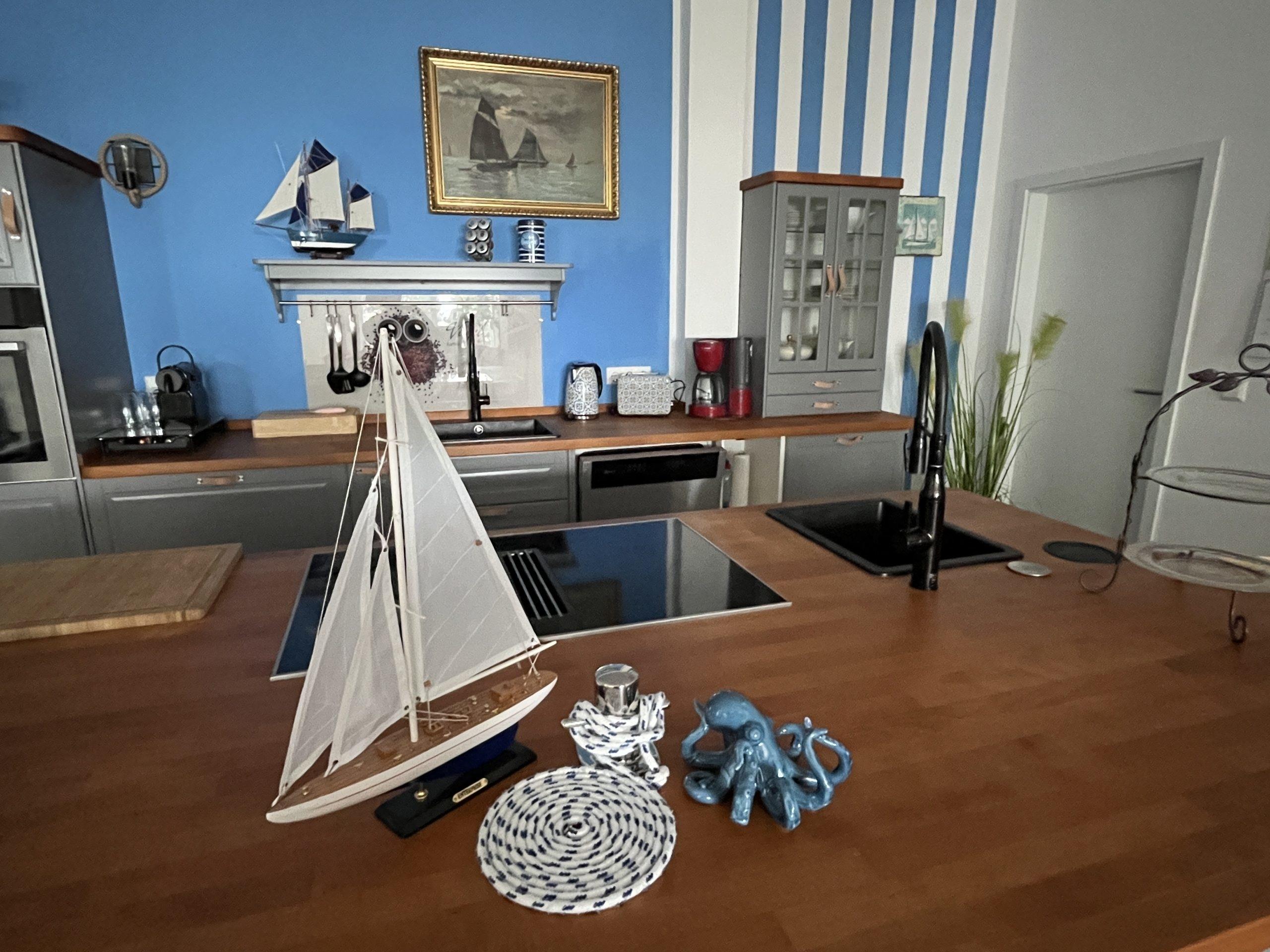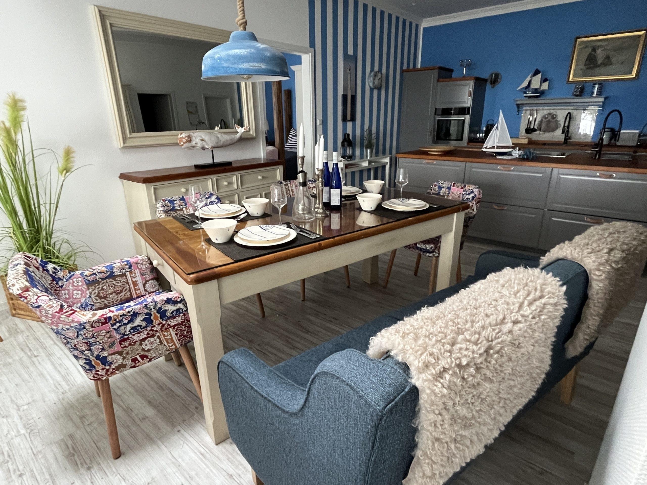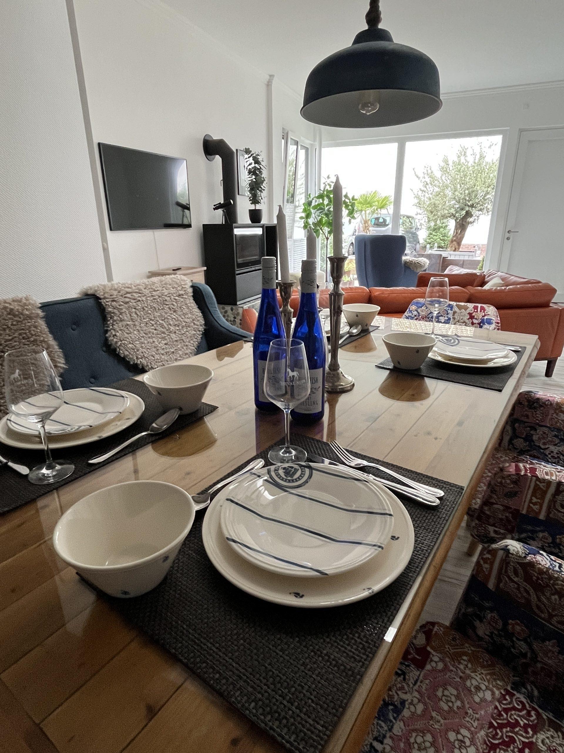 Zur Küche gehört außerdem eine Grundausstattung zum Kochen, Geschirr und Besteck, Edelstahl-Backofen, Weingläser, Backblech. Ein Esstisch ist auch vorhanden.