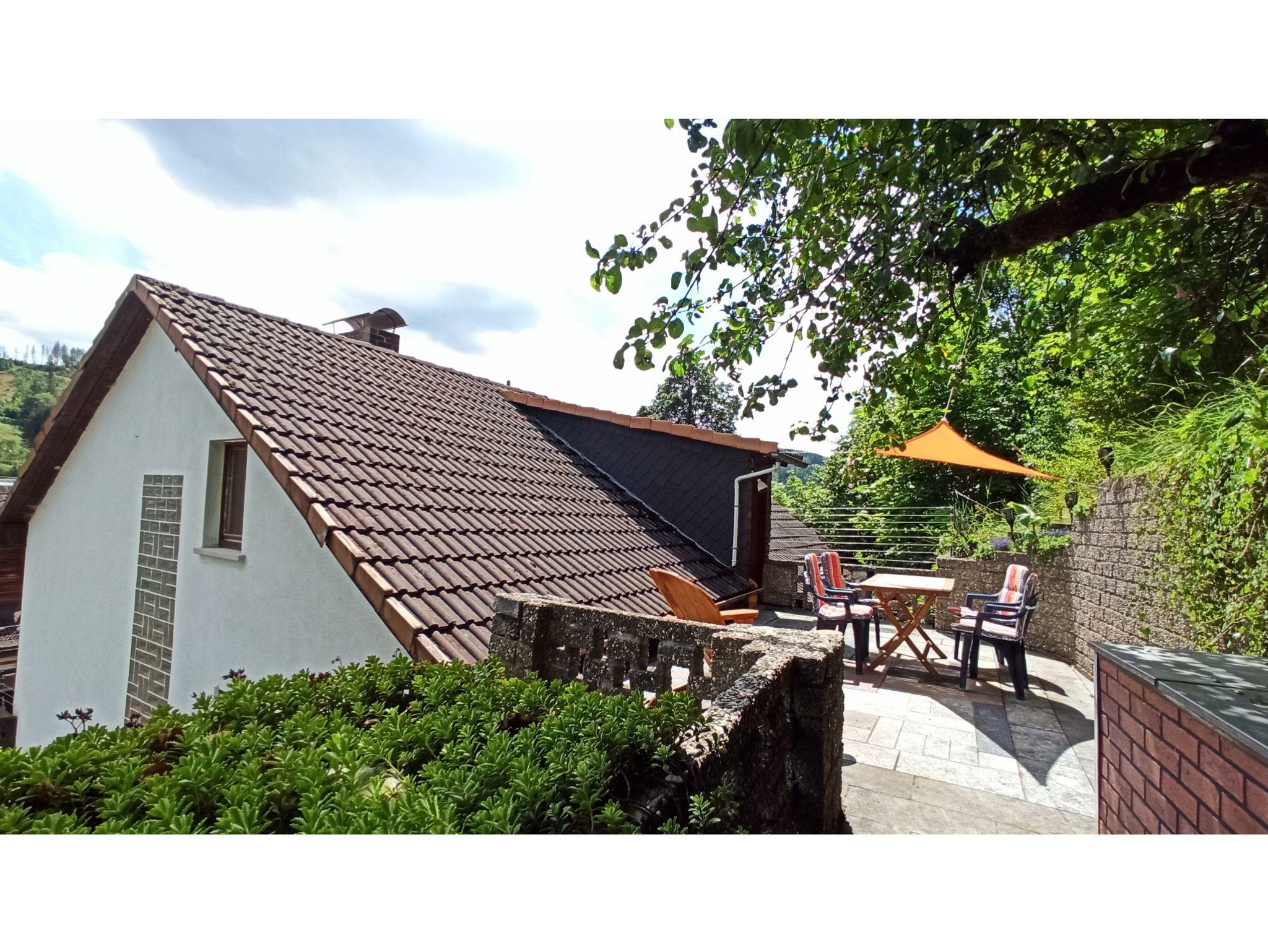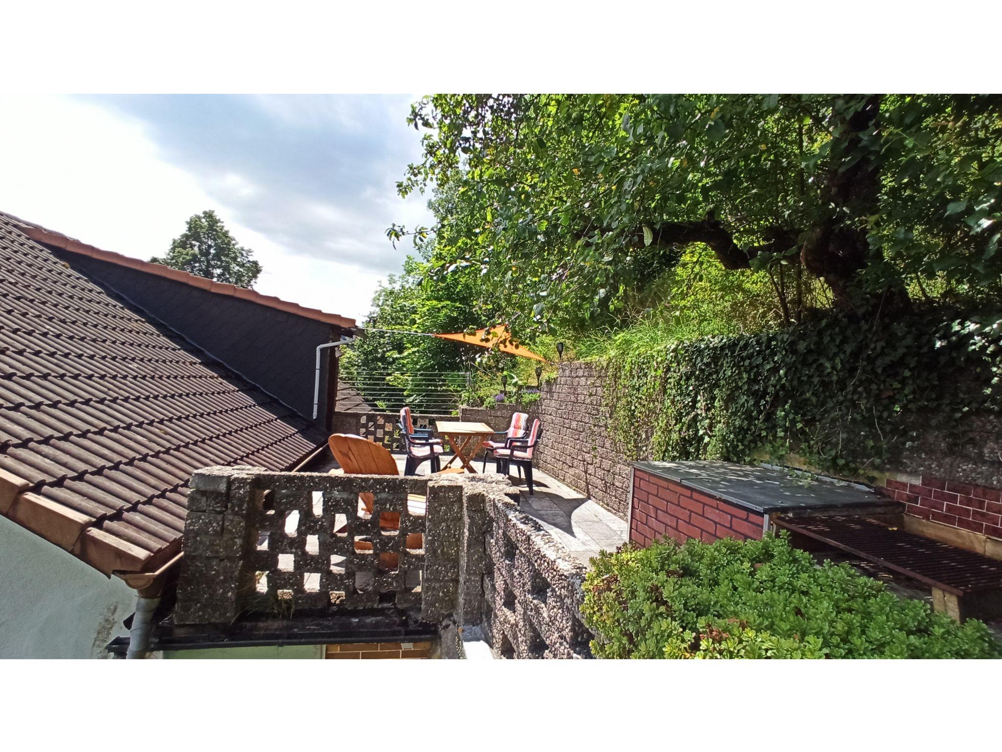 Das Haus schmiegt sich an den Mühlberg und bietet auf der Rückseite eine versteckte und Sonnige Dachterrasse mit feststehendem Grill.