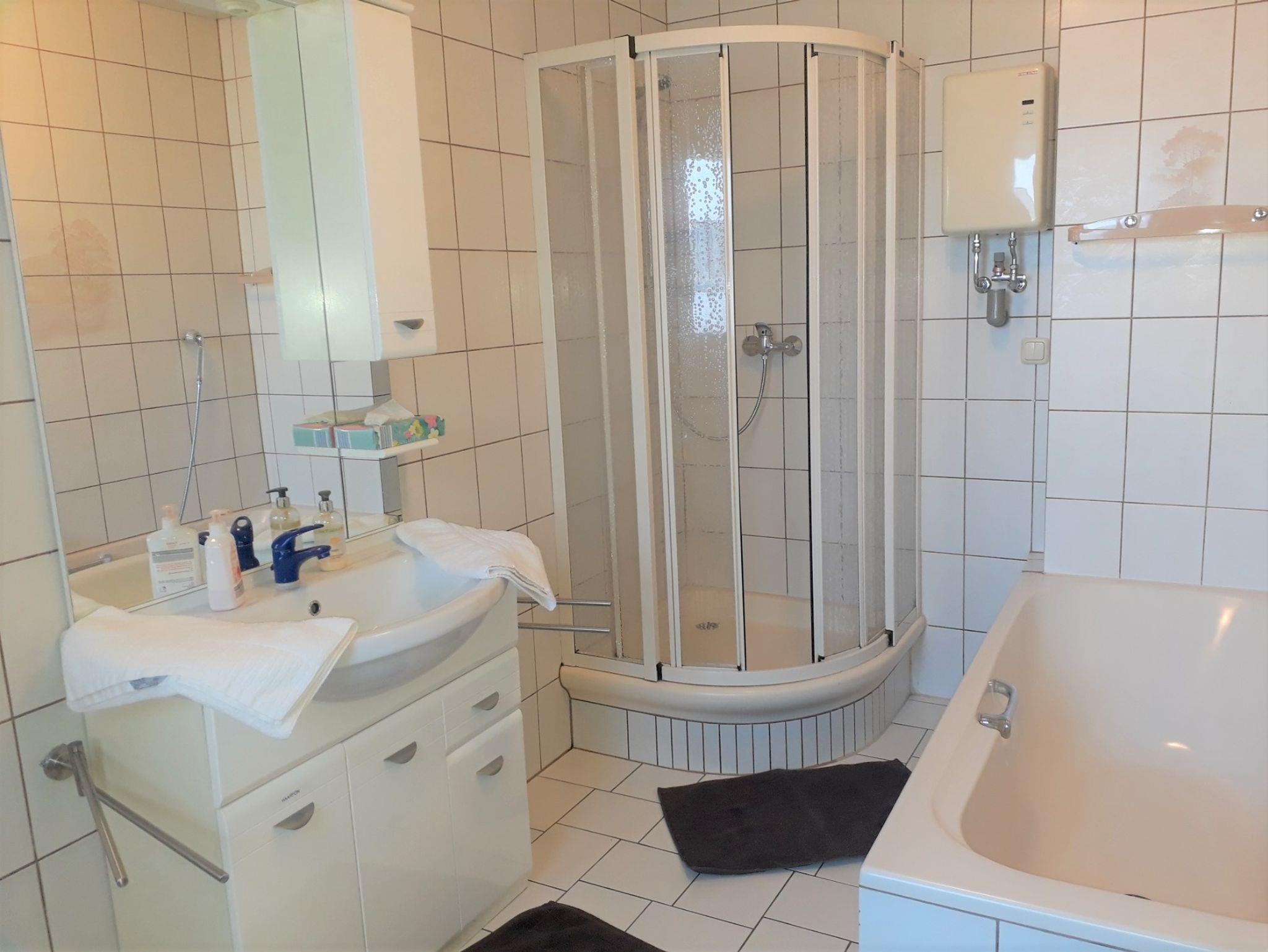 Sie starten den Tag im geräumigen Badezimmer, ausgestattet mit Badewanne, Dusche, Spiegelwaschplatz, Haartrockner und WC. Toilettenpapier, Kosmetiktücher und Seifen sind selbstverständlich. Die Bade- und Handtücher wechseln wir bei Bedarf mehrmals in der Woche.
