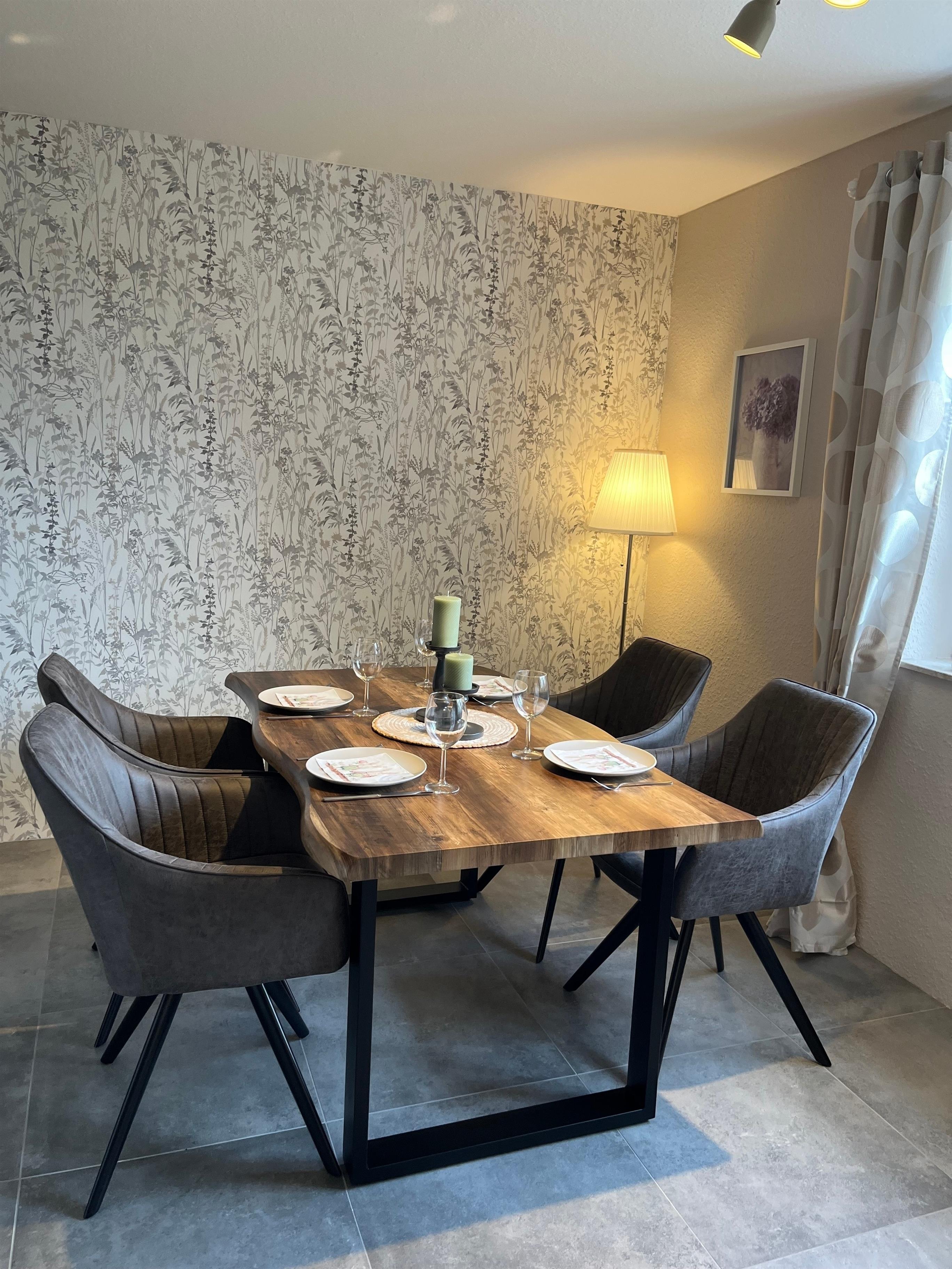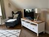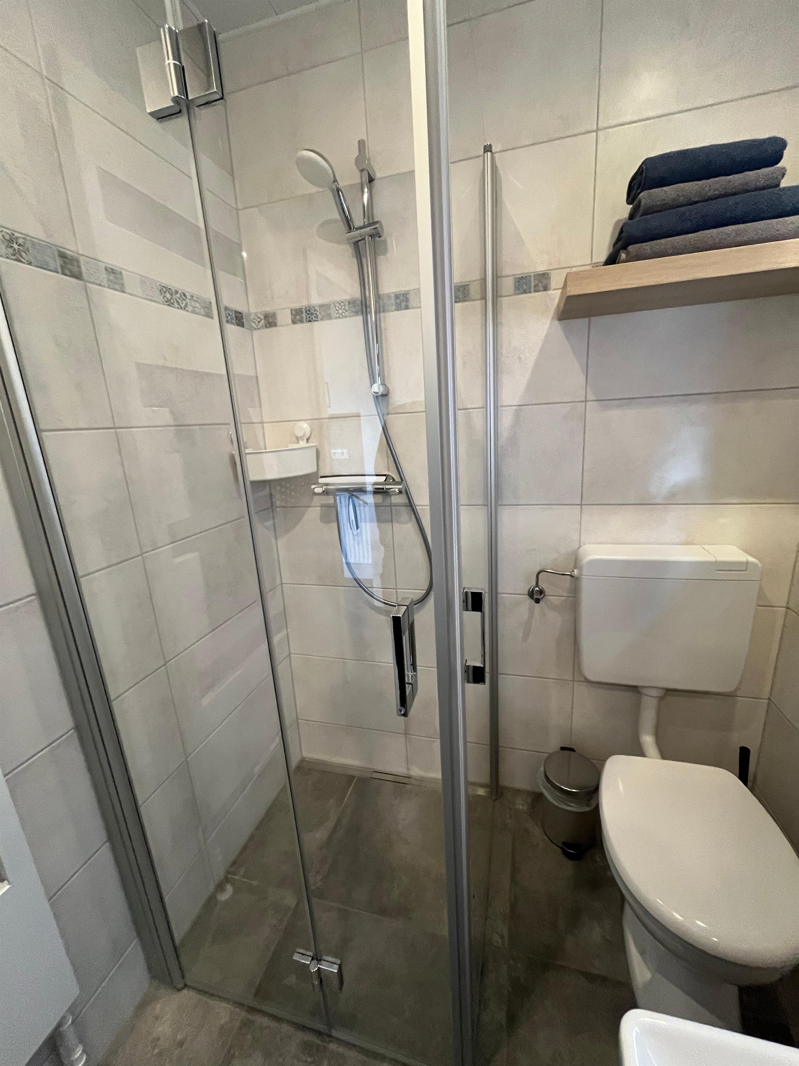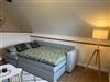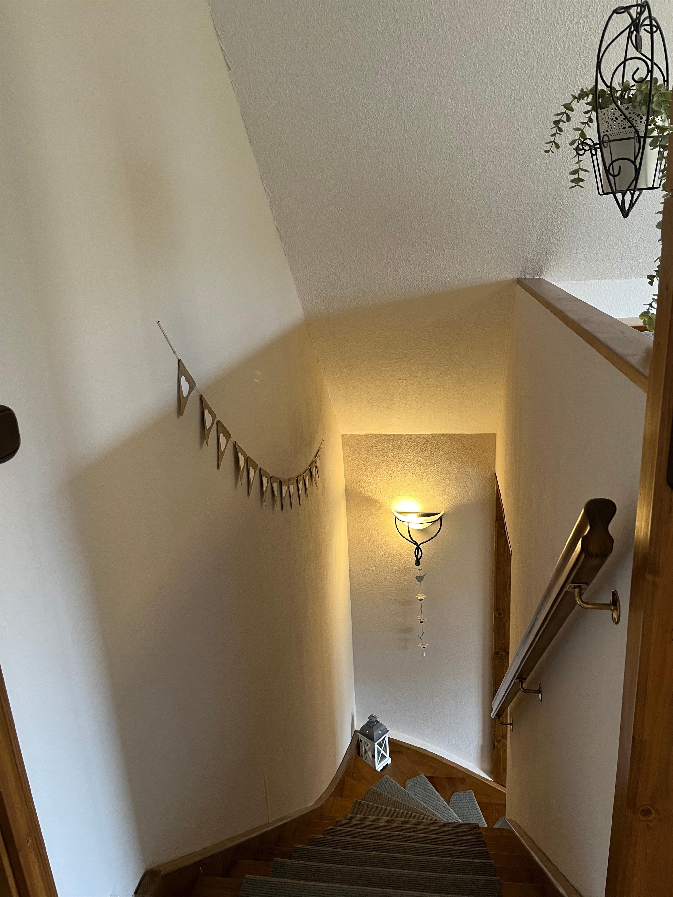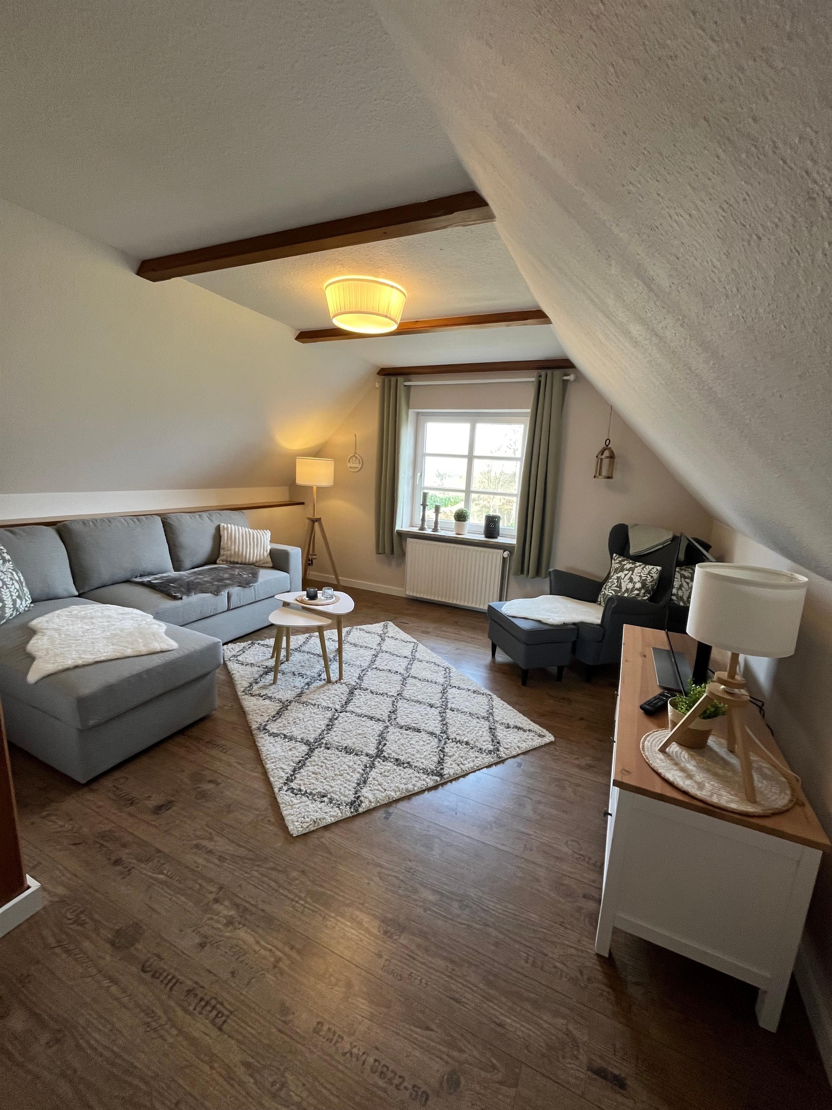 Im Erdgeschoss befindet sich das Duschbad und die Küche mit Essbereich. Die Küche ist ausgestattet mit einem Kühlschrank, Backofen, Cerankochfeld, Mikrowelle, Spülmaschine und sämtlichen Küchenkleingeräten. Über die Treppe nach oben erreichen Sie das offene Wohnzimmer. Dieses ist ausgestattet mit einem Schlafsofa.