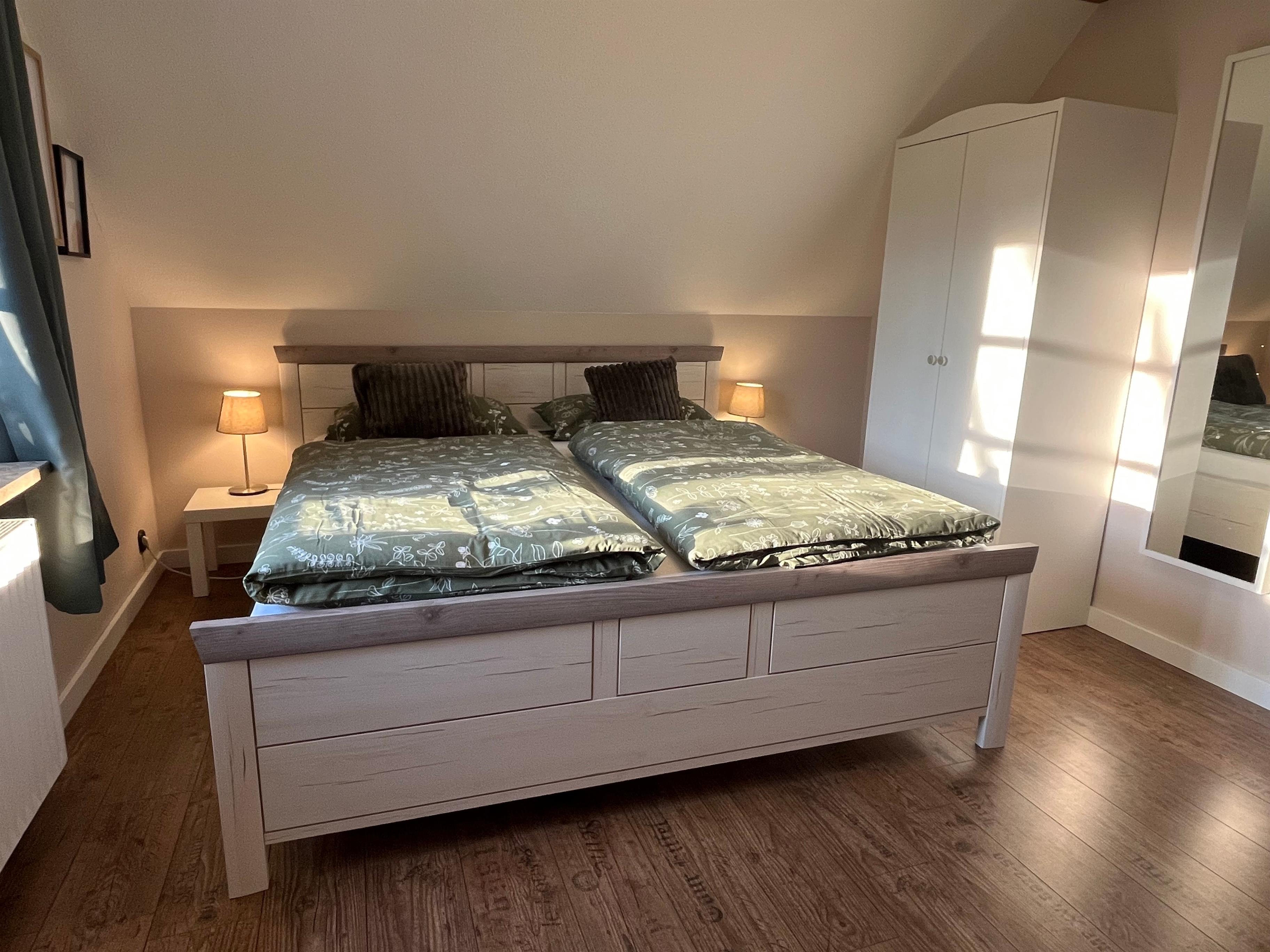 Im 1. Stock befindet sich außerdem das Schlafzimmer, ausgestattet mit einem Doppelbett (180x200cm).
