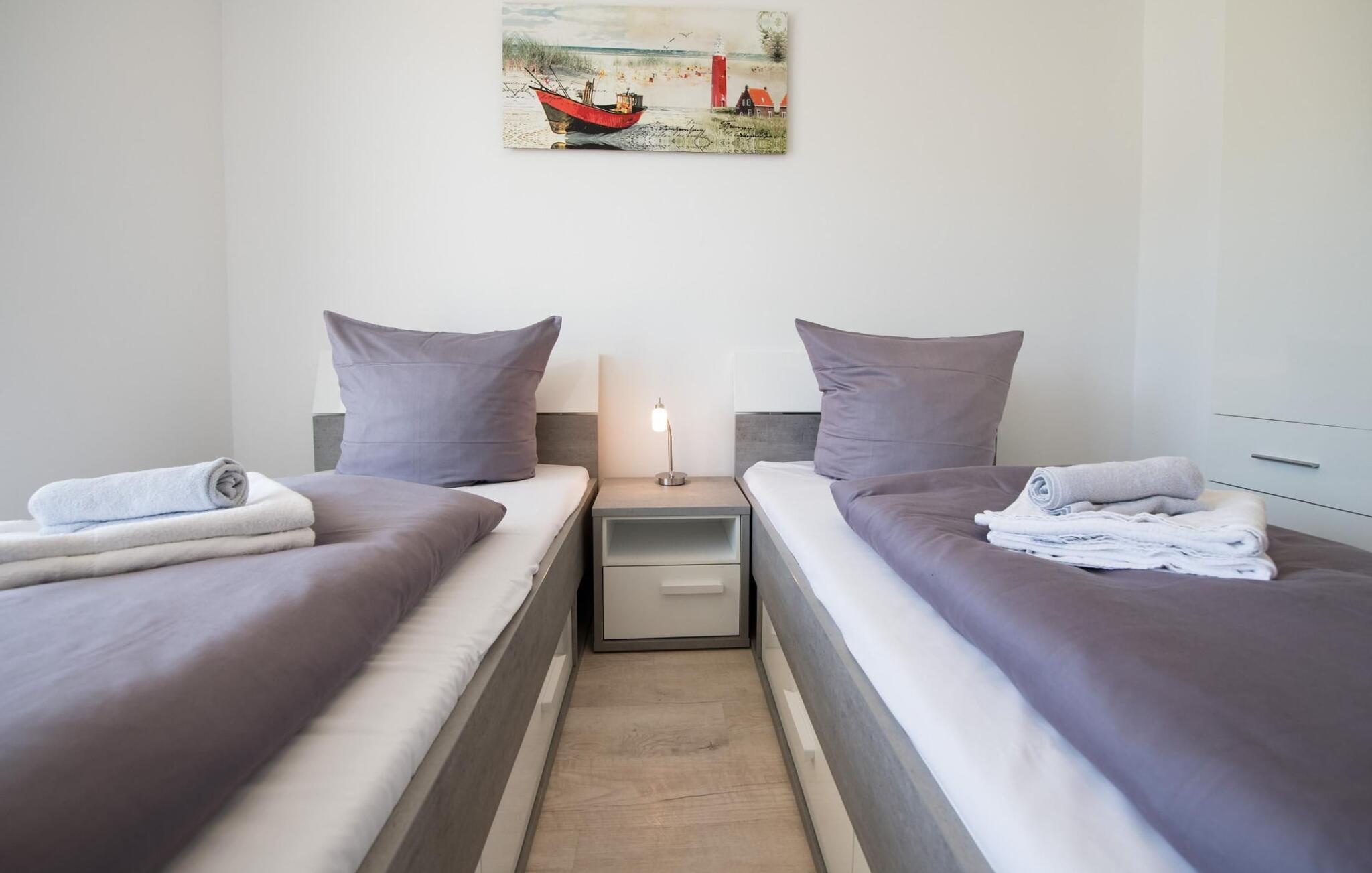Soveværelset har plads til to voksne. Et andet soveværelse er møbleret med to komfortable enkeltsenge. Begge værelser har adgang til den anden terrasse, som med sin sydvendte orientering lover solskin hele dagen.