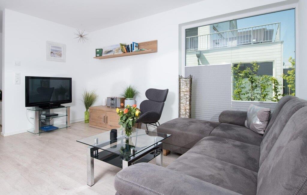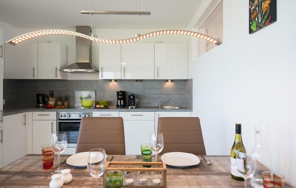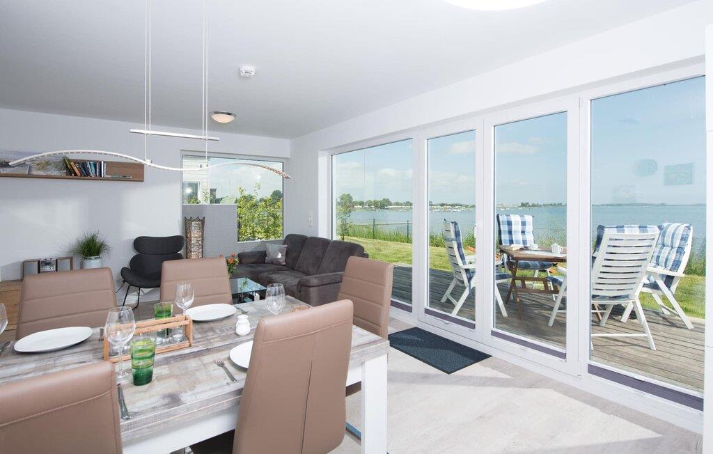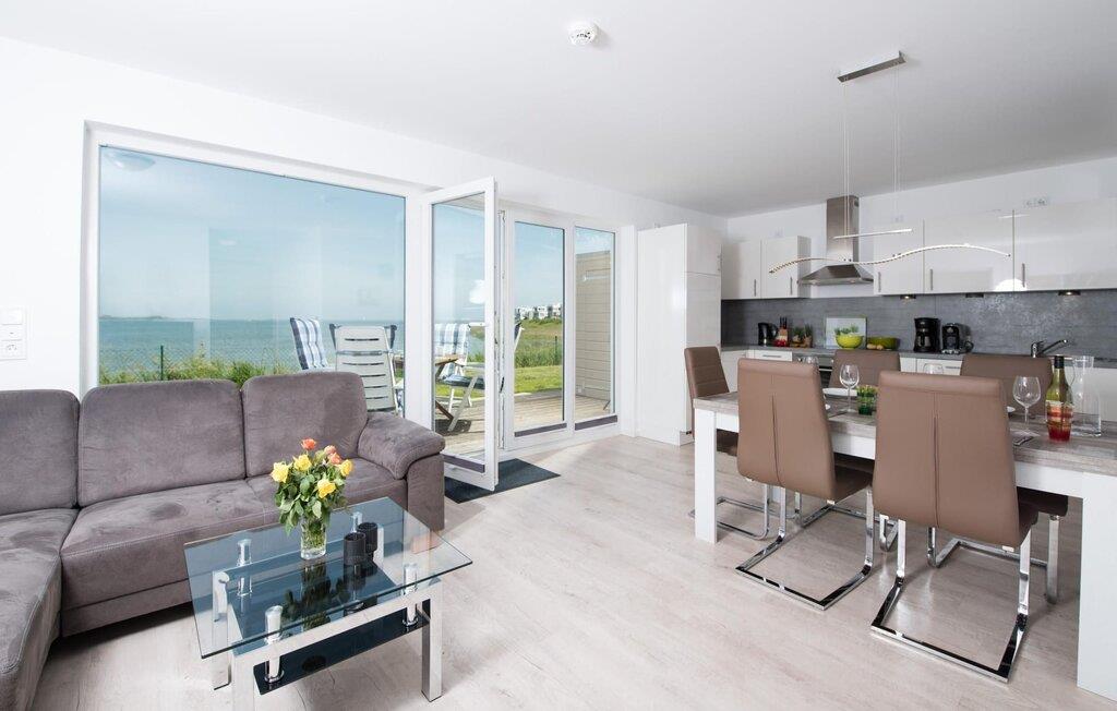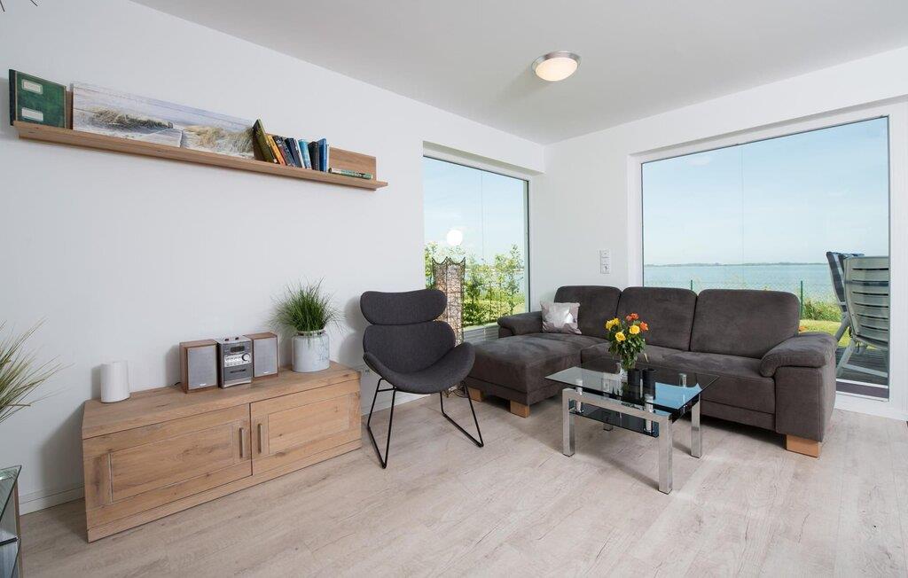 Ferielejligheden Sternschnuppe er moderne møbleret og i åben planløsning og er noget særligt med sin uhindrede udsigt over Sli-fjorden fra hele opholds- og spisestuen. Gulv-til-loft-vinduer med udsigt over den panoramiske havnefront og forbipasserende sejlbåde gør feriedrømme til virkelighed. Det åbne køkken af ??høj kvalitet opfylder alle behov. Spisebordet og det komfortable siddeområde med udsigt over vandet lægger op til at slappe af og nyde romantiske aftener under stjernerne.
