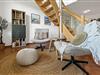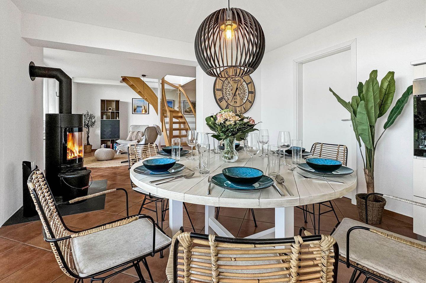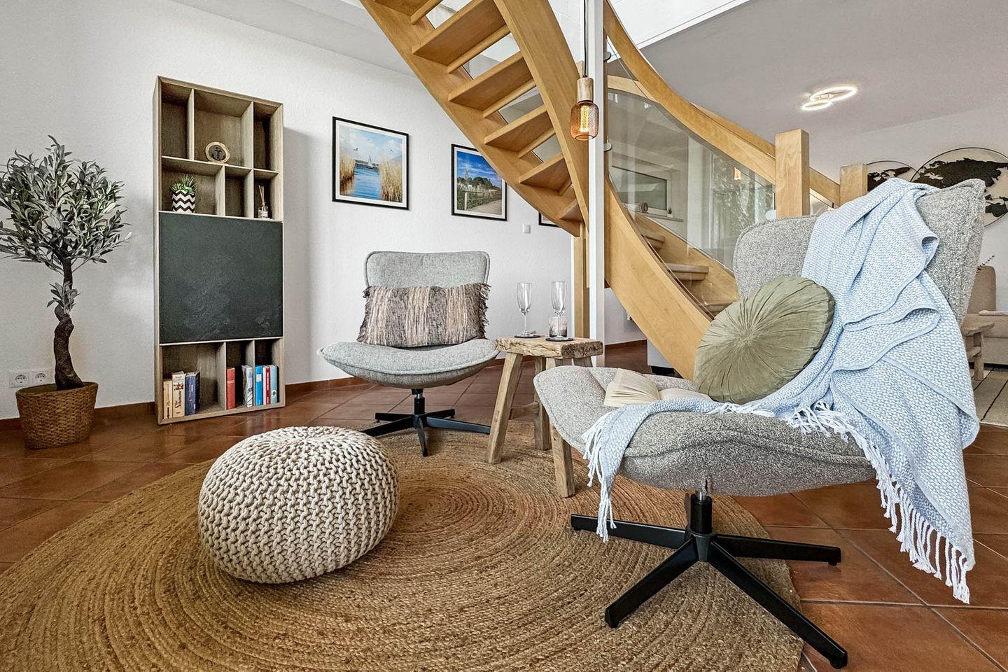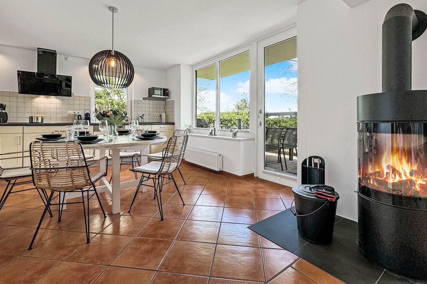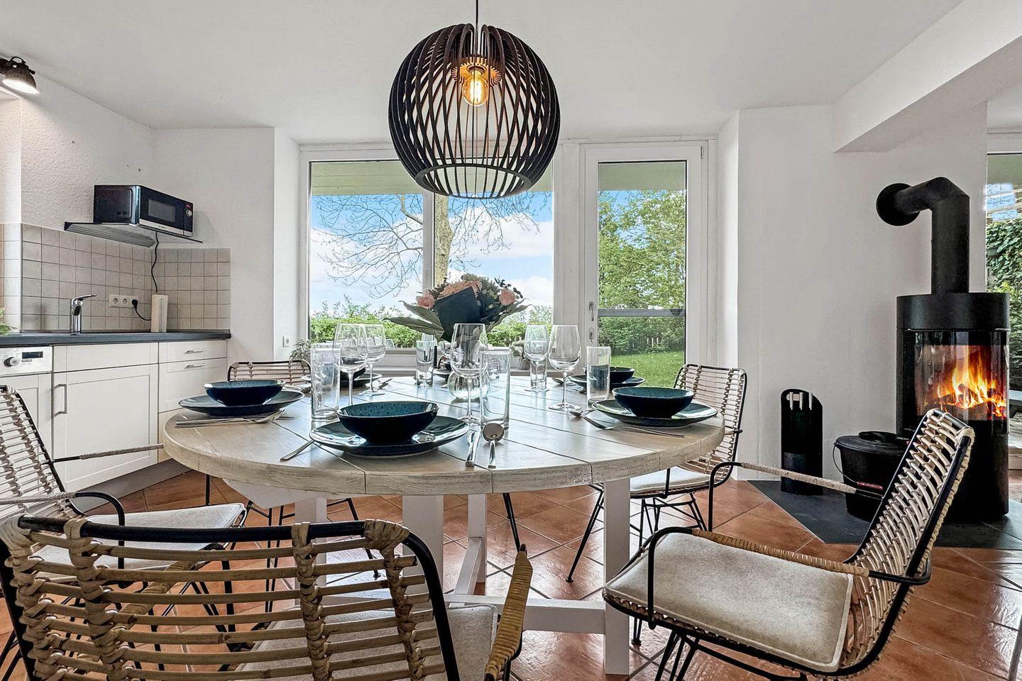 Die untere Etage des Ferienhauses Schleikoppel bildet das Herzstück des Hauses. Der großzügige Wohnzimmerbereich mit Ecksofa und Lesesesseln ist verbunden mit der offenen Küche, die einen Esstisch für 6 Personen bietet. Ein Kaminofen sorgt für Gemütlichkeit an kalten Tagen.