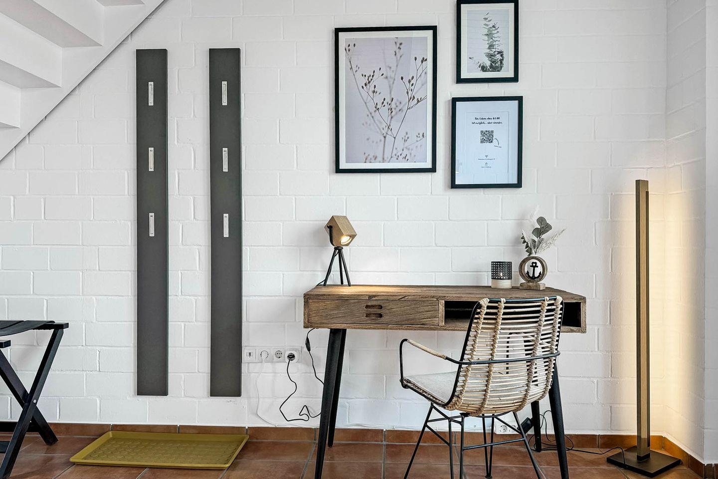 Das Haus teilt sich auf drei Etagen auf, wobei man Eintritt durch die mittlere Etage erhält. Hier wird man empfangen mit einem freien Blick auf die Schlei. Ein kleiner Schreibtisch lädt zum Arbeiten ein, Garderobe kann bequem abgelegt werden und ein schöner Balkon bietet die Möglichkeit, den Ausblick auch dort im Freien zu genießen. Ein Duschbad mit WC findet man in dieser Etage ebenfalls.