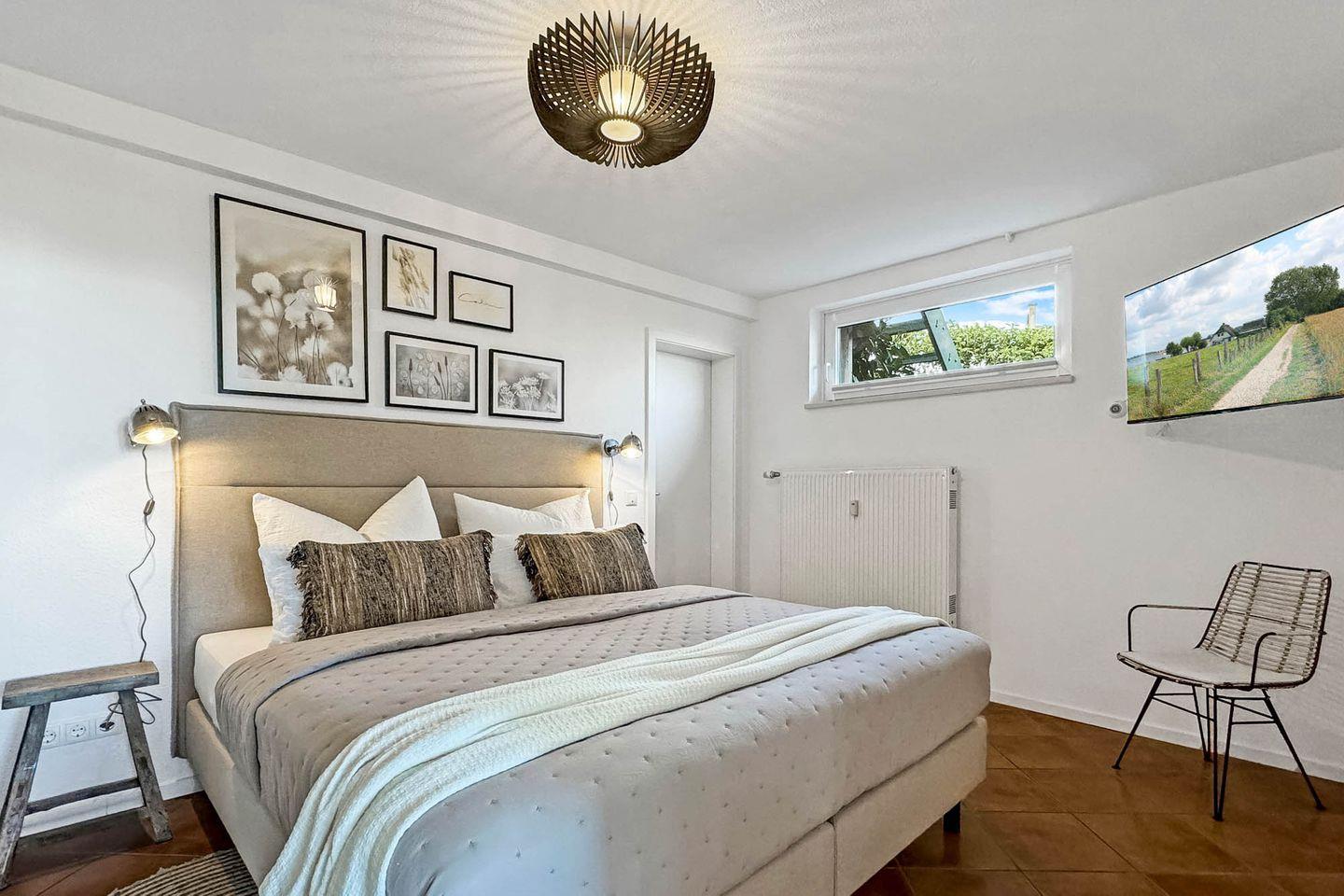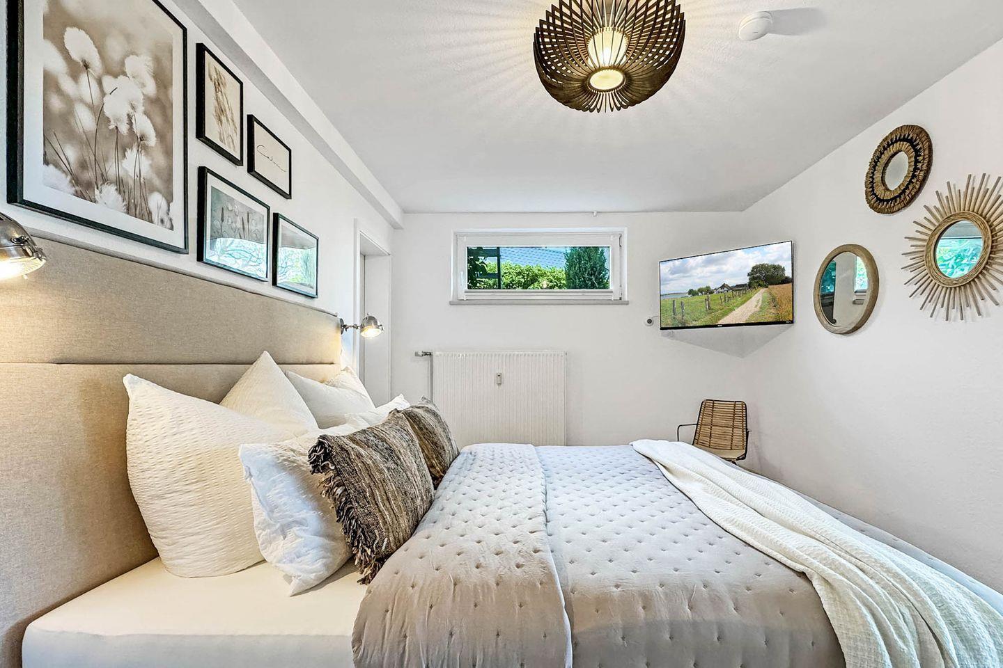 Über eine Treppe gelangt man ins Dachgeschoss des in 2024 renovierten und neu eingerichteten Ferienhauses. Auch hier bietet die Giebelfront einen atemberaubenden Blick in die beruhigende Natur der Schleiregion. Erholsamen Schlaf findet man in zwei einzelnen bequemen Betten.