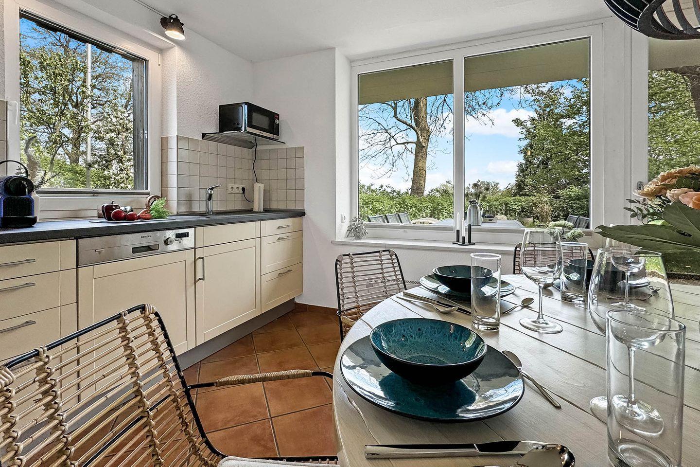 Zum Ferienhaus gehört ein kleiner Garten, in dem sich immer ein sonniges Plätzchen finden lässt. Von hier aus gelangt man auch direkt auf einen kleinen Wanderweg, der zum Schleiufer, zu einem kleinen Sportboothafen und zur Badestelle mit Spielplatz, Fußballtoren und Basketballkorb führt.