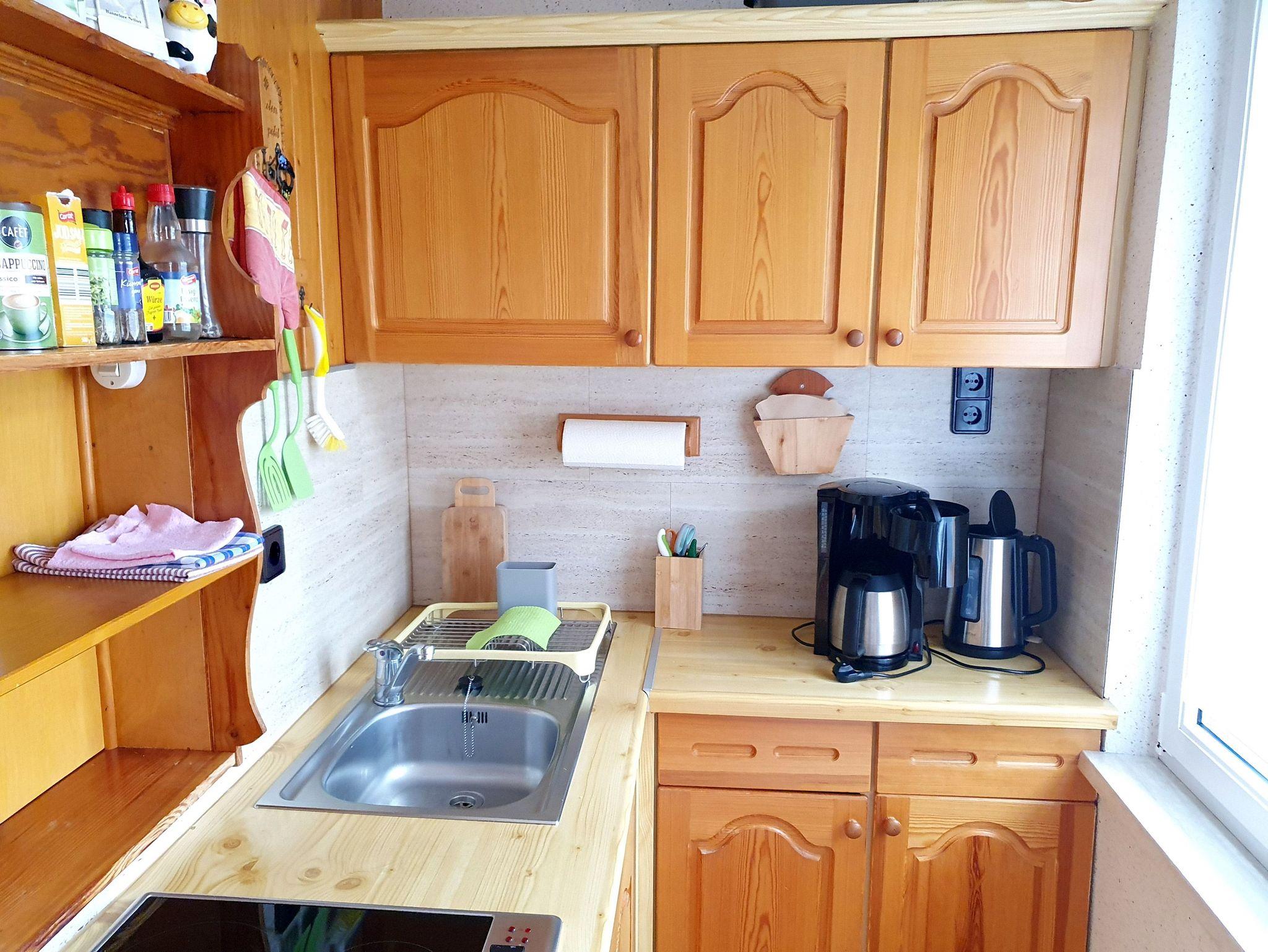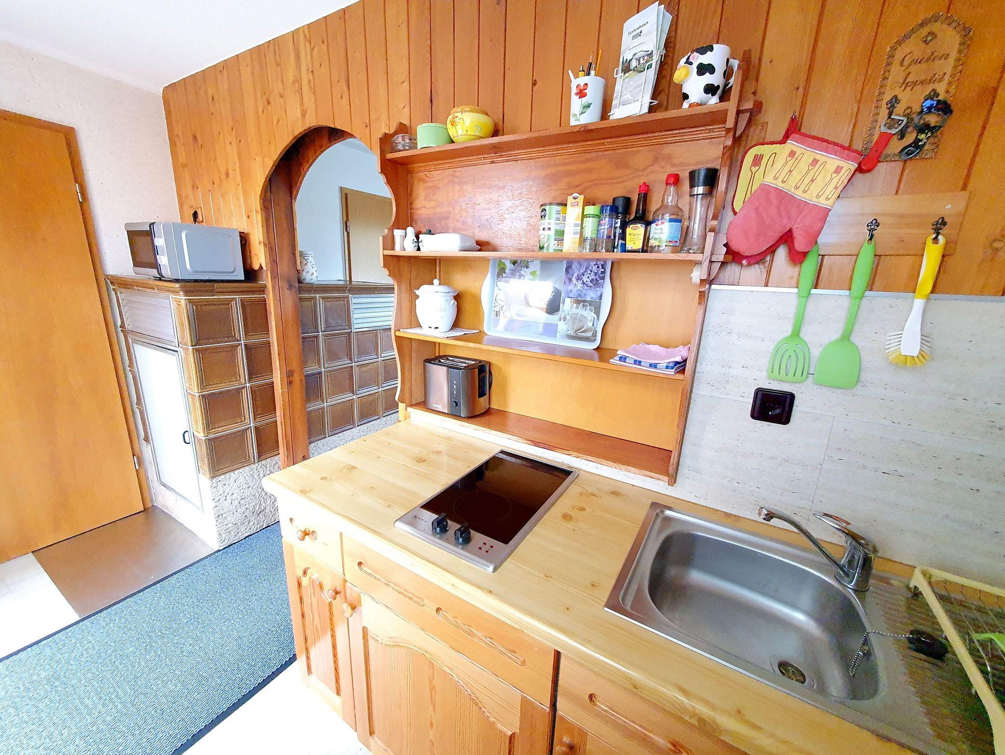 Für behagliche Wärme sorgt ein Heißluftkachelofen und im Bad zusätzlich eine Wärmeplatte. Zum Interieur der voll ausgestatteten Küche gehören u.a. Kühlschrank mit Gefrierfach, Spüle, Cerankochfeld, Kaffeemaschine, Mikrowelle, Wasserkocher, Besteck, Geschirr und Töpfe.