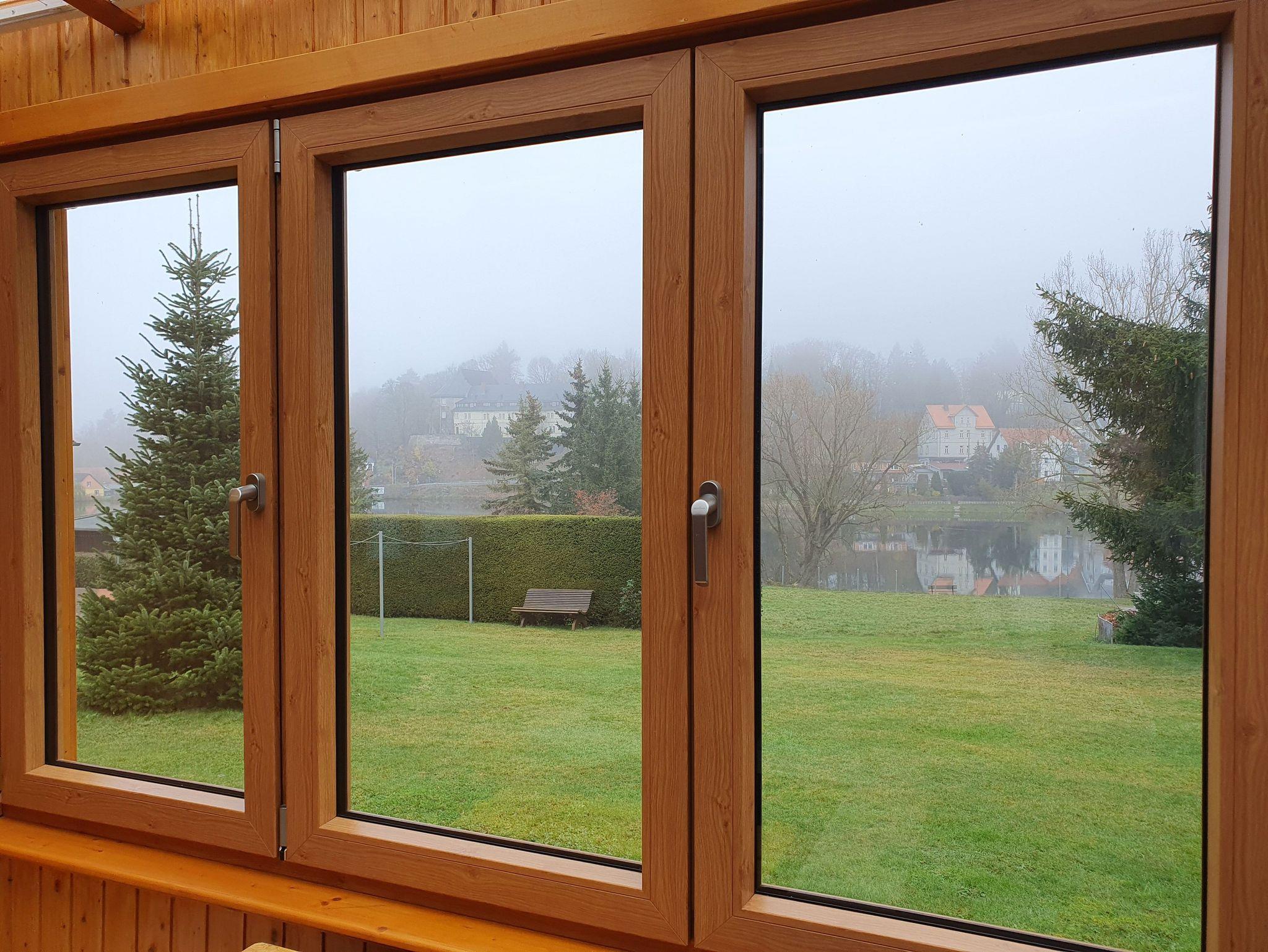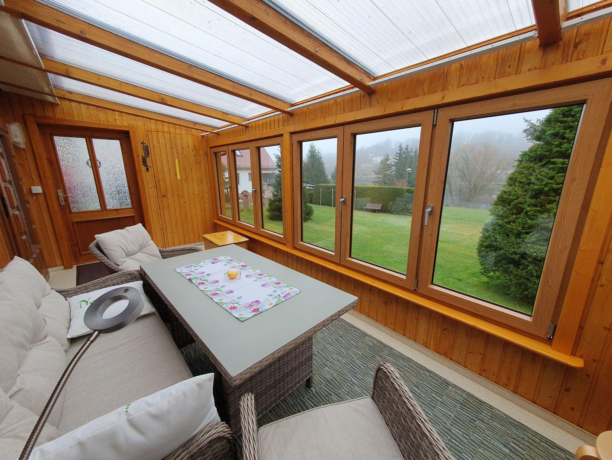 Der helle Wintergarten mit Radio und der rustikalen Sitzgruppe bietet den schönsten Ausblick auf den See und das gegenüberliegende Schloss.