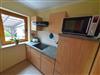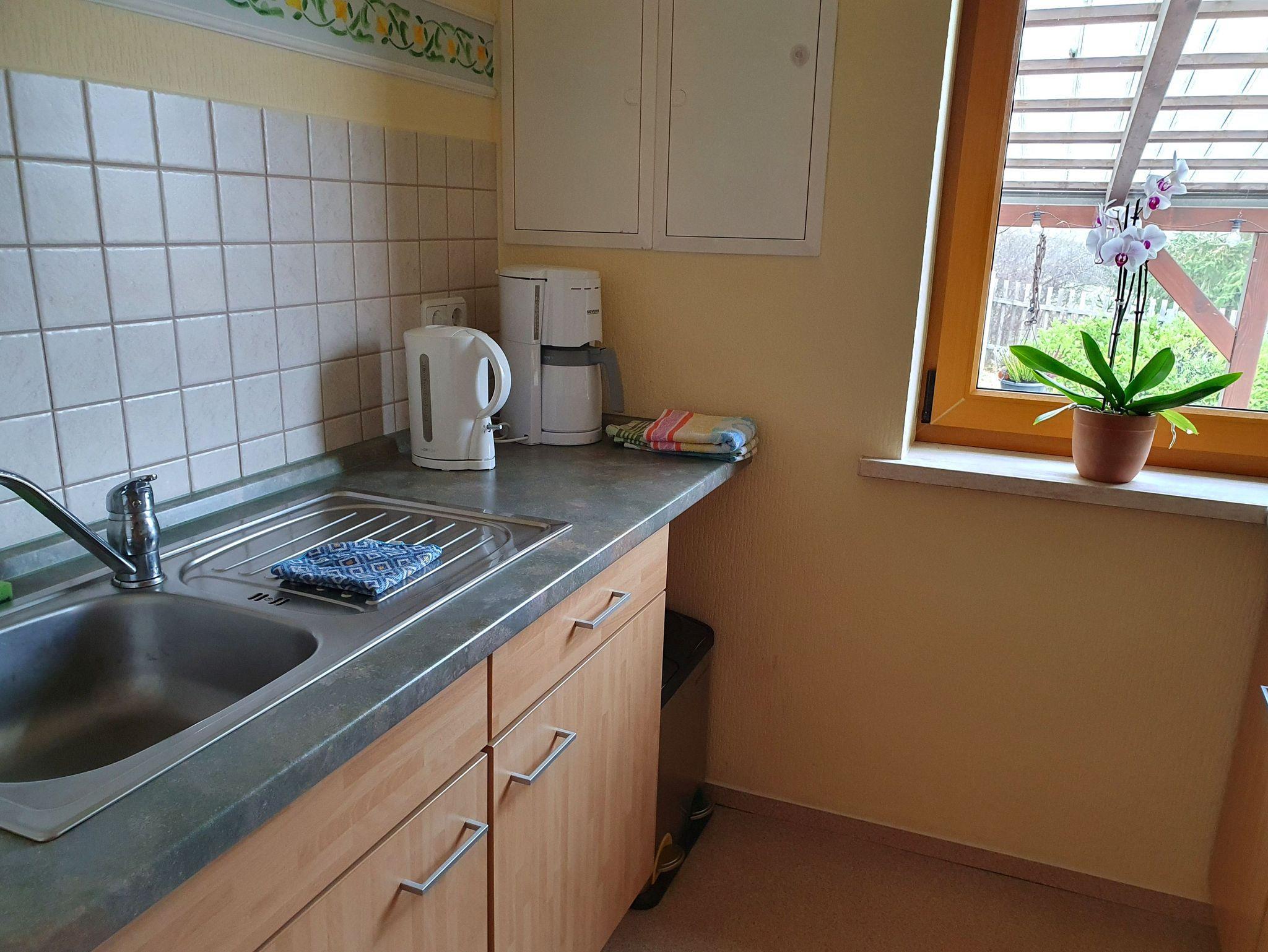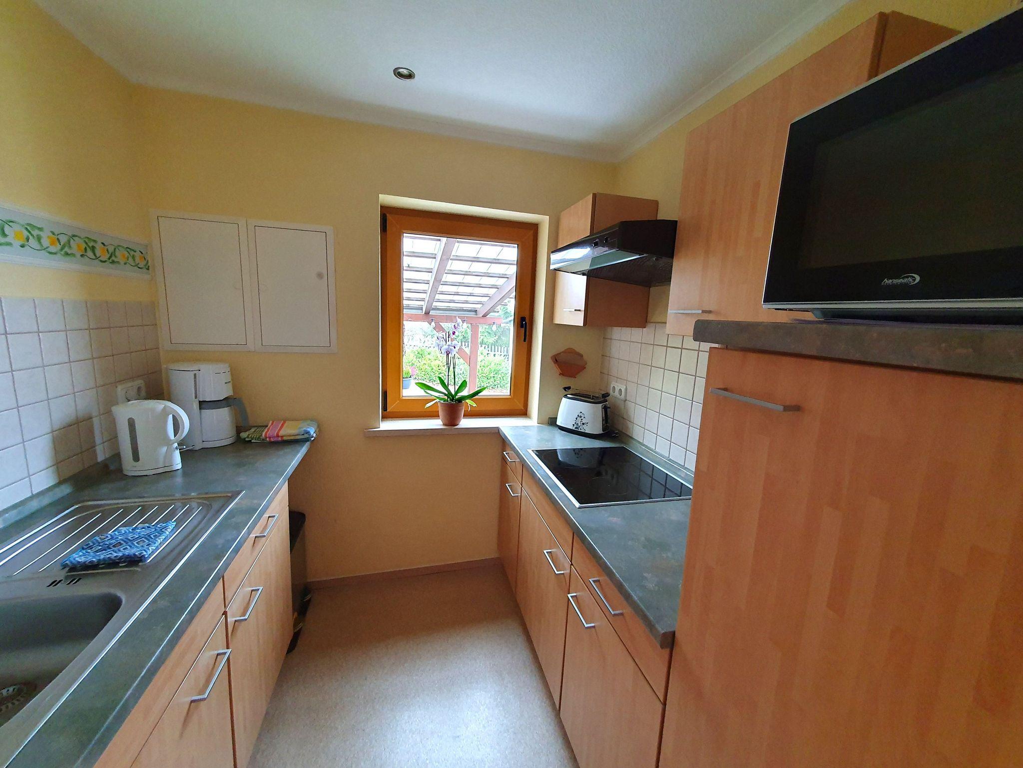 Zum Interieur der Küche gehören u.a. Kühlschrank mit Gefrierfach, Spüle, Induktionskochfeld, Kaffeemaschine, Wasserkocher, Mikrowelle mit Backfunktion, Besteck und Geschirr.