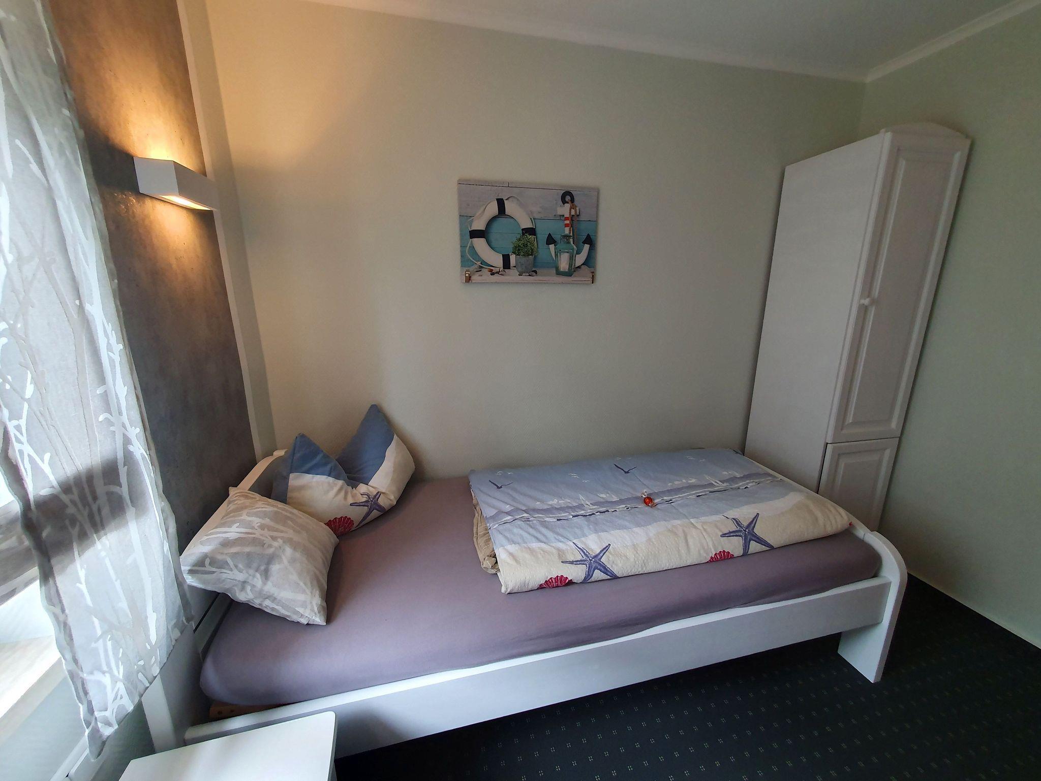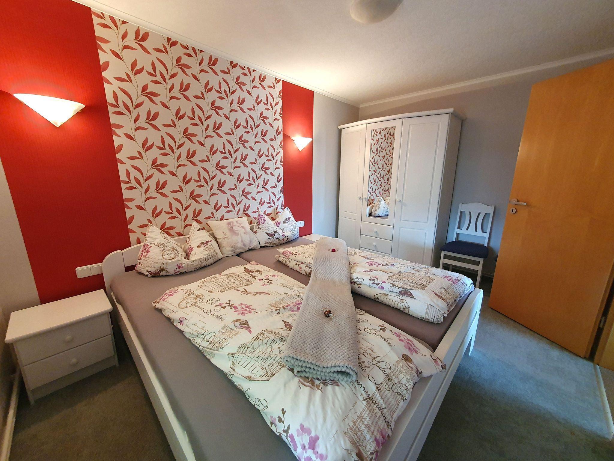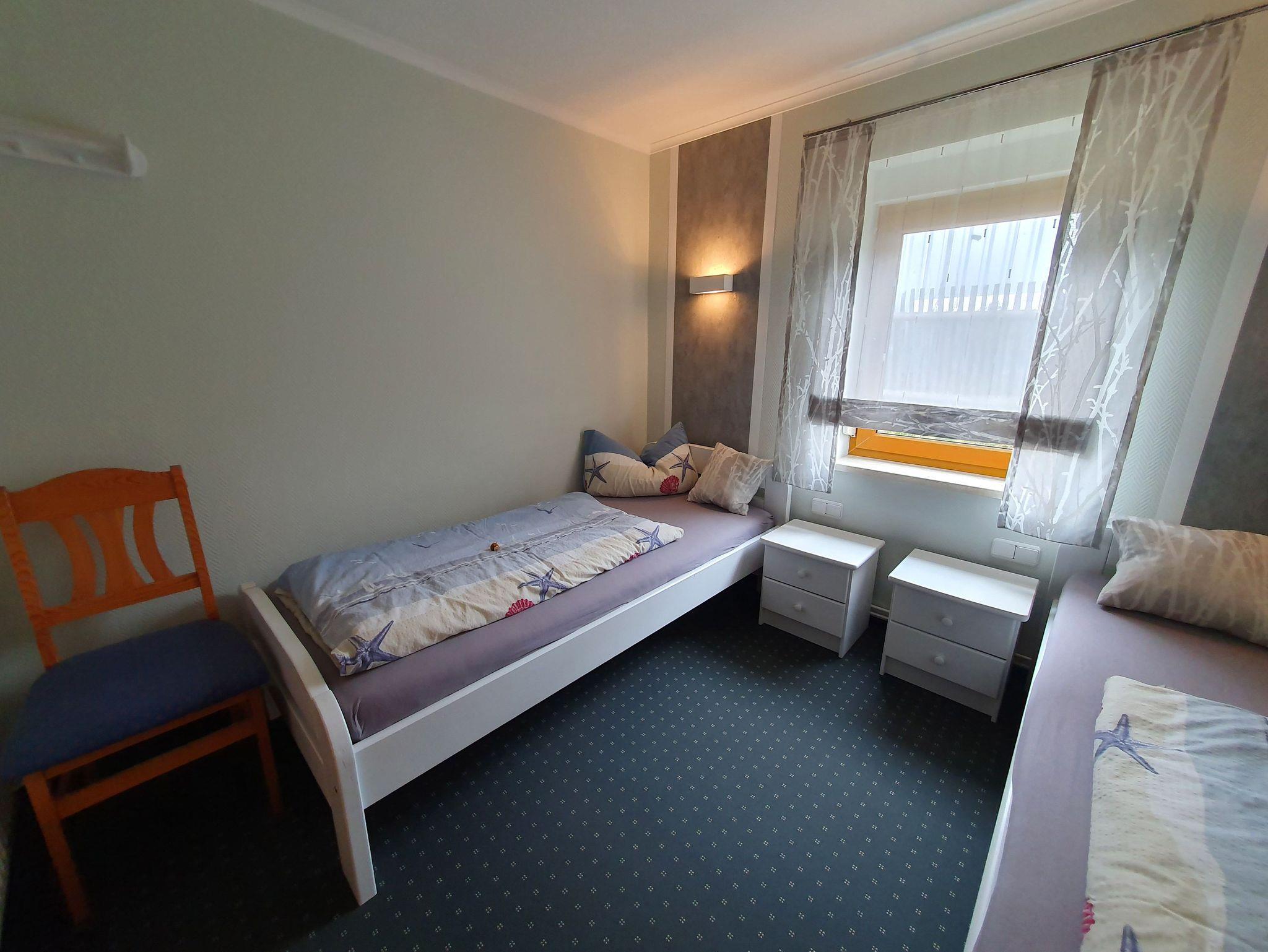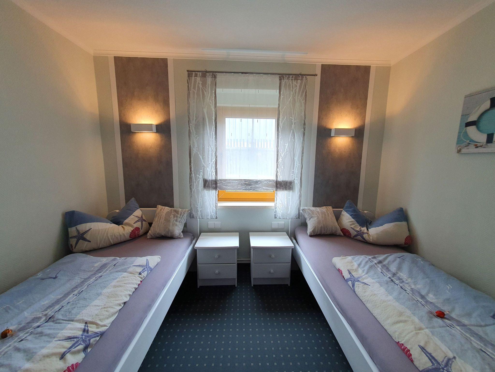 Es gibt 2 Schlafzimmer, beide können mit Rollläden an den Fenstern abgedunkelt werden. Ein Schlafraum hat ein Doppelbett, das andere 2 Einzelbetten, wo die Kopfenden höhenverstellbar sind.