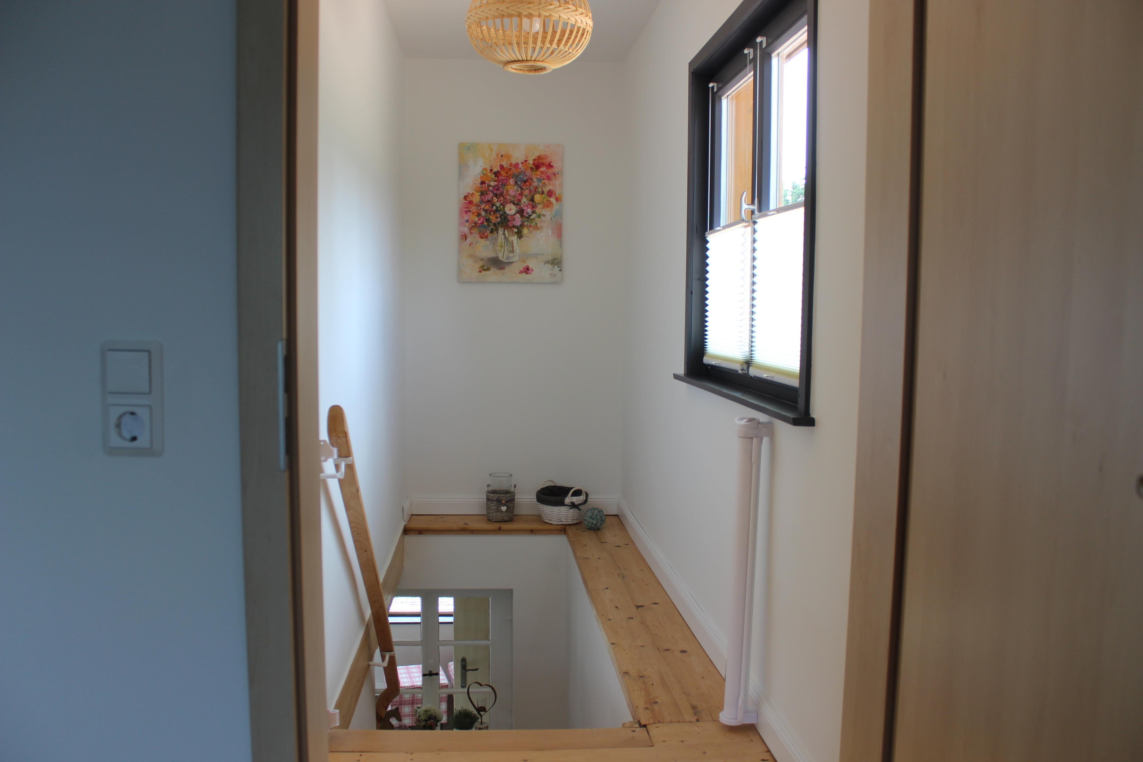 Über eine (oberhalb mit Treppenrollo gesicherte) Treppe gelangen Sie ins Obergeschoss.