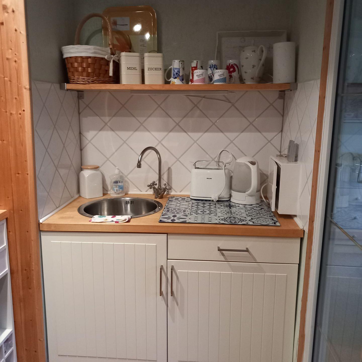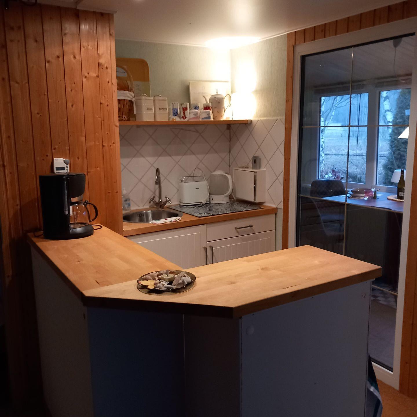 Willkommen in unserem Bungalow. Die Unterkunft ist mit einem Schlafzimmer, einem Wohnzimmer und einer offenen Küche mit Kaffeemaschine, Toaster, Wasserkocher, einer Induktion Kochplatte und kleinem Backofen.