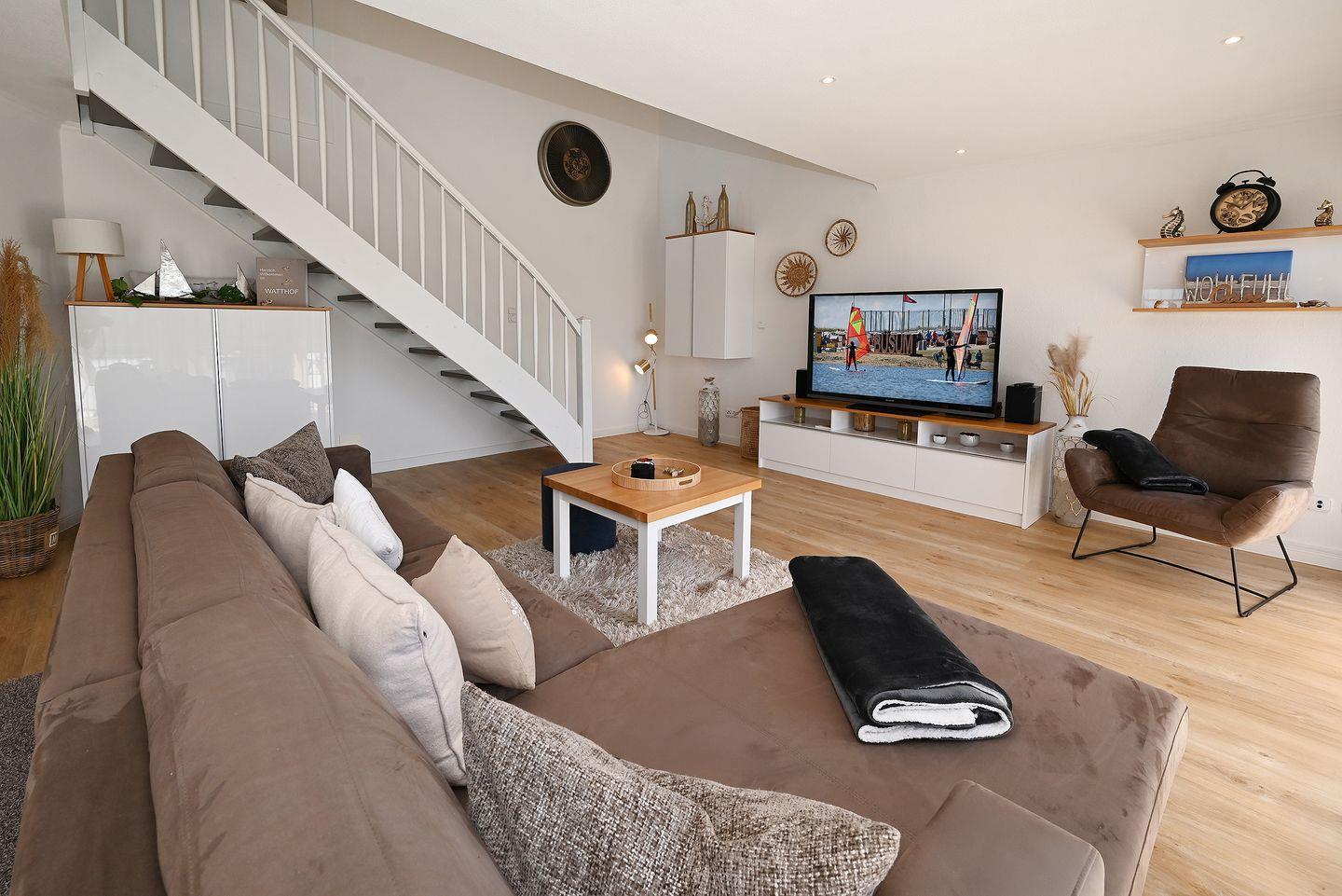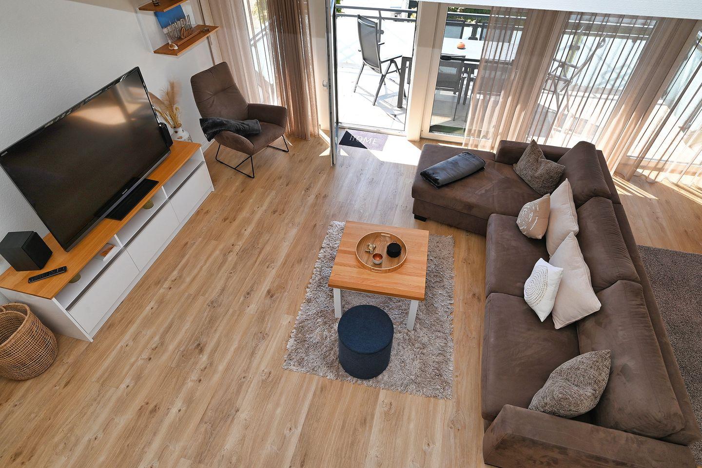 Der offene Wohnbereich verbindet die voll ausgestattete Küche mit dem Essbereich und dem gemütlichen Wohnzimmer. Die moderne Küche beinhaltet alles, was Sie benötigen – vom Herd über die Mikrowelle bis zur Spülmaschine. Hier können Sie Ihre Lieblingsgerichte zubereiten und gesellige Abende am großen Esstisch verbringen. Der Wohnbereich lädt zudem mit komfortablen Sofas, einem Sessel und einem Flachbild-TV dazu ein, nach einem erlebnisreichen Tag zu entspannen. Dank der HiFi-Anlage und dem kostenfreien WLAN bleiben Sie stets gut unterhalten und vernetzt. Bei der zusätzlichen Schlafmöglichkeit handelt es sich um ein Schlafsofa.