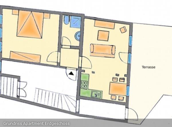 Das Ferienapartment im Erdgeschoss bietet besonderes Ambiente für 2 (bis maximal 4) Personen. Sie schlafen im neu hergerichteten, stilechten Schlafzimmer mit Stuckdecke und Dielung. Vom gemütlichen Wohnbereich aus können Sie direkt auf die Terrasse treten und so beispielsweise ein Frühstück im Grünen genießen. Möchten Sie sich selbst versorgen, steht dem mit einer neuen komplett eingerichteten Küche nichts im Wege. Die Ferienwohnung ist vom Garten bzw. vom PKW-Stellplatz aus ebenerdig zu erreichen und verfügt über ein erhöhtes WC, so dass sie auch für ältere bzw. behinderte Gäste geeignet ist.