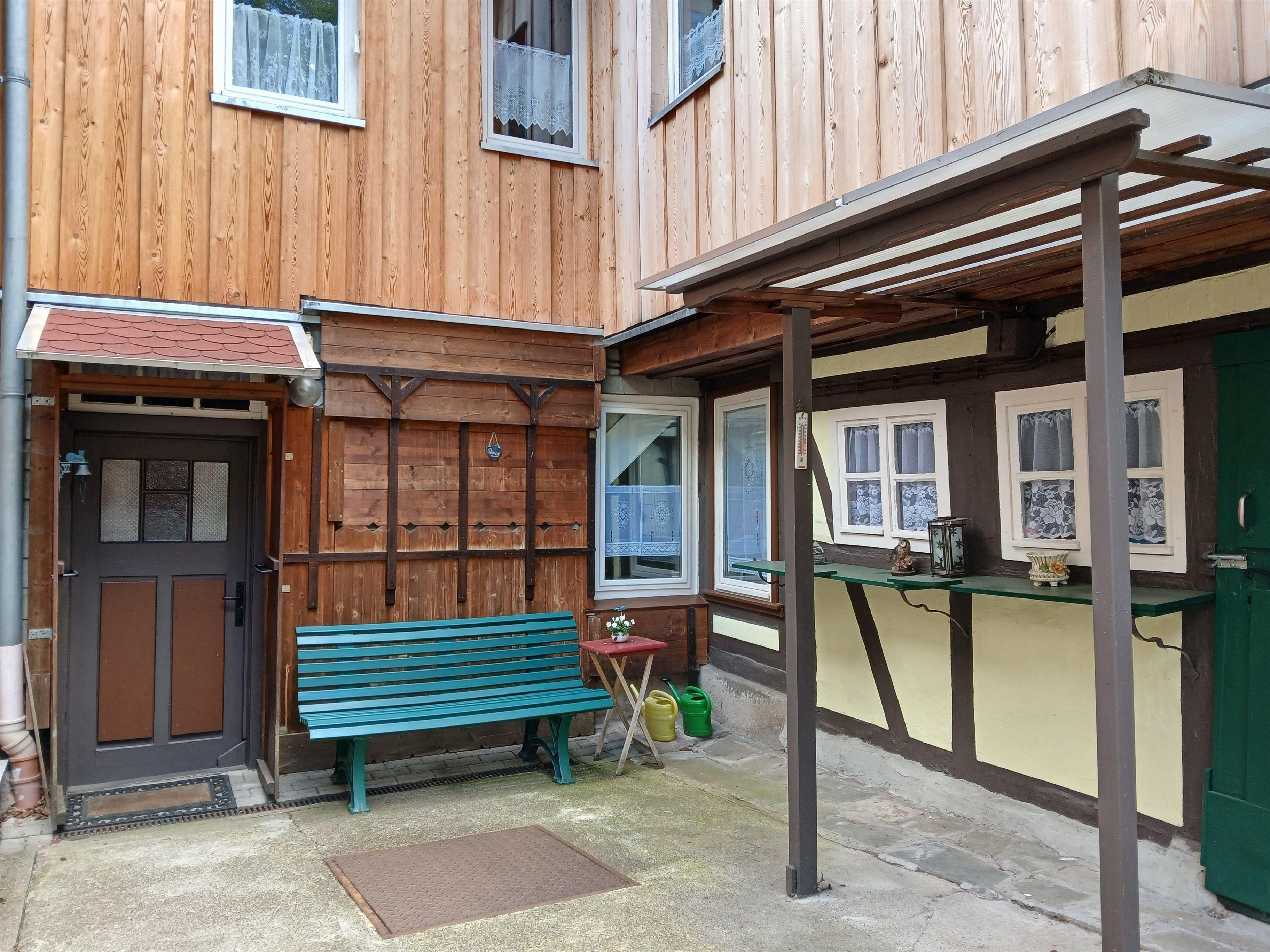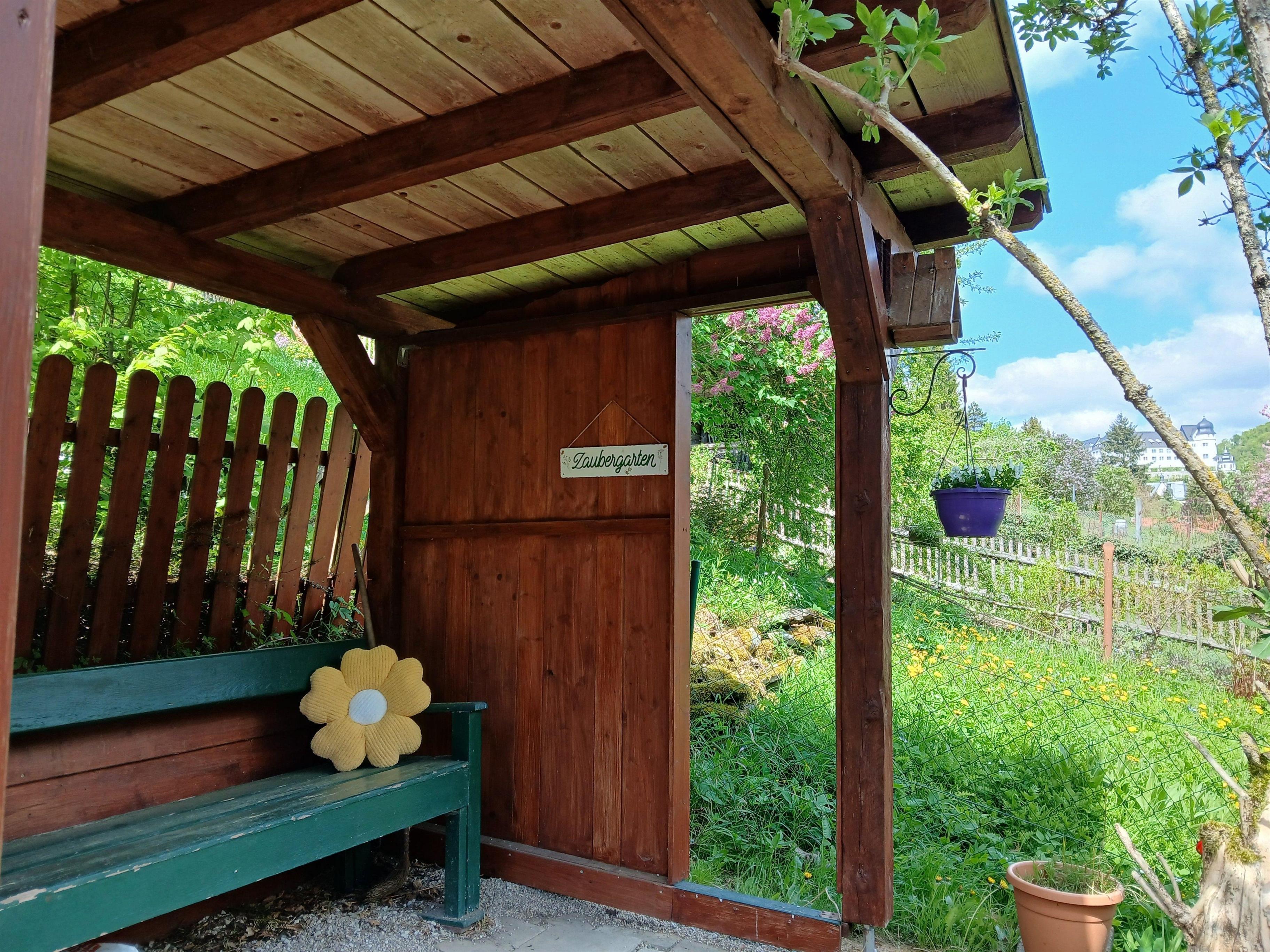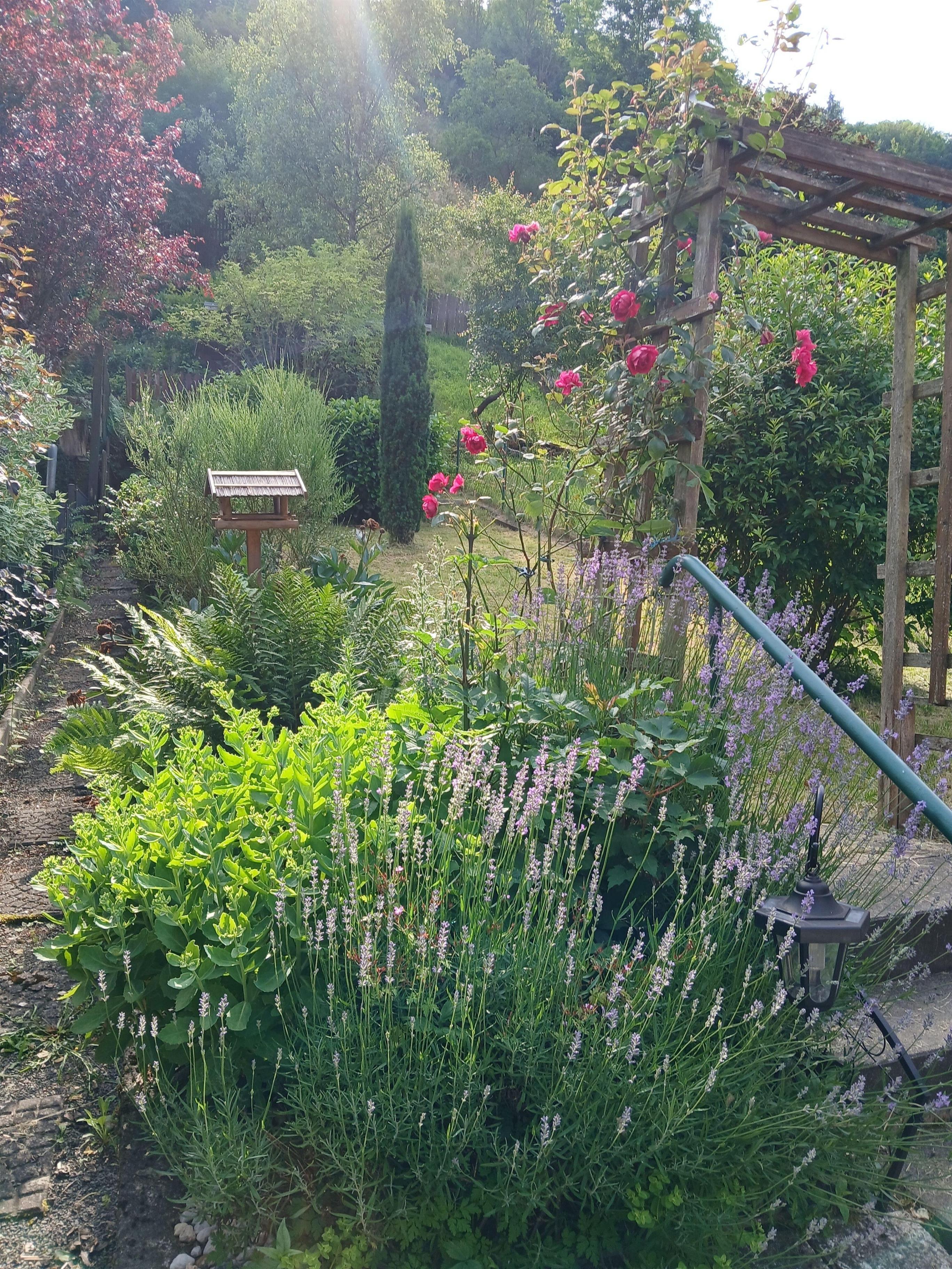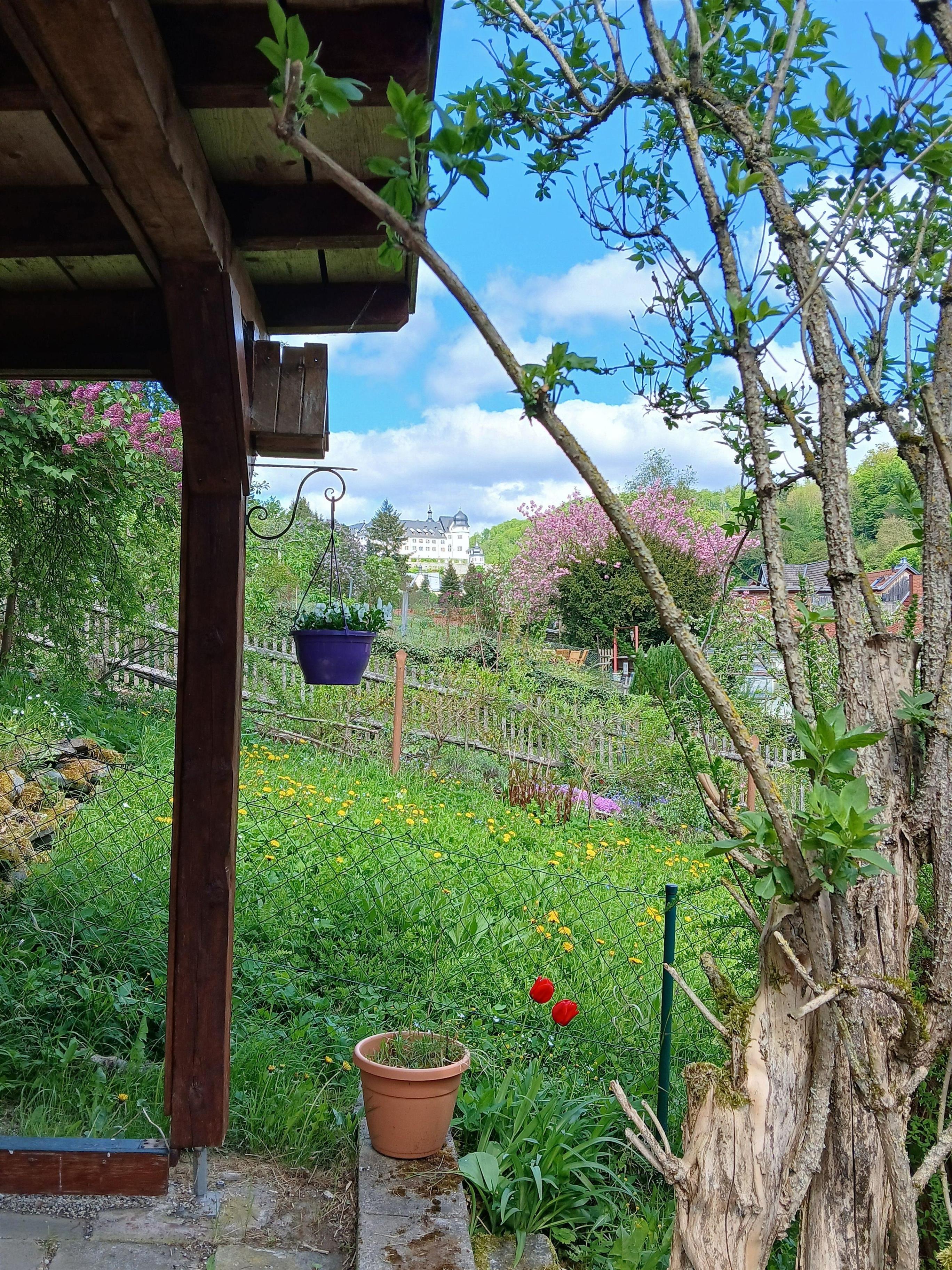Der Garten und die Dachterrasse laden zum Entspannen ein. Es gibt mehrere Sitzmöglichkeiten. Besonderes Highlight ist die Sonnendachterrasse mit Blick zum Schloß und zur Himmelsleiter. Gartenmöbel sind ausreichend vorhanden. Auf der unteren Terrasse steht eine Bank bereit. Am Ende des Gartens gibt es noch ein wunderschönes, überdachtes und geschütztes Plätzchen, ebenfalls mit Schlossblick. Ein rotes Gartenhäuschen, Blumen, Rosen und Lavendel werden Sie verzaubern.