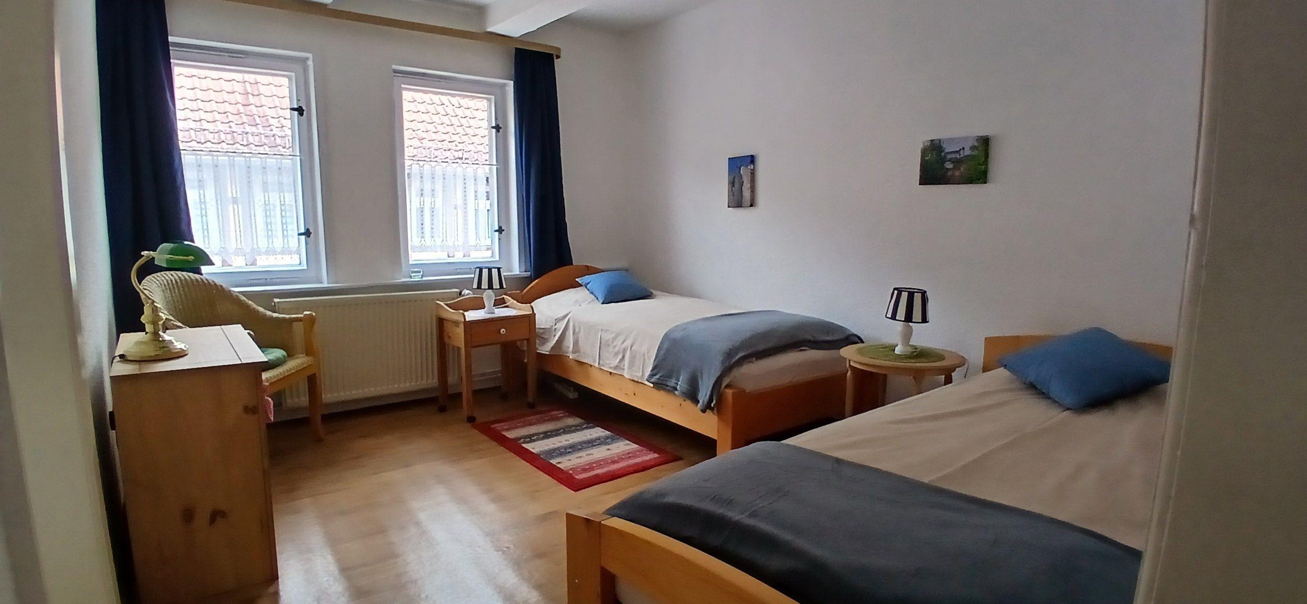 Eine schöne Holztreppe führt in das Obergeschoss, wo sich ein helles Schlafzimmer mit Doppelbett (1,60x 2,00 Meter, je zwei Kaltschaum-Einzelmatratzen mit Topper), Kleiderschrank, Bauernkommode und Korbstuhl befinden. Das zweite Schlafzimmer bietet zwei Einzelbetten ( 90x 2,00 Meter) mit ebenfalls neuen Kaltschaummatratzen, Kommode und Korbstuhl. Beide Schlafzimmer haben Verdunkelungsvorhänge und sind durch eine Tür miteinander verbunden.