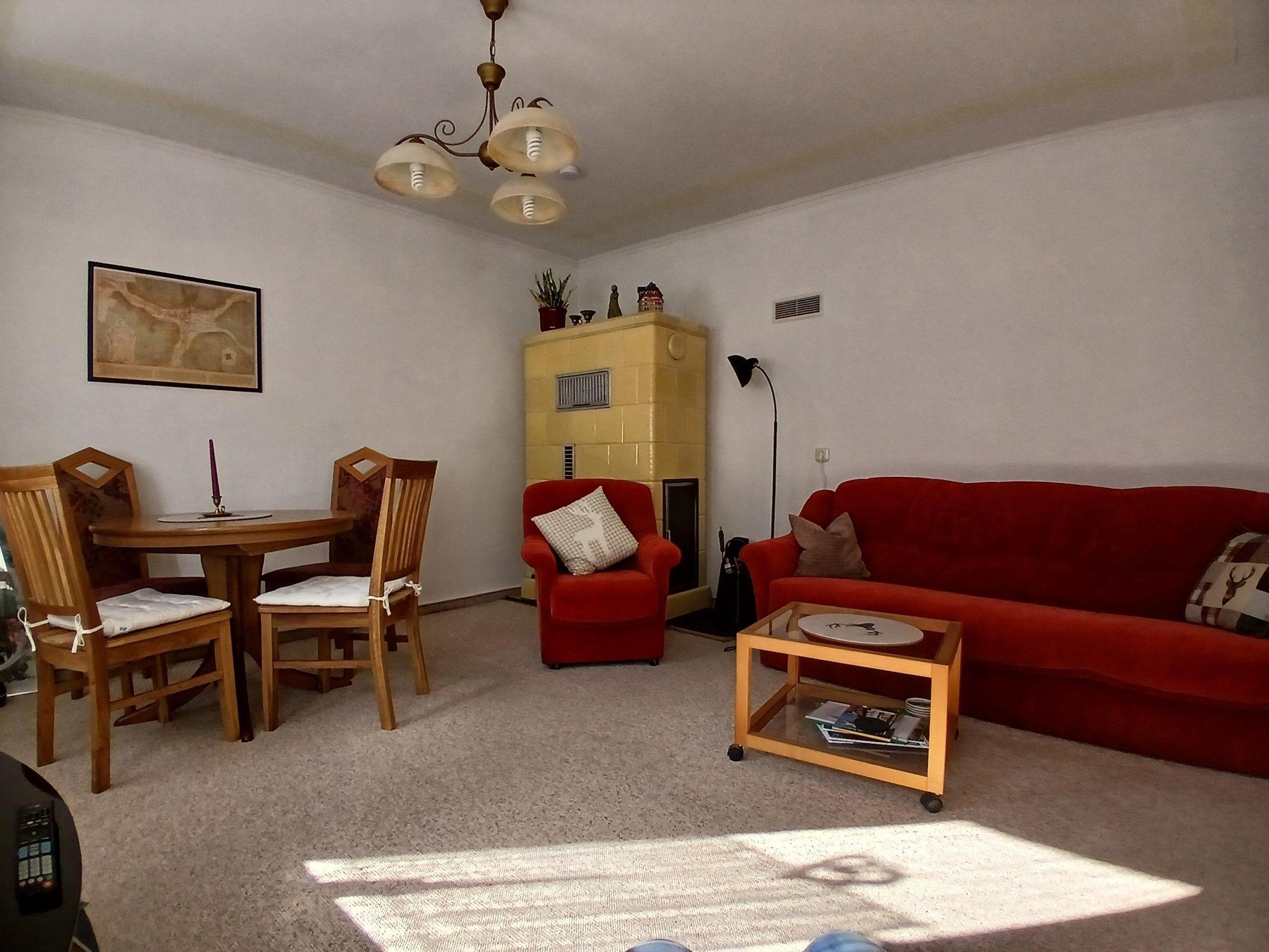Im Erdgeschoss des frisch renovierten Ferienhauses befindet sich eine große Diele mit Bauernschrank und Zugang zum Garten. Ein gemütliches, helles Wohnzimmer mit 3-Sofa (aufklappbar), 2 Sesseln, Tisch, Essecke mit 4 Stühlen, Kachelofen, Fernseher und DVD-Player sowie einem Bücherregal finden Sie dort ebenfalls.