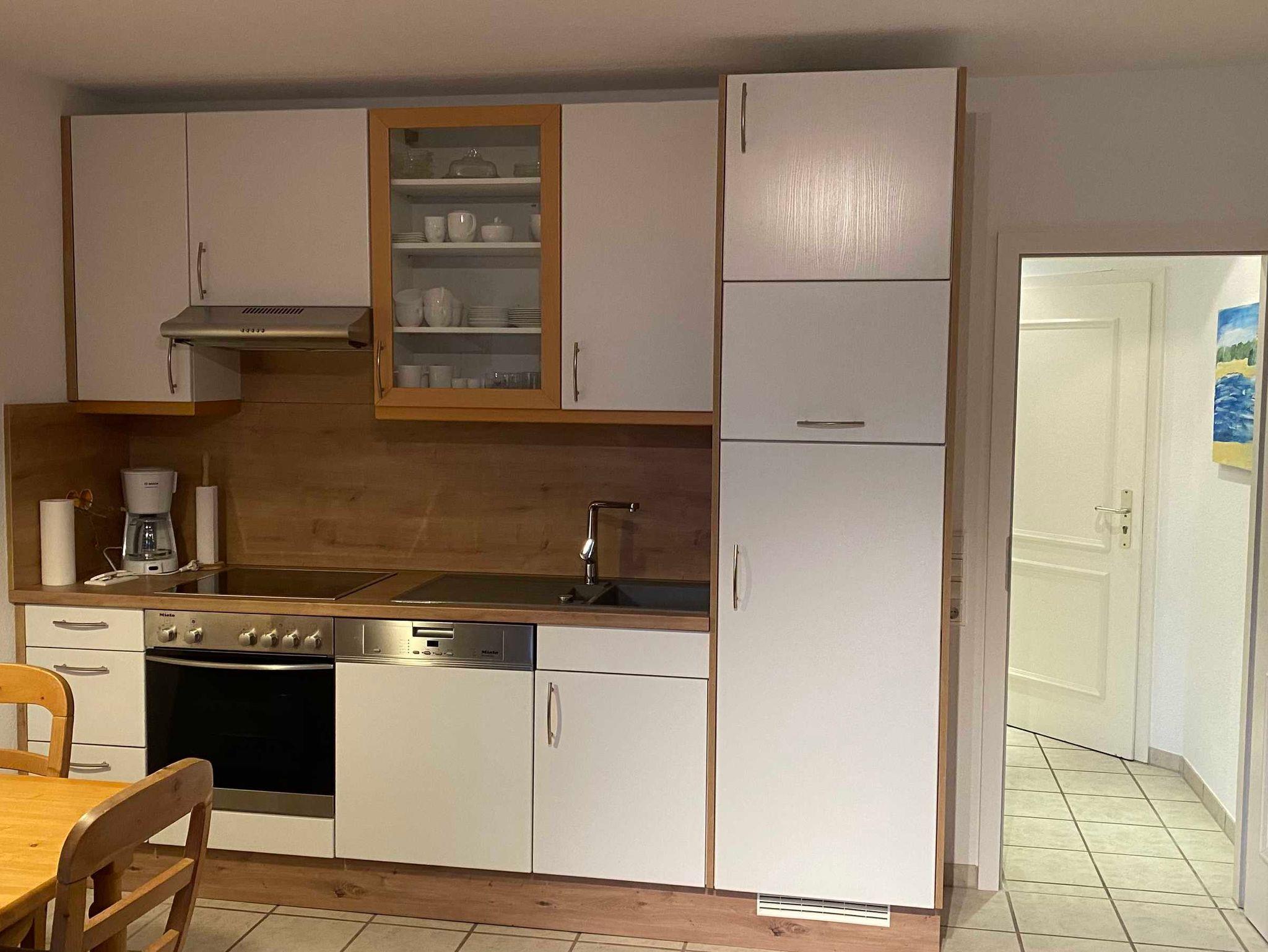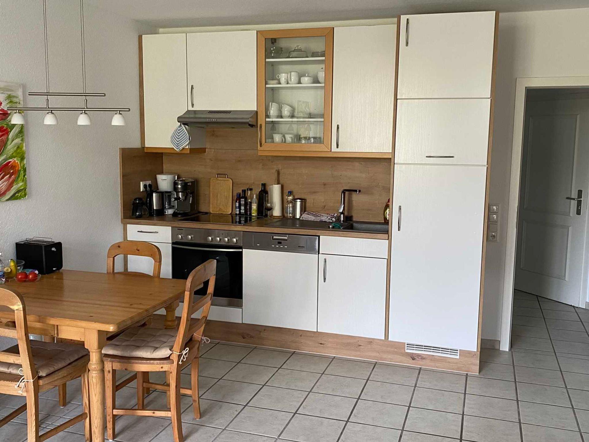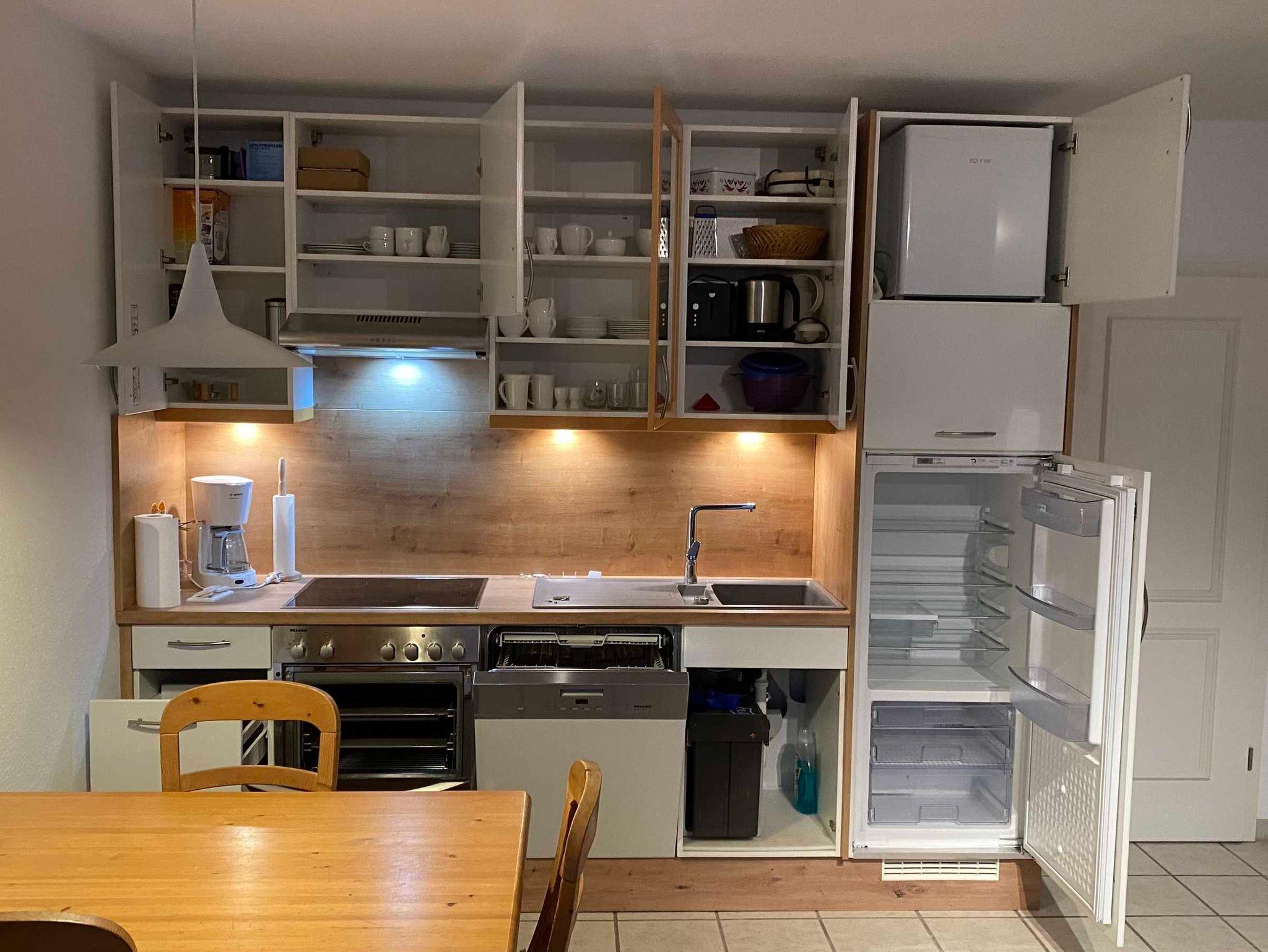 Wir haben unsere Küchenzeile 2022 erneuert und vergrößert, Geschirrspülautomat, Backofen, Kühl- und Gefrierschrank, Mikrowelle und Würstchenelektrogrill sind vorhanden.