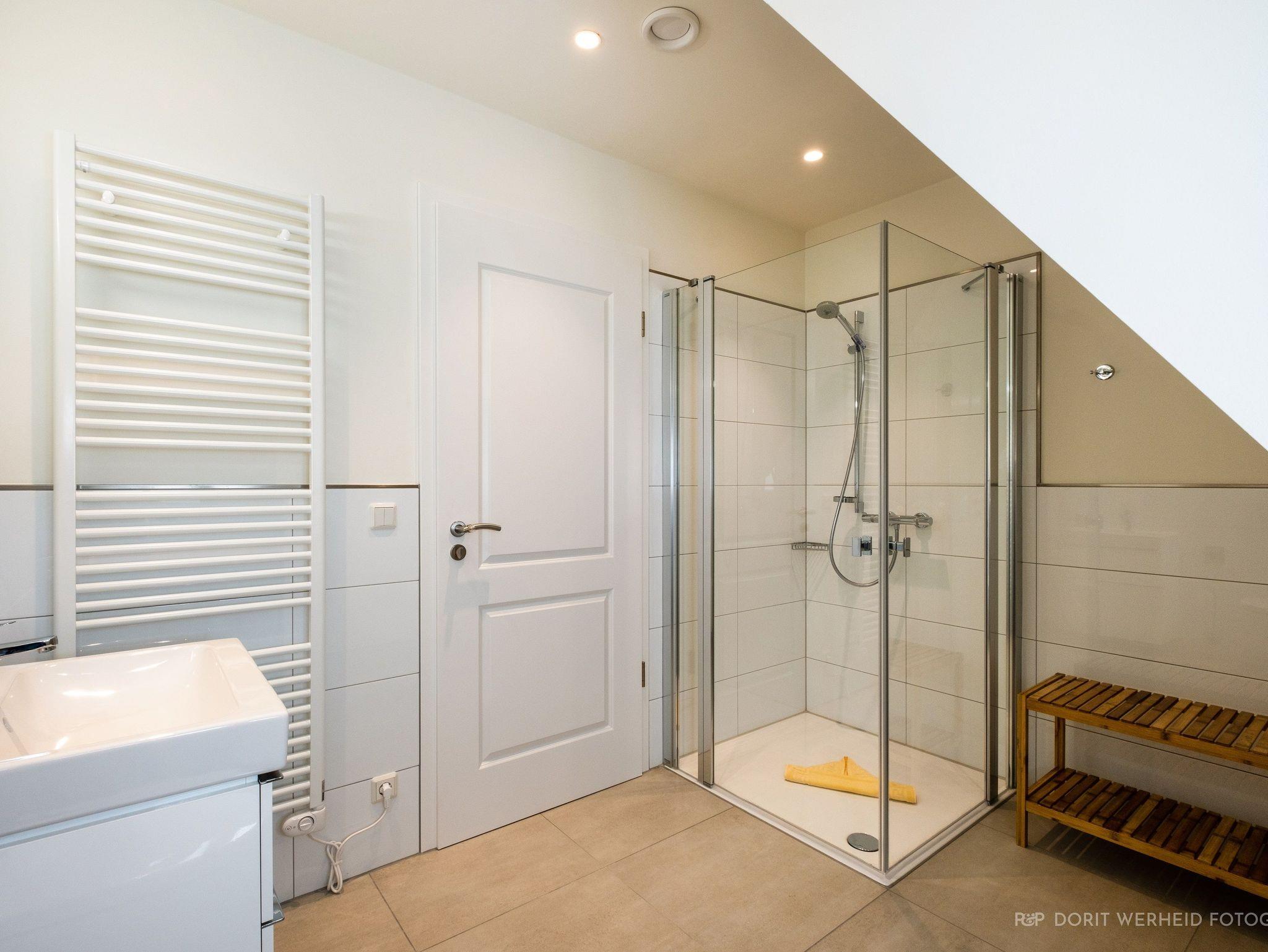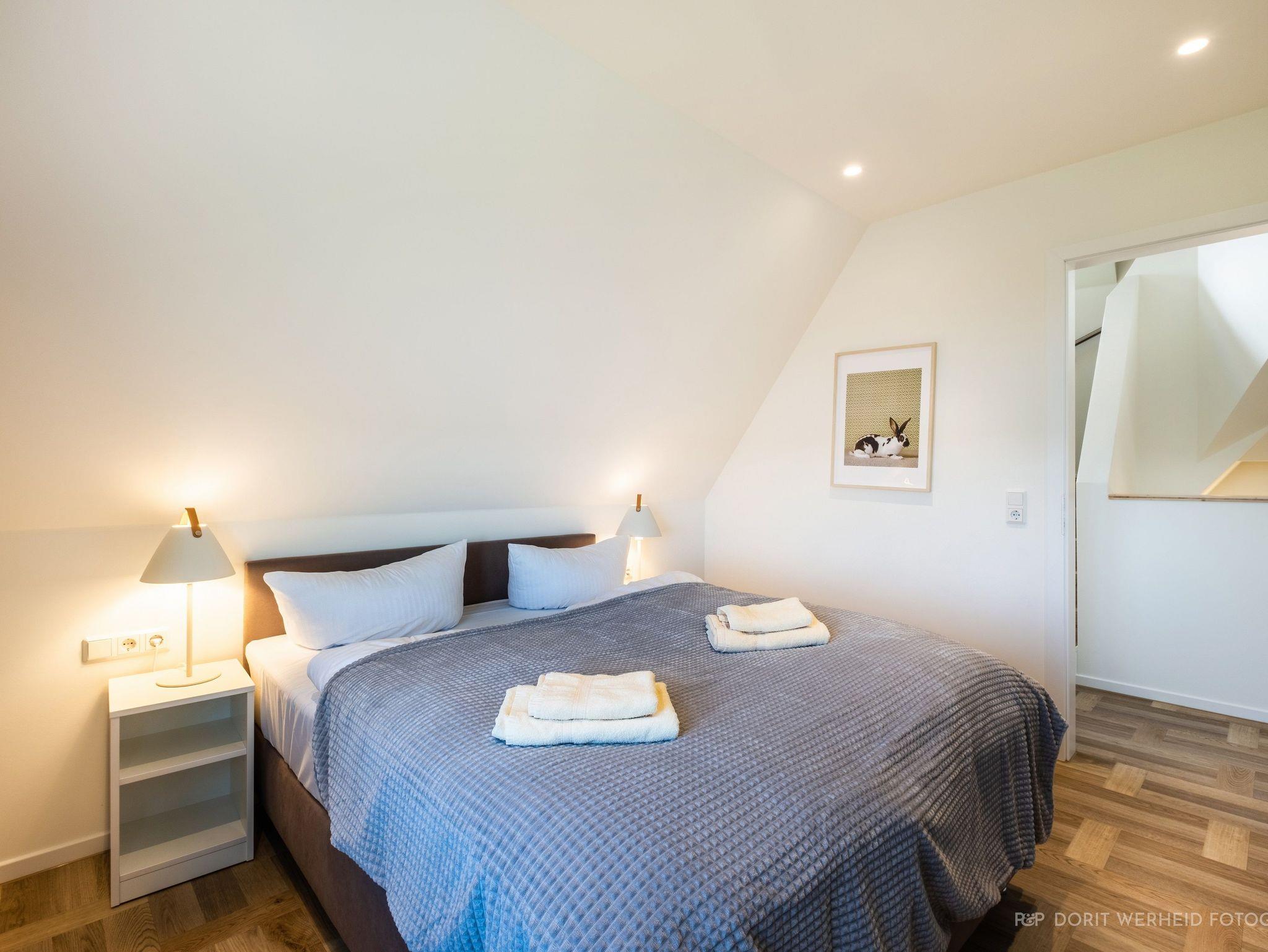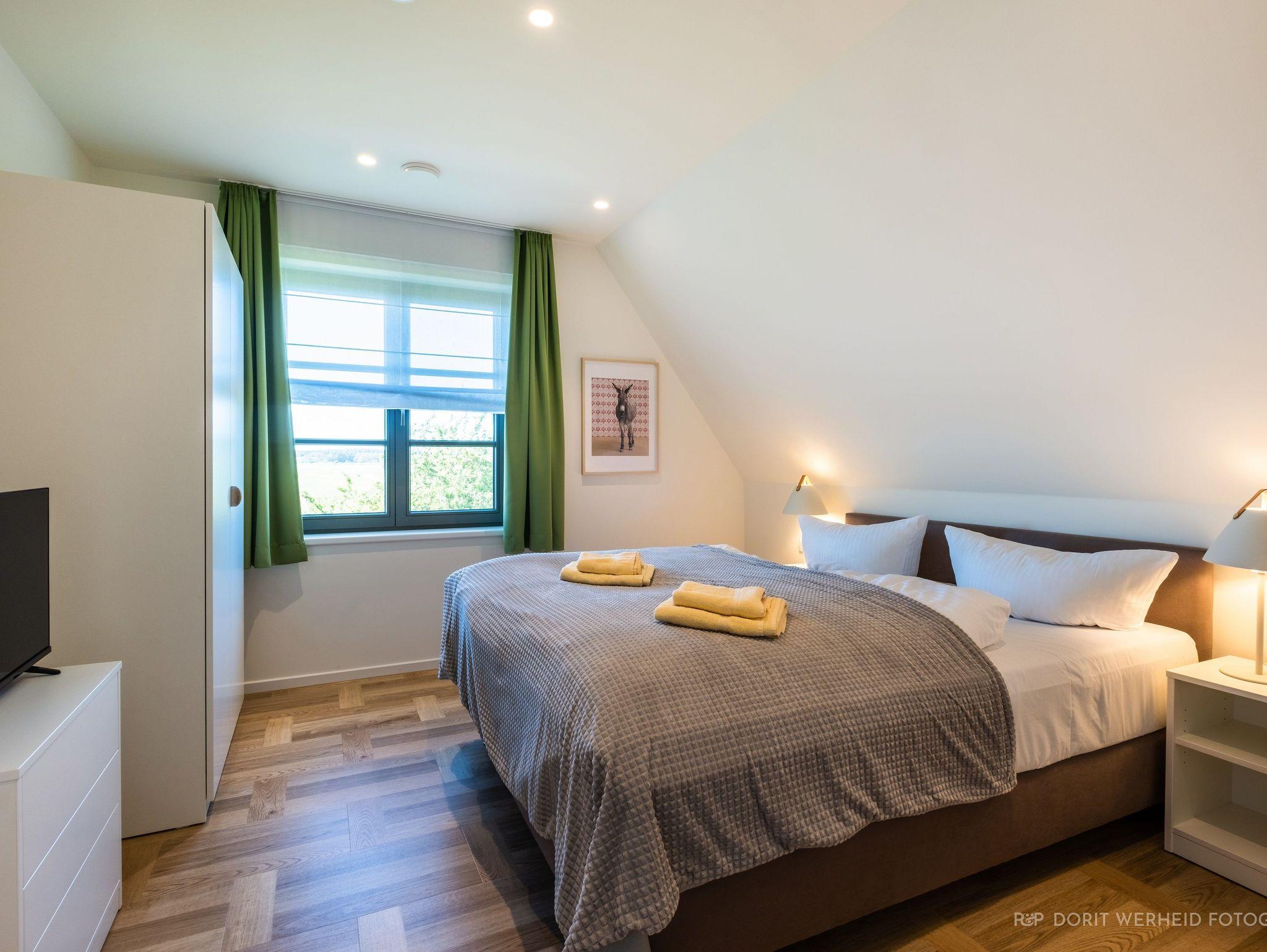 Im Obergeschoss befinden sich drei weitere Schlafzimmer mit TV sowie zwei Bäder. Alle Schlafzimmer verfügen über ein Doppelbett (Boxspringbett 1x 1,80m & 2x 1,60m). Das Master- Schlafzimmer verfügt über ein Badezimmer en Suite mit Waschbecken, WC und bodentiefer Dusche. Das andere Badezimmer verfügt ebenfalls über ein Waschbecken, WC, bodentiefe Dusche und zusätzlich über einen Waschtrockner. Ein Fön steht Ihnen ebenfalls zur Verfügung. Die Schlafzimmer sind zudem verdunkelbar.