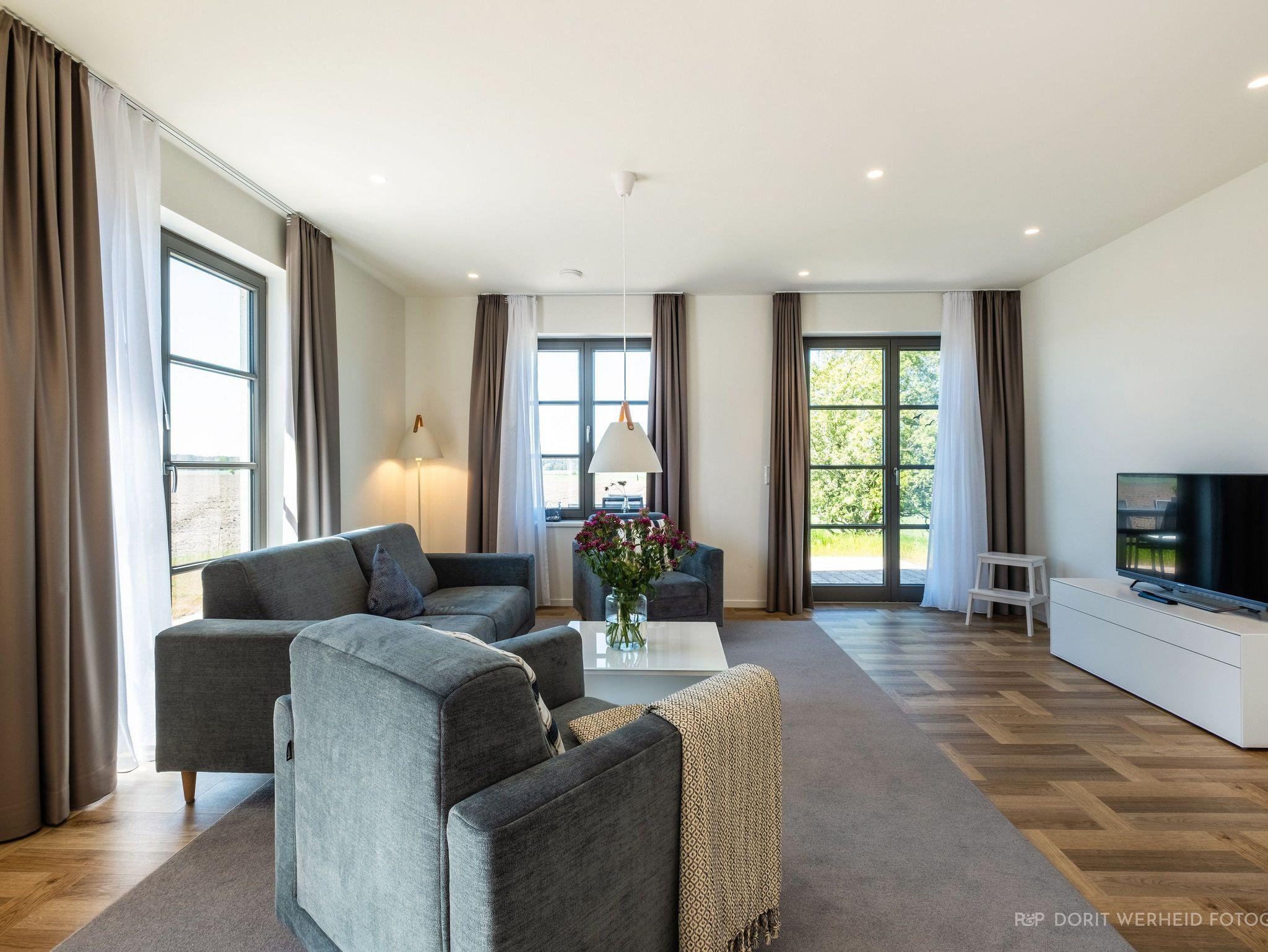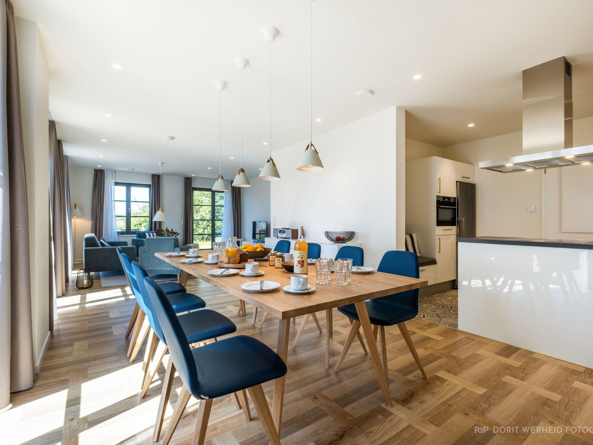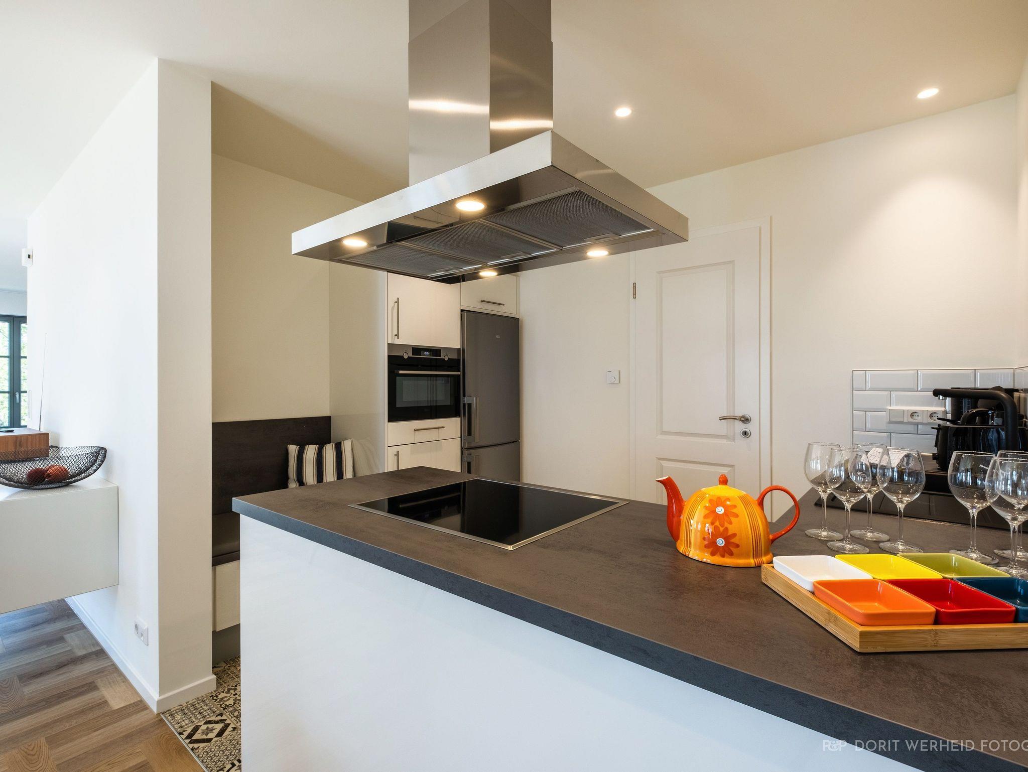 Willkommen im Ferienhaus Leonard Bernstein! Das 163 m² große Ferienhaus auf 3 Etagen ist für max. 8 Erwachsene und 1 Kind (bis 3 Jahre) geeignet und stilvoll-modern ausgestattet. Es verfügt über eine Wohnküche mit angrenzenden Terrassen, 4 Schlafzimmer, 3 Badezimmer und eine Fasssauna.