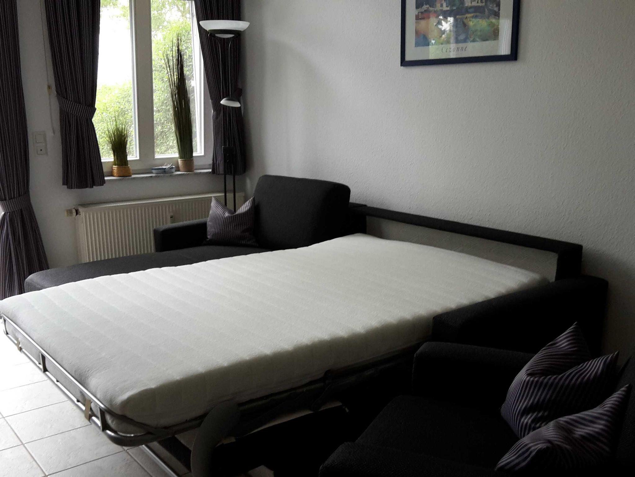 Die Zwei-Zimmer-Wohnung ist mit massiven Landhausmöbeln ausgestattet. Im Wohnzimmer kann man es sich auf der ausziehbaren Couch gemütlich machen. Dabei sorgen ein großer Flachbild-TV mit Sat-Anschluss und eine Stereoanlage für Unterhaltung. Im Zimmer integriert befindet sich eine Küchenzeile mit Esstisch und 4 Stühlen.