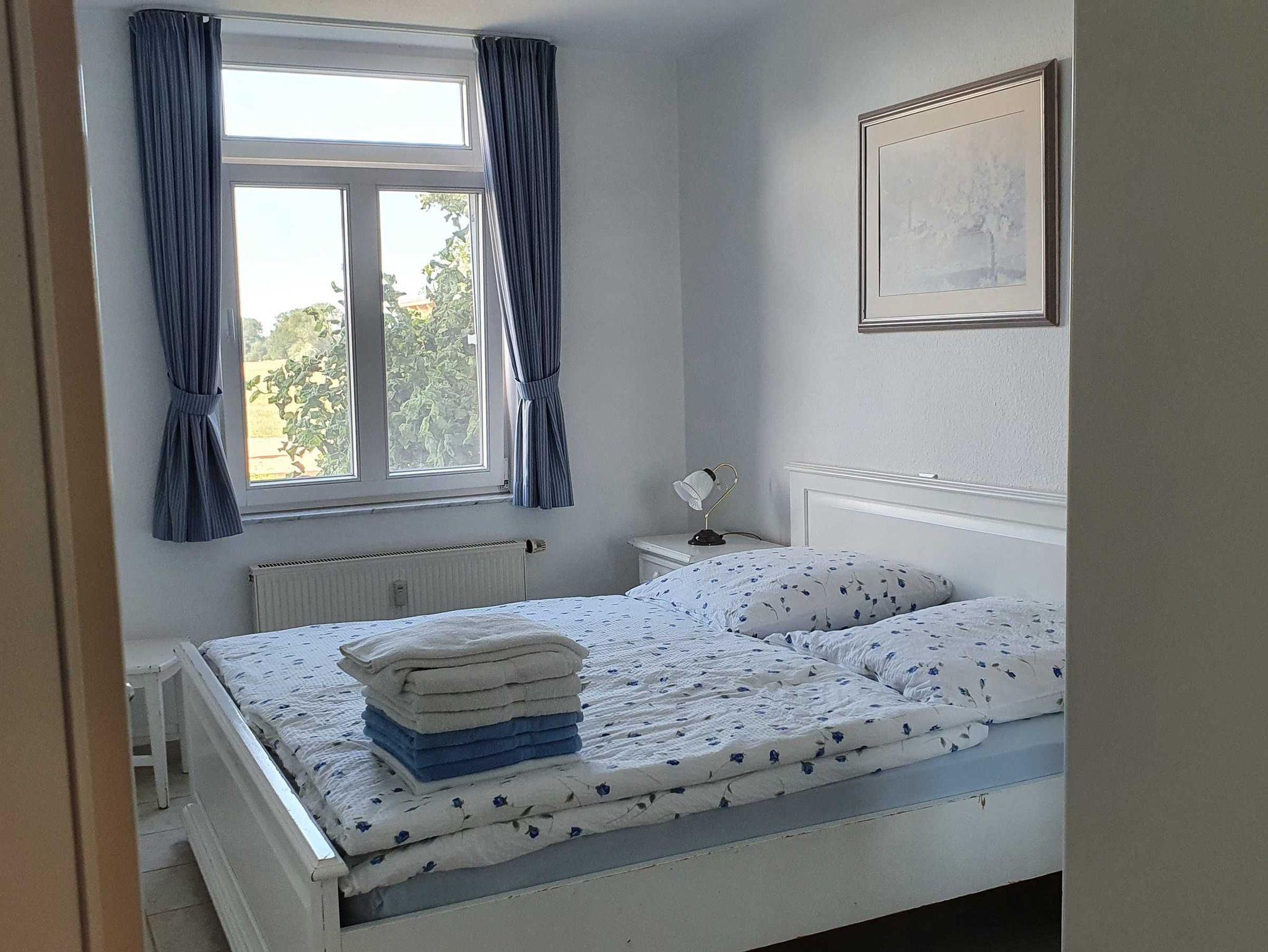 Das Schlafzimmer besitzt als Möblierung ein Doppelbett mit Nachttischen und Wäscheschrank.