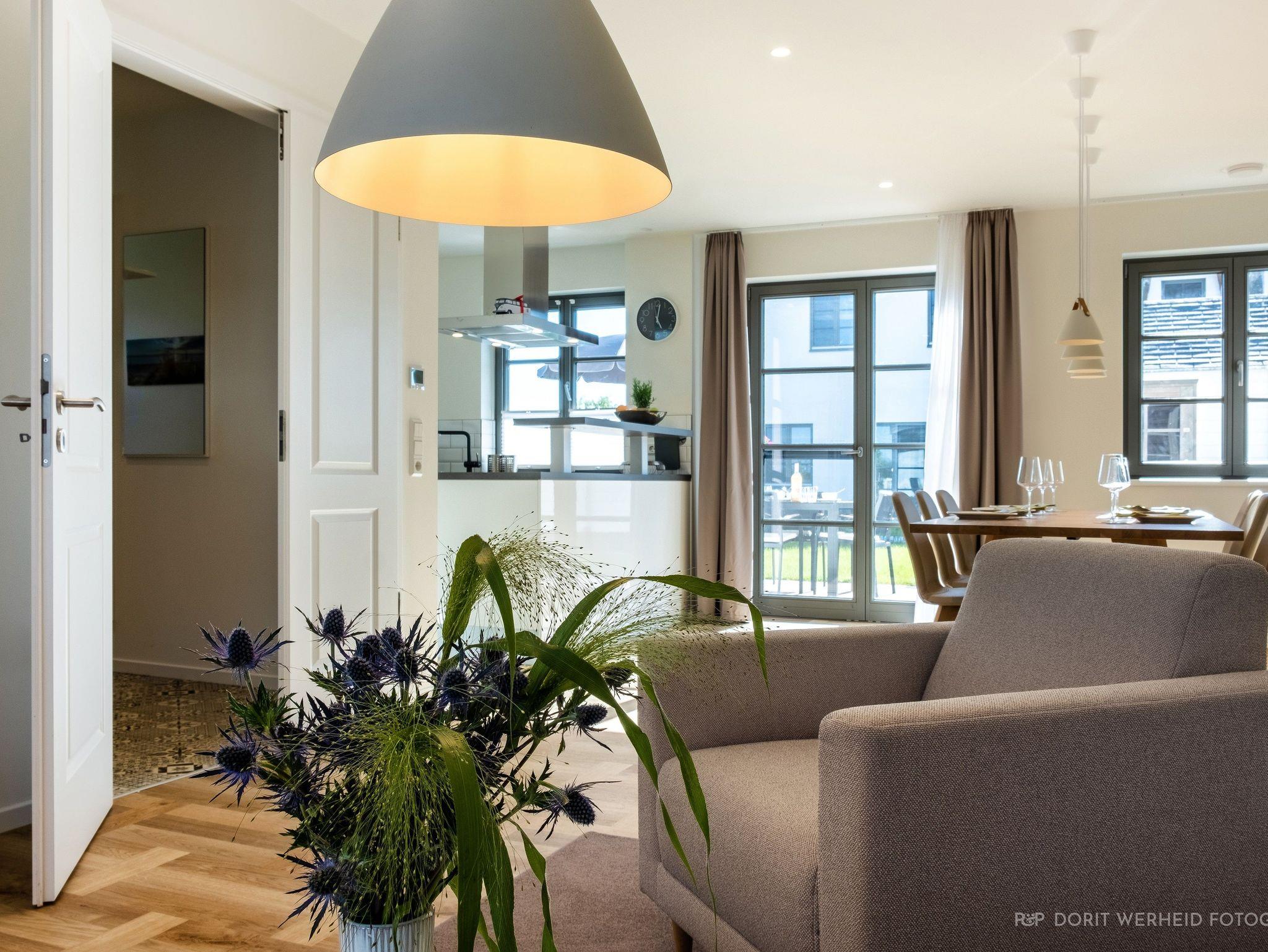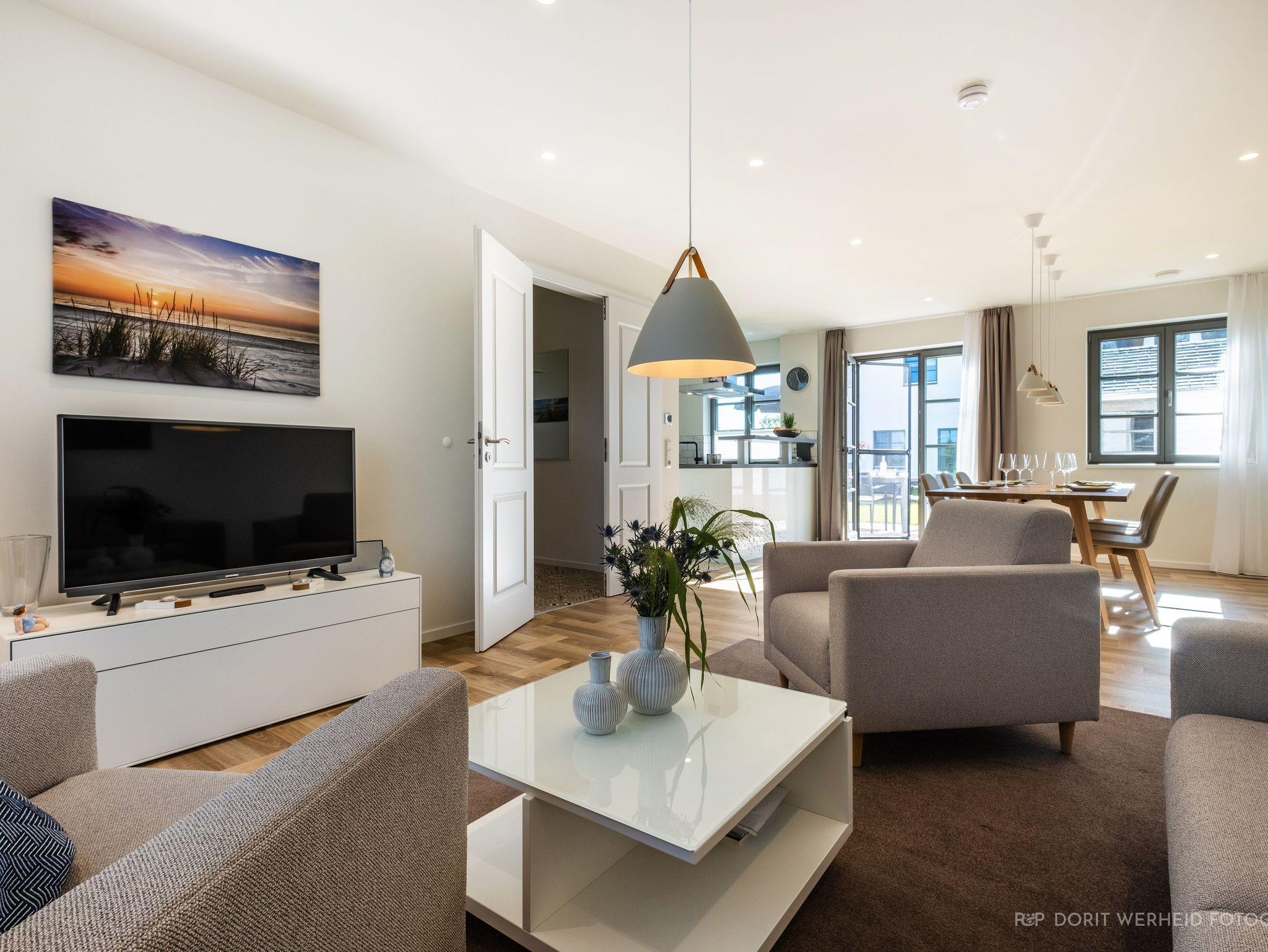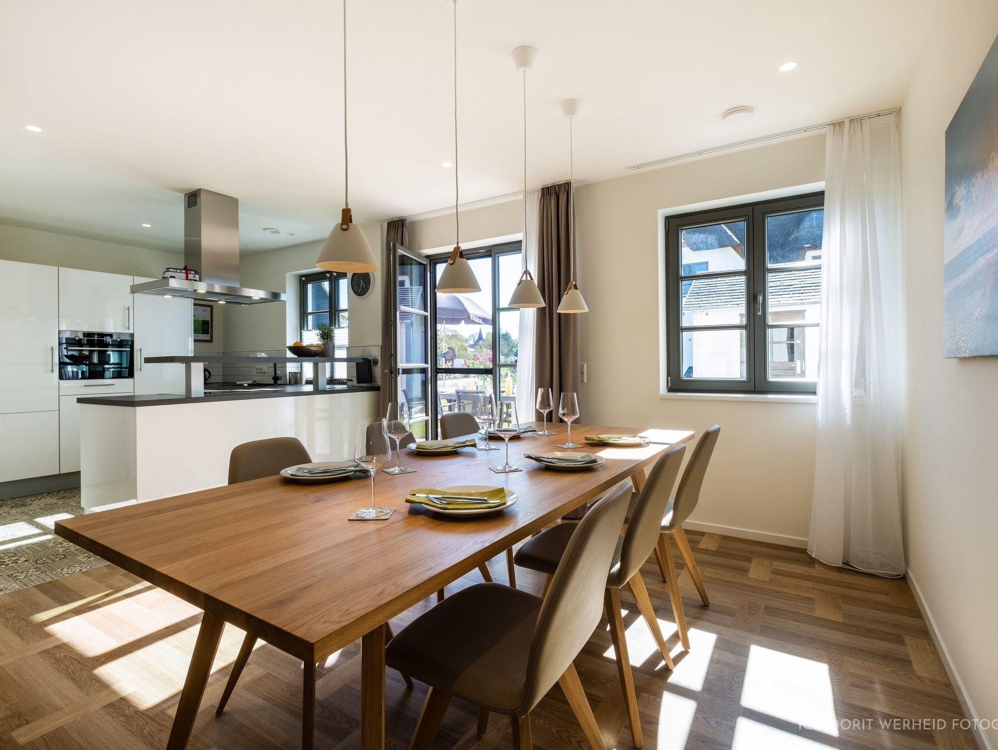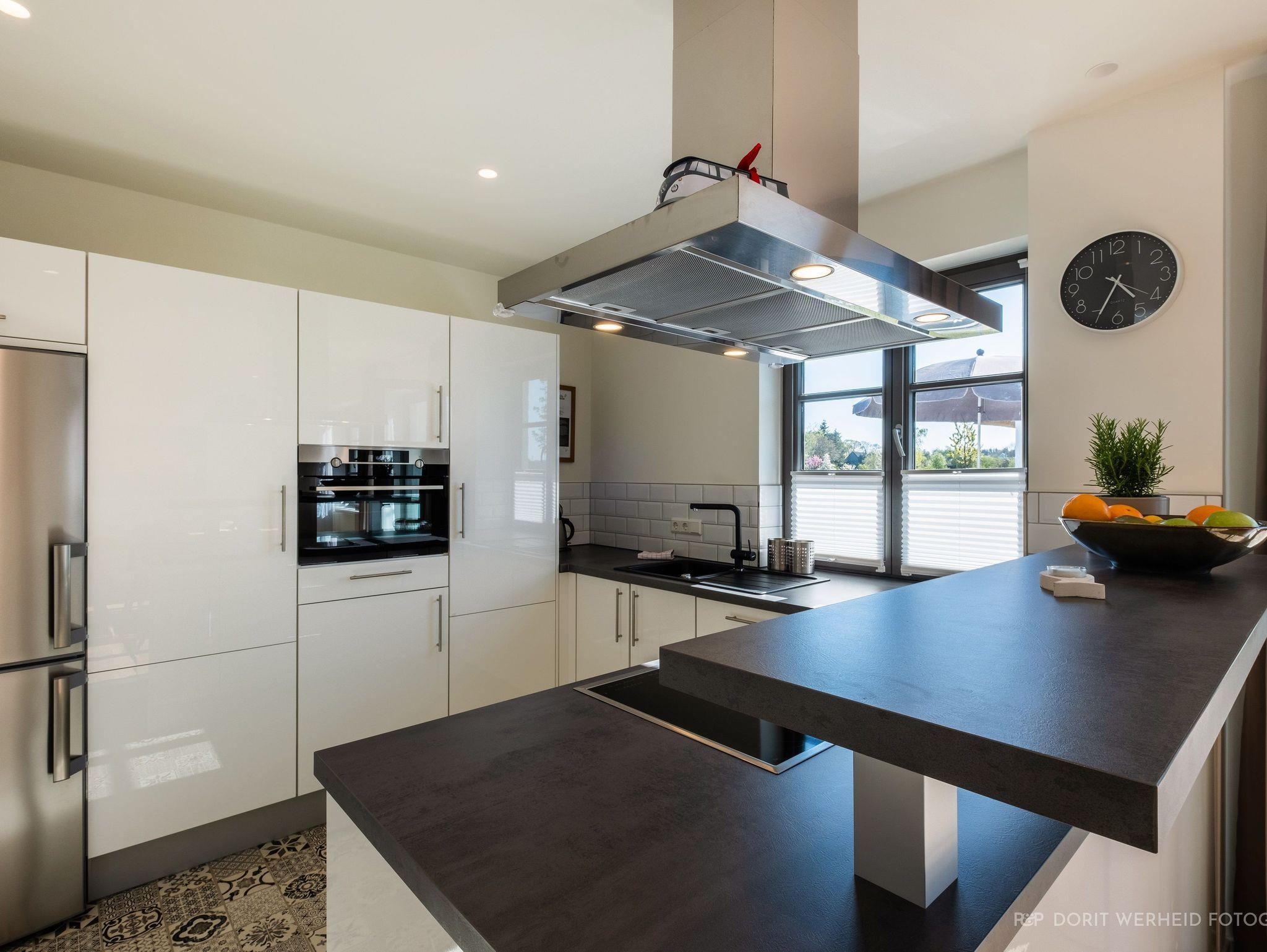 Die komplett eingerichtete Wohnküche verfügt über Spülmaschine, Mikrowelle, Induktionsherd und großem Kühlschrank mit separatem Gefrierfach sowie Kaffeemaschine, Wasserkocher und Toaster. Ein Esstisch für 6 Personen sowie eine gemütliche Wohnlandschaft mit Flachbild-TV und Musikanlage.