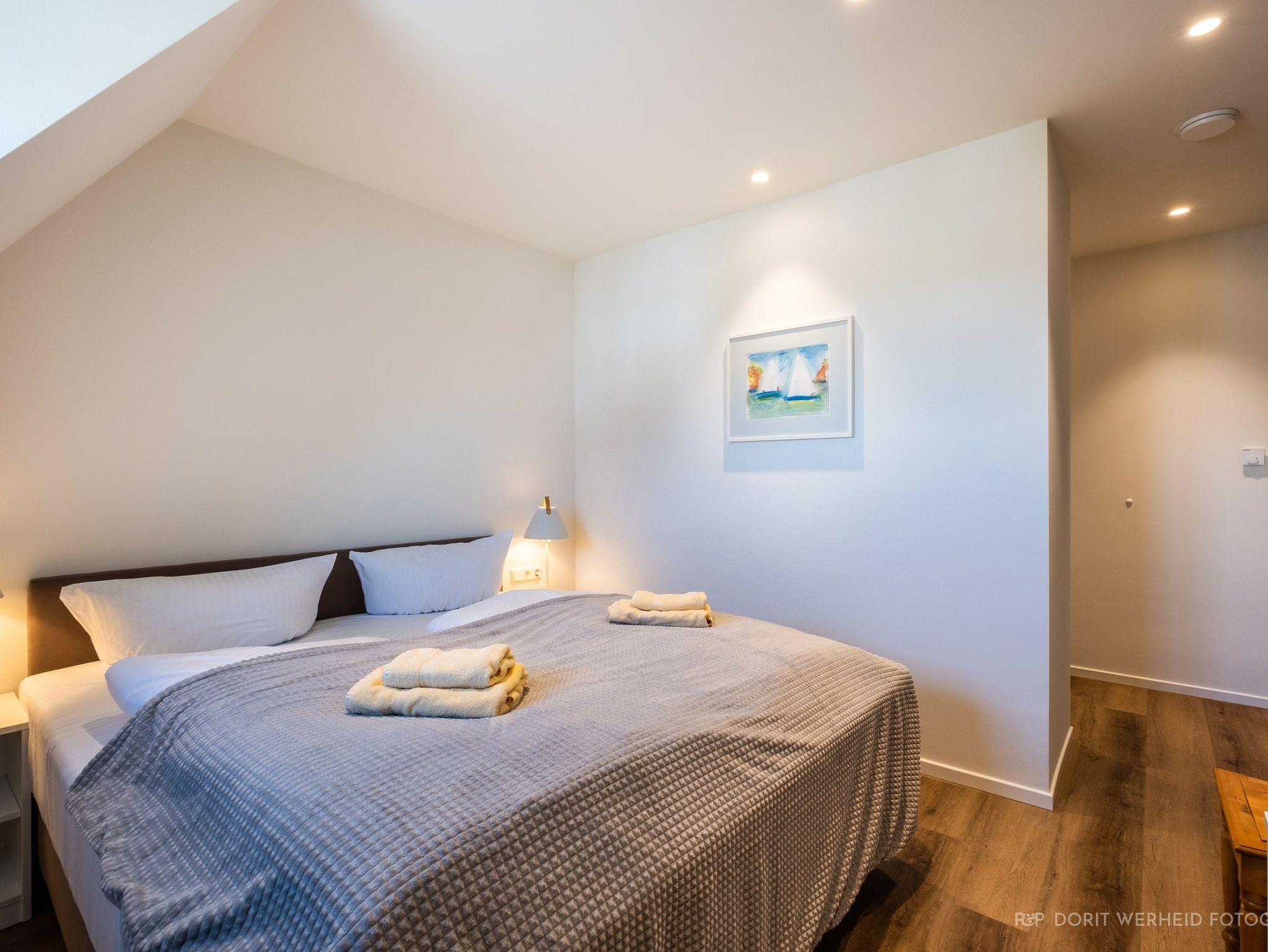 Im Obergeschoss befinden sich die drei Schlafzimmer mit TV sowie zwei Bäder. Alle Schlafzimmer verfügen über ein 1,80 x 2,00m Boxspringdoppelbett. Das Master- Schlafzimmer verfügt über ein Badezimmer en Suite mit Waschbecken, WC und bodentiefer Dusche. Das andere Badezimmer verfügt ebenfalls über ein Waschbecken, WC, bodentiefe Dusche und zusätzlich über einen Waschtrockner. Ein Fön steht Ihnen ebenfalls zur Verfügung.