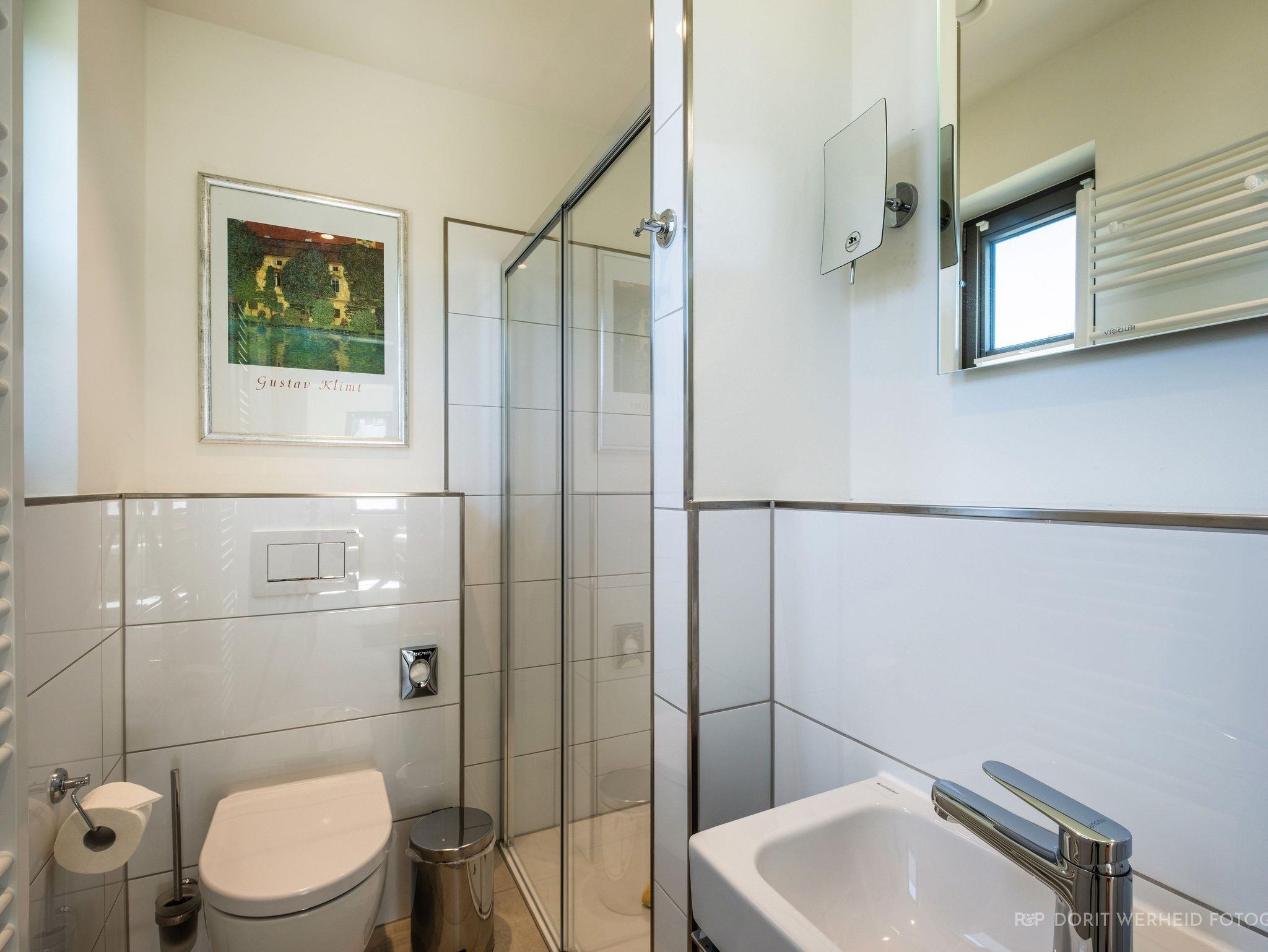 Ein separater Raum mit einer finnischen Sauna für 4 Personen lädt zum Entspannen ein. Zusätzlich gibt es einen Ruhebereich, um die Seele baumeln zu lassen. Gegenüber befindet sich das kleine Badezimmer mit Waschbecken, WC und bodentiefer Dusche.