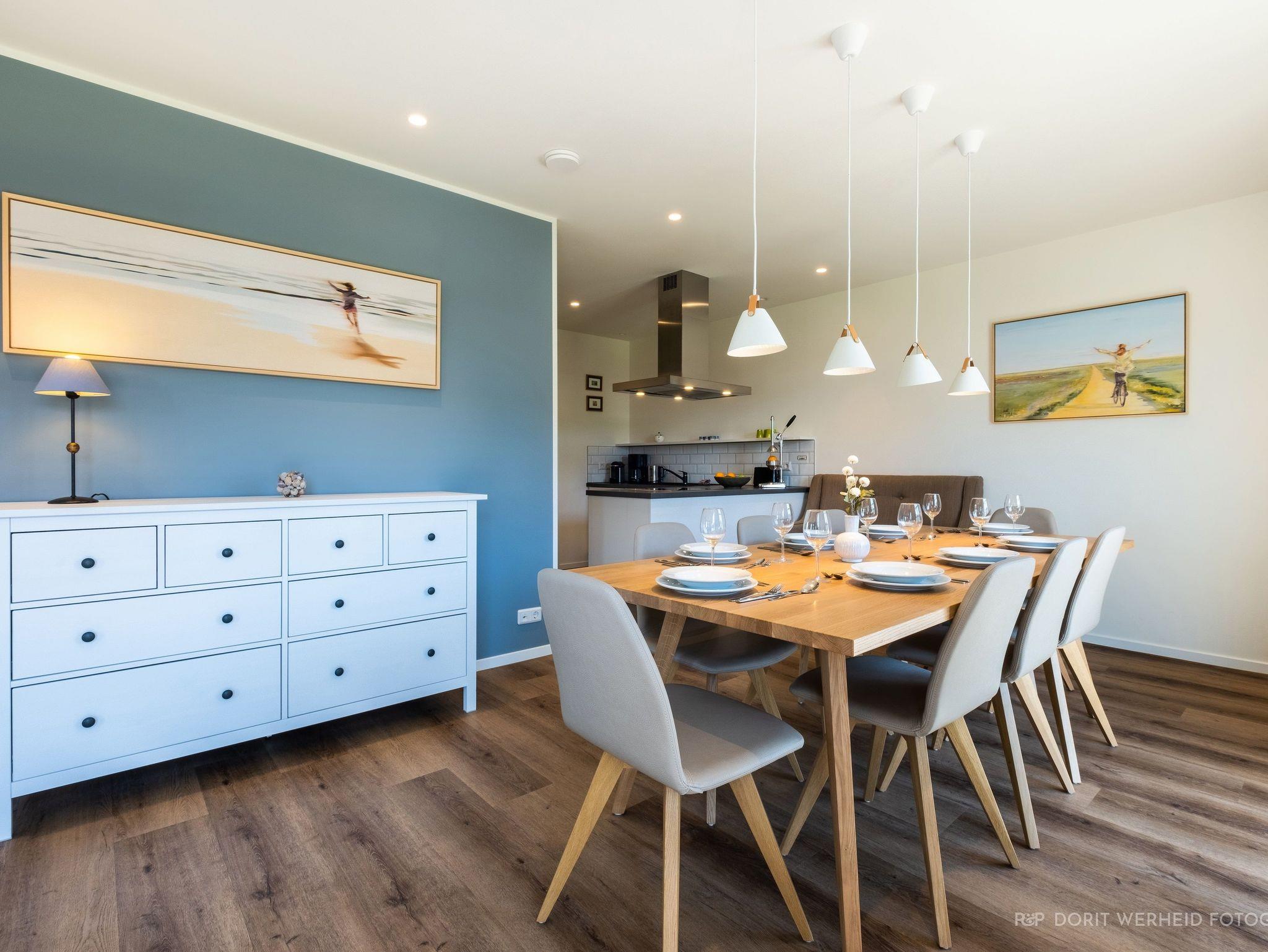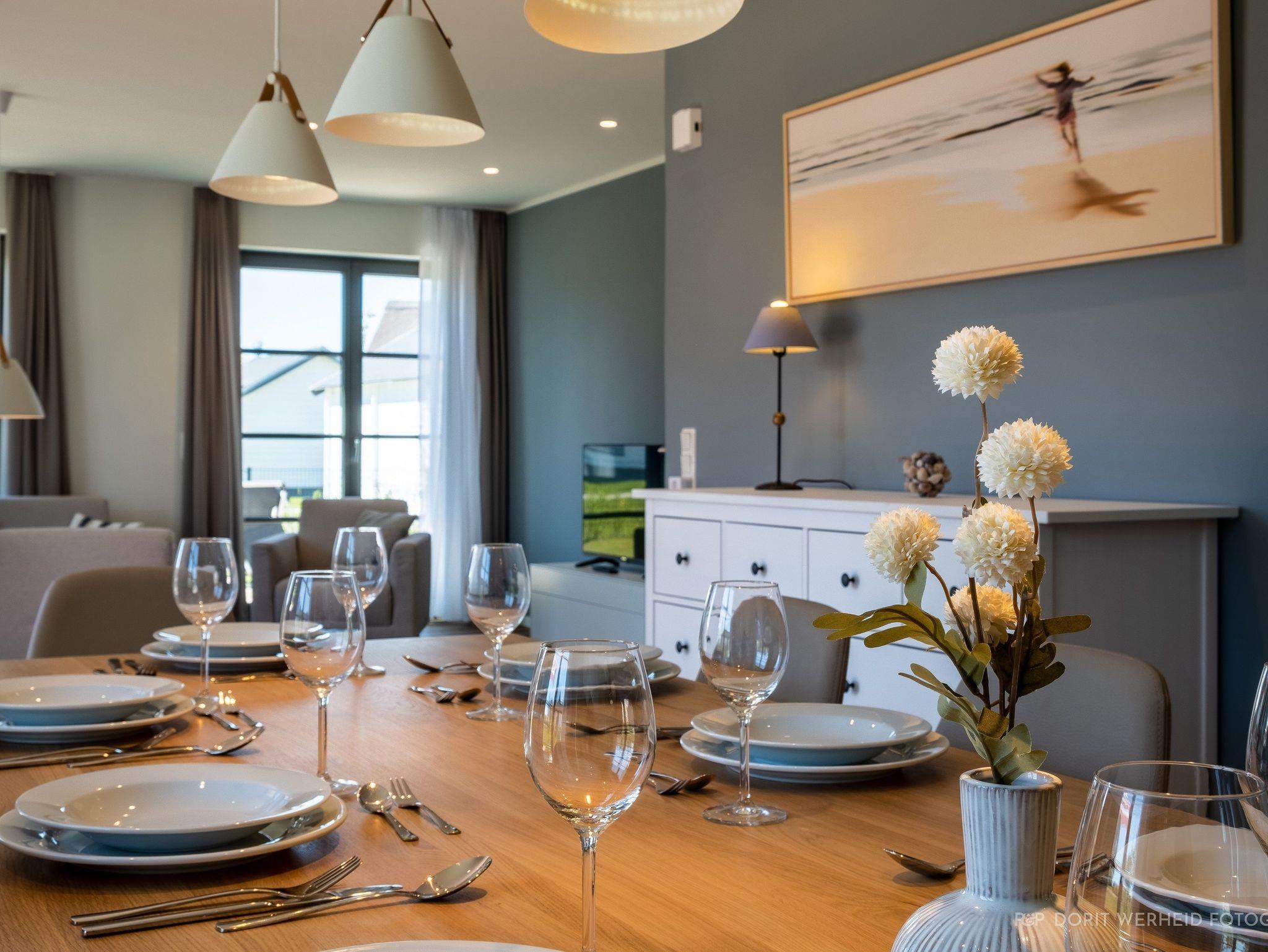 Der großzügige Wohnraum lädt zum Verweilen ein. Hier findest du ein bequemes 3-Sitzer-Sofa, einen Flachbild-TV für entspannte Abende und einen Esstisch, der Platz für bis zu 8 Personen bietet, perfekt für gemeinsame Mahlzeiten und gesellige Stunden. Die moderne Küche ist offen gestaltet und verfügt über ein Cerankochfeld, Backofen, einen Kombi-Gefrierschrank, eine Spülmaschine, eine Kapsel-Kaffeemaschine, Mikrowelle, Wasserkocher, Toaster und vieles mehr. Von dem Wohnbereich gelangen Sie auf die zwei möblierten Terrassen in südwestlicher Ausrichtung, sie bieten Platz zum Sonnenbaden und Relaxen. Das voll eingezäunte Grundstück sorgt für Privatsphäre und Sicherheit für Ihre Kinder und Vierbeiner.