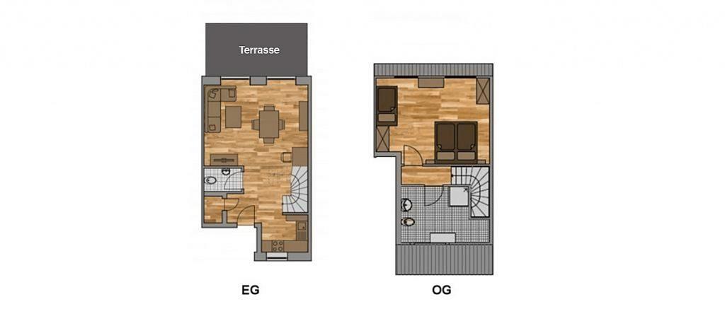 Das Appartementhaus hat im Erdgeschoss, mit Terrasse zum Schlosspark, einen großen Wohn-Essbereich mit offener Küche ( inkl. Geschirrspüler ), Tages-WC und Abstellraum.