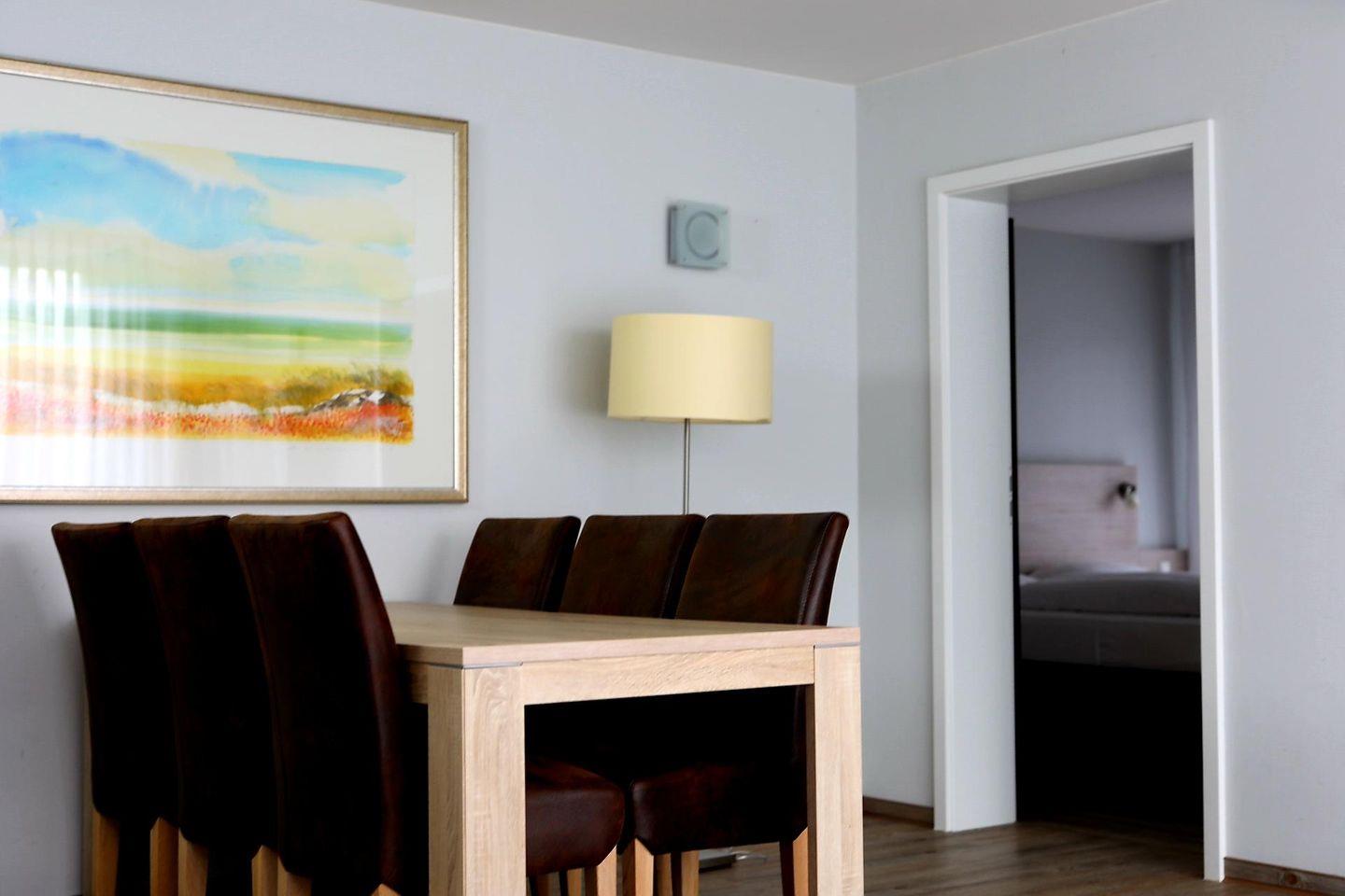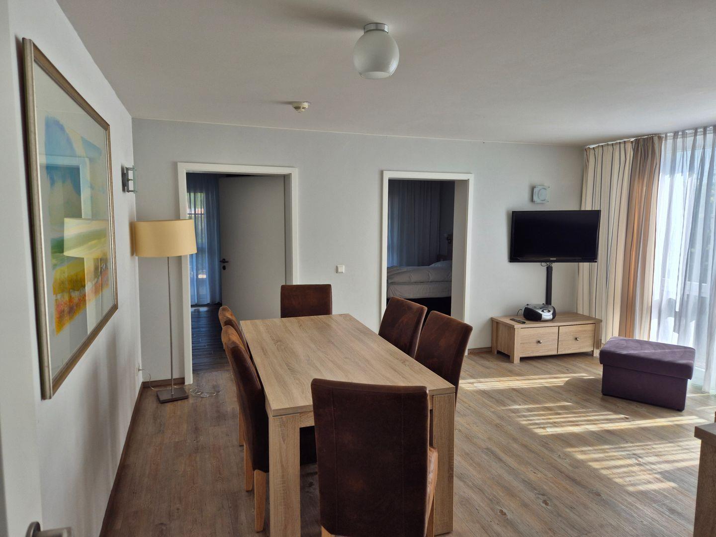 4 Zimmerappartement, 100m² für bis zu 8 Personen, 3 Schlafzimmer mit Doppelbetten, 1 Schlafcouch im Wohnbereich, separate Küche, Bad mit Dusche und Wanne, Gäste-WC, 2-Seitenterrasse z.T. überdacht Süd- West, Parkplatz, Fernseher, WLAN, behindertenfreundlich
