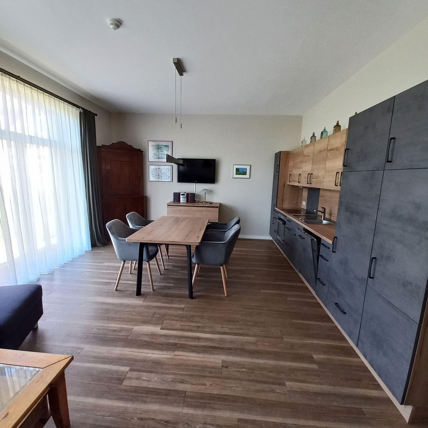 Die zum Innenhof der Remise nach Süden ausgerichtete Terrasse begehen Sie aus der gemütlich eingerichteten Wohnküche. Die moderne offene Küchenzeile ist komplett, incl. Geschirrspüler ausgestattet.